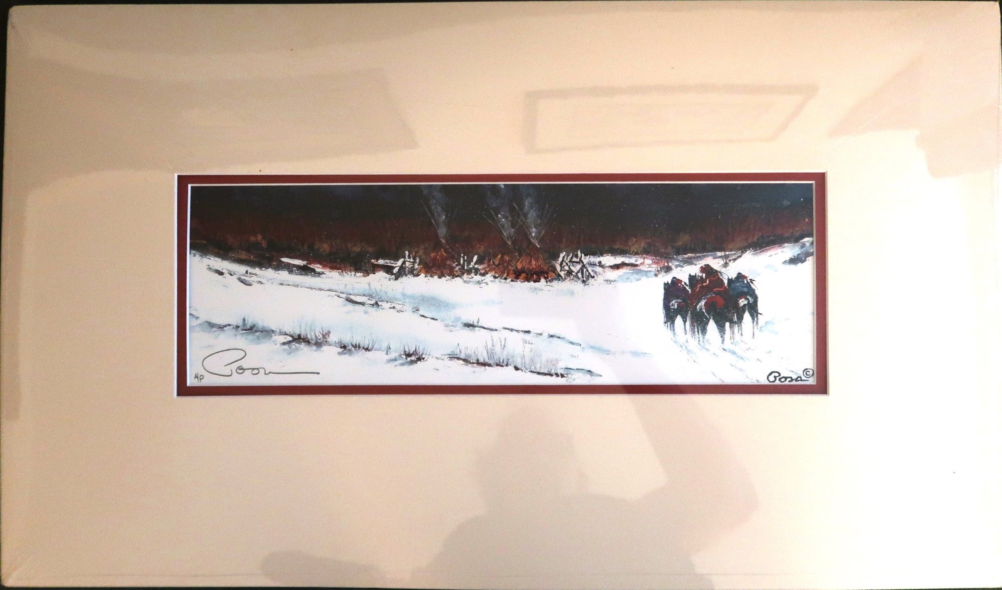 print of a Snowscape and Native American Figures on Horseback.