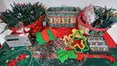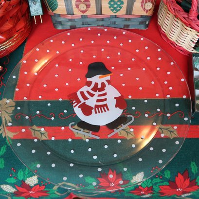 lights, snowman platter, tablecloth. cookie cutters. baskets