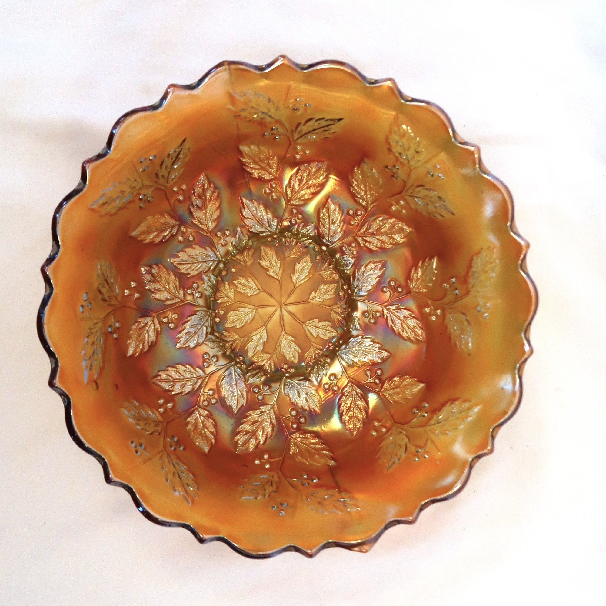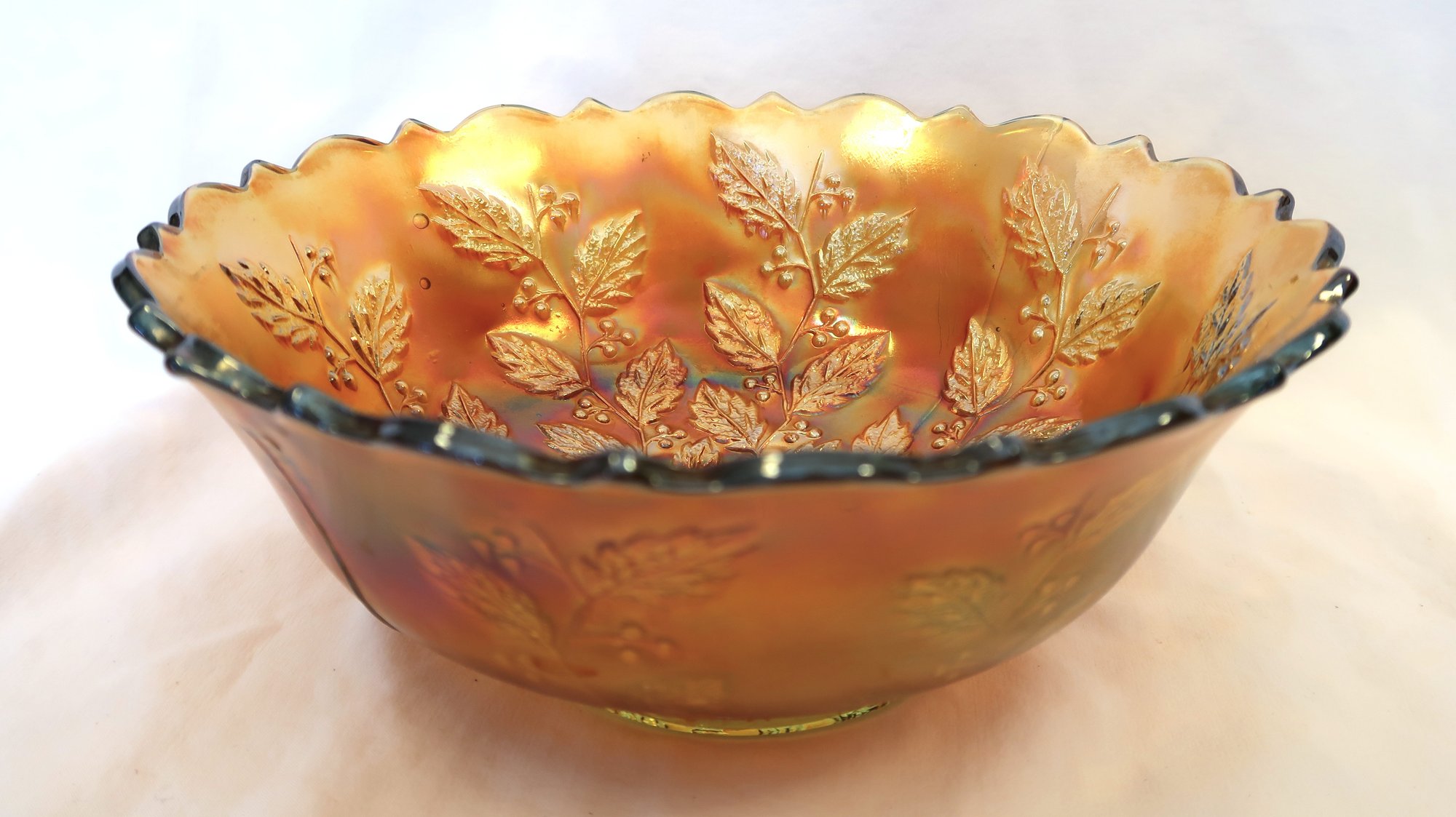 Notes: Carnival Glass, glass bowl, berries and leaves, amber glass, decorative bowl, Fenton Holly Marigold, glass ruffle bowl, iridescent glass