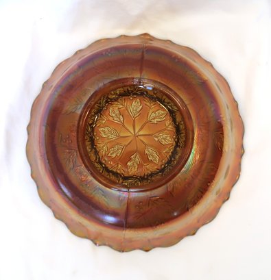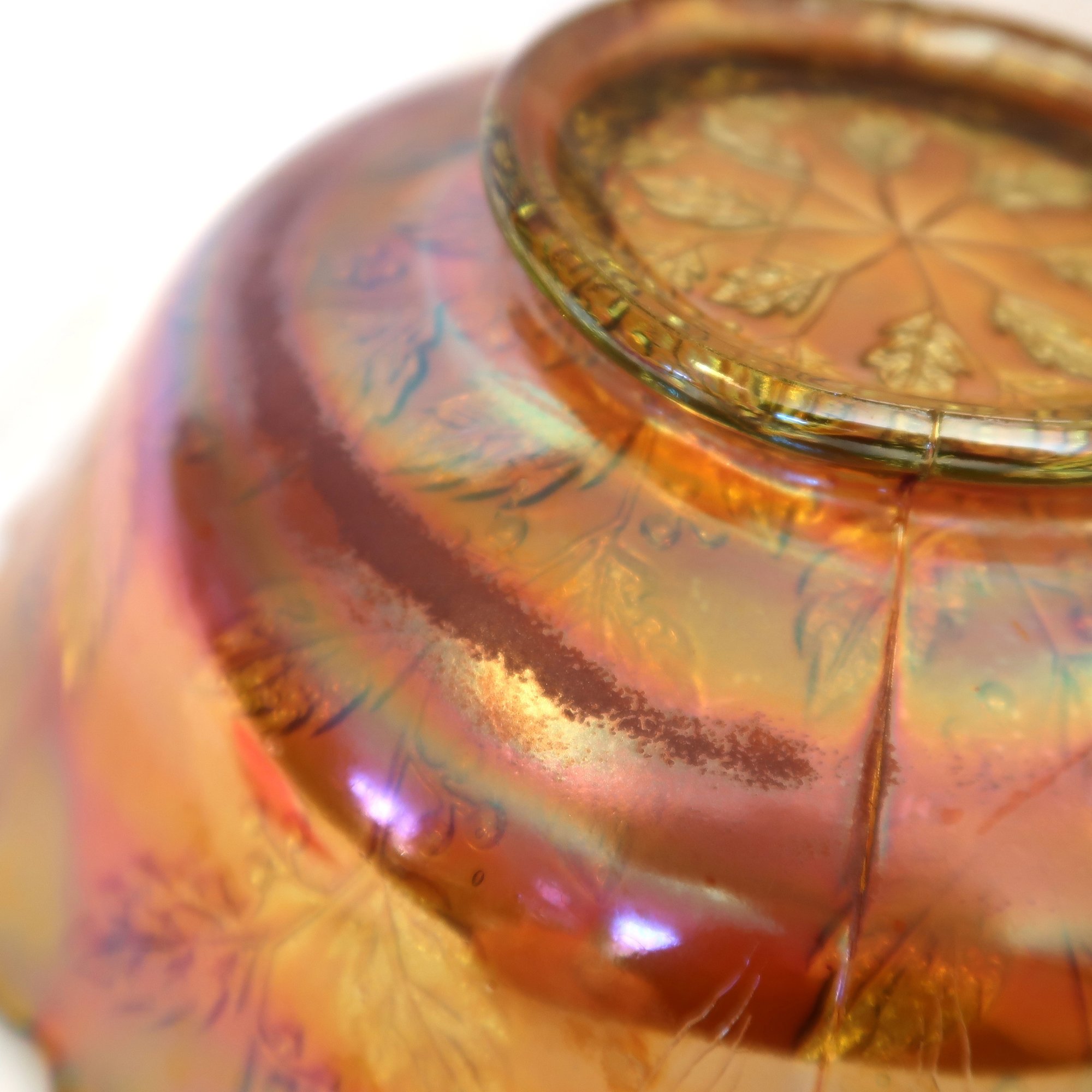 Carnival glass ruffle bowl with a Berries & Leaves pattern