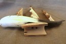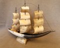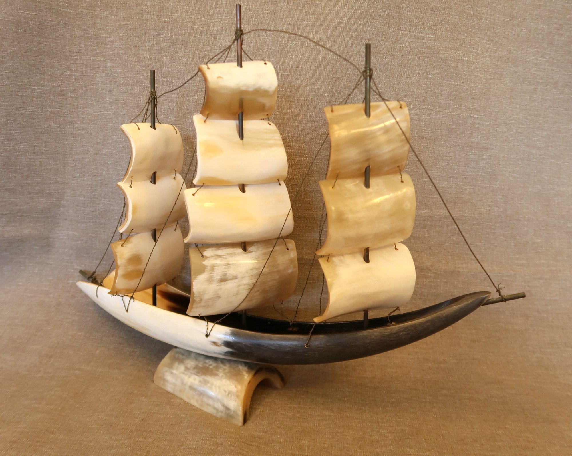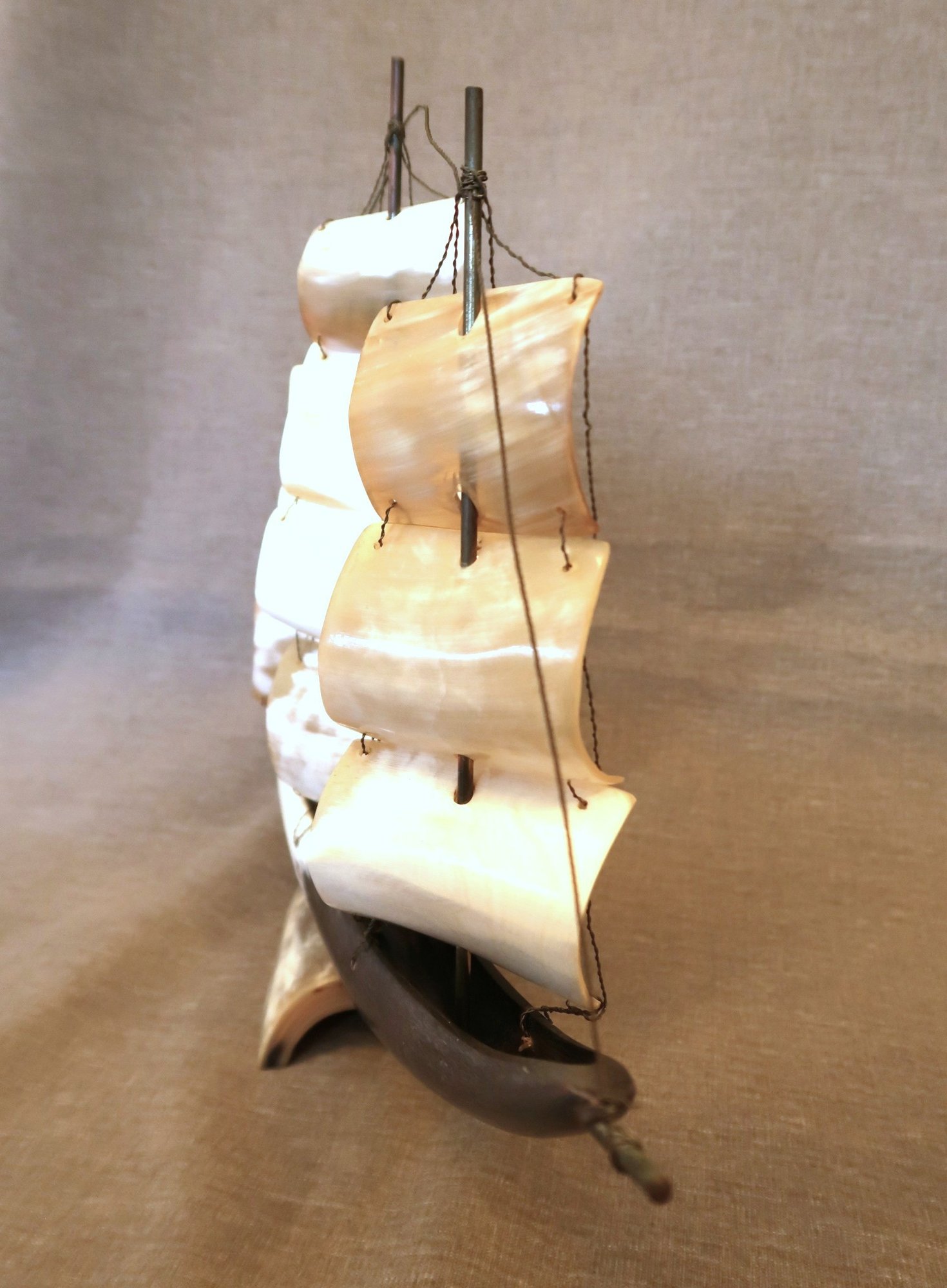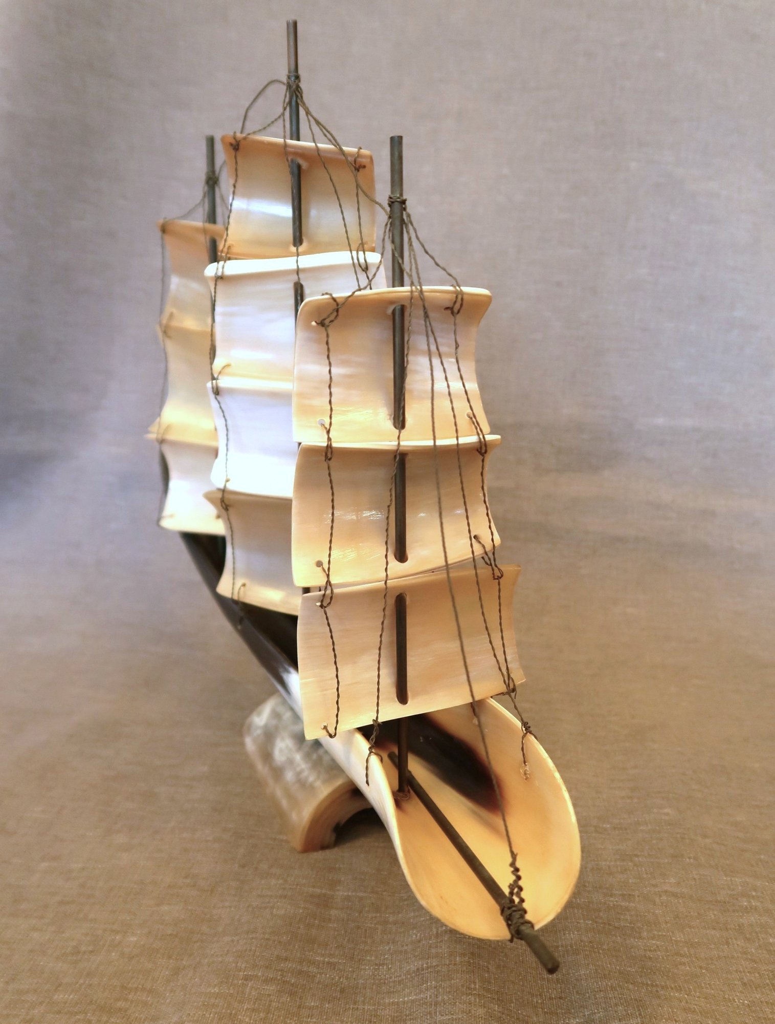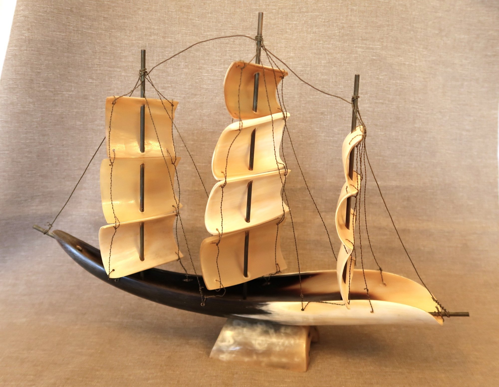 Carved bullhorn and brass wire ship