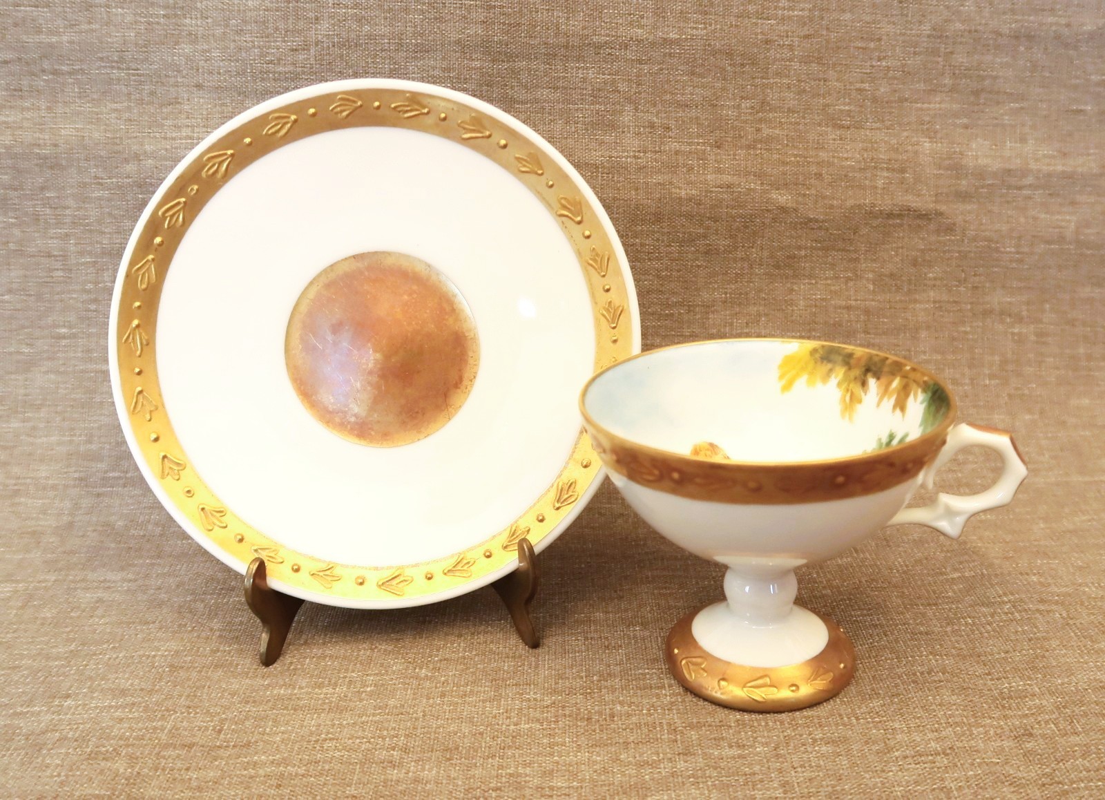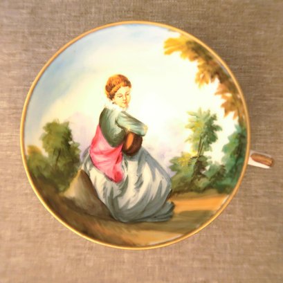 Teacup with a raised pedestal foot and hand-painted scene of a woman with gold trim