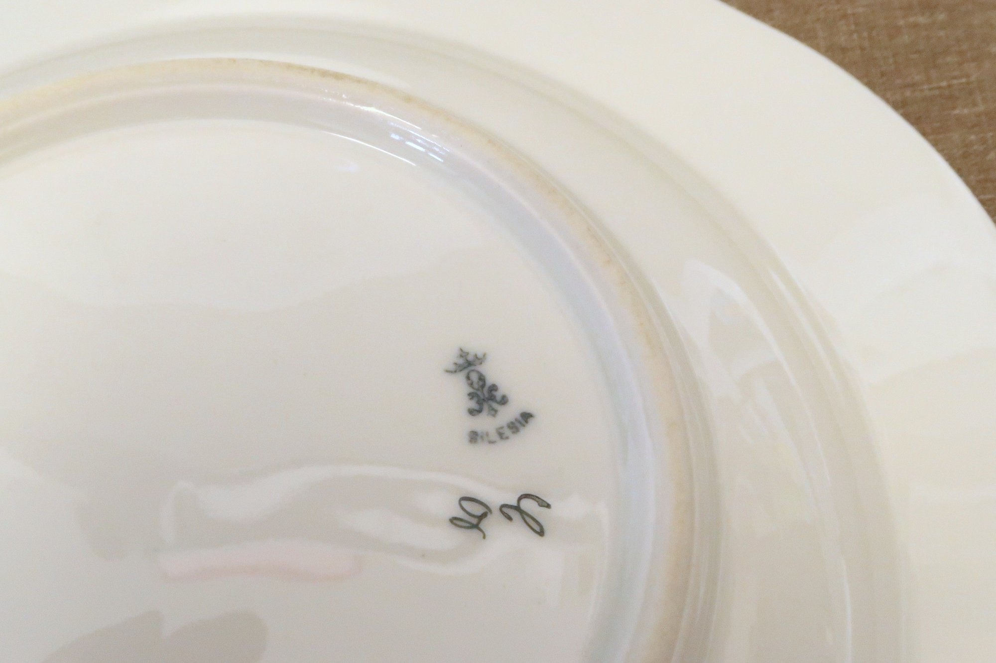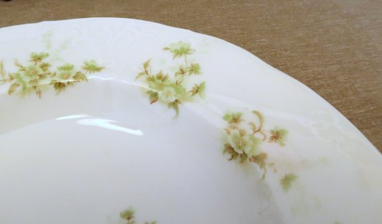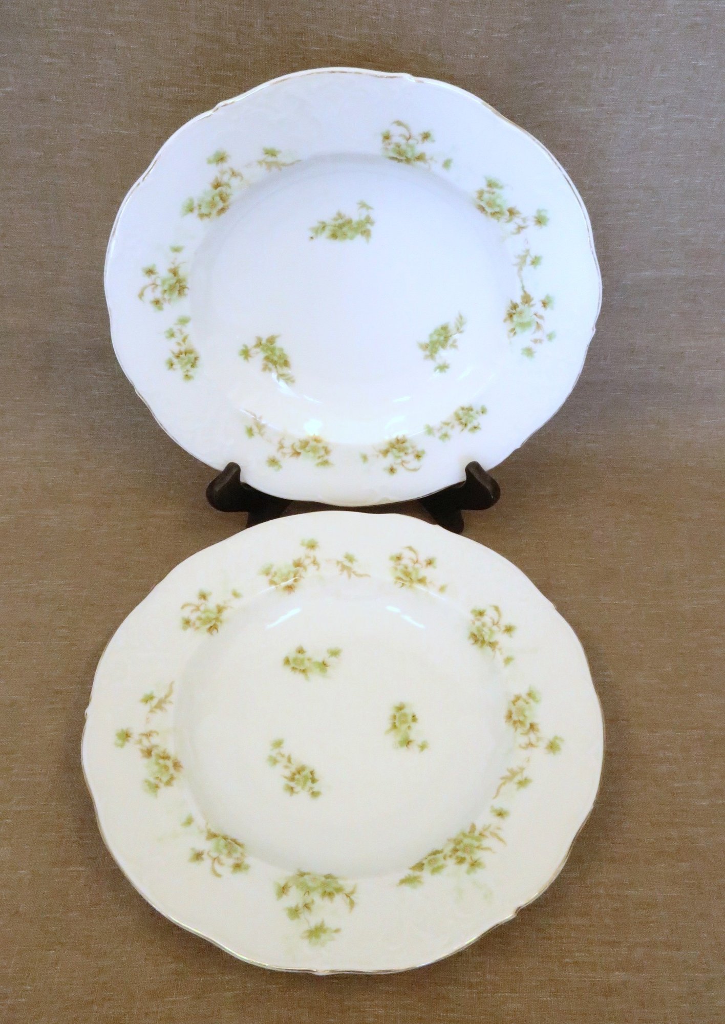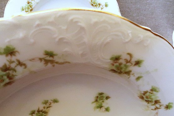 Bowls with embossed texture (white on white) alongside green and pink floral design