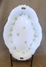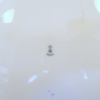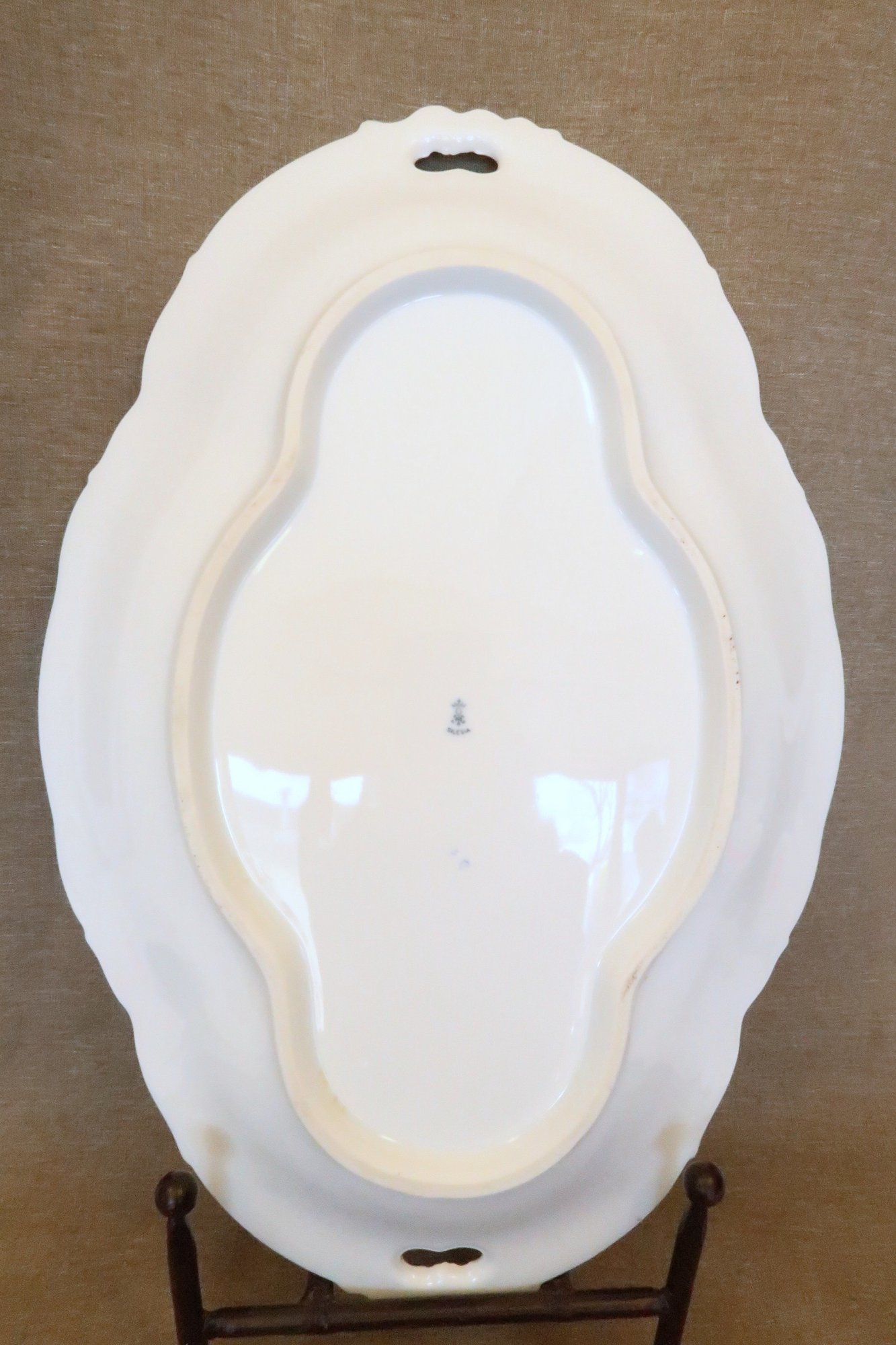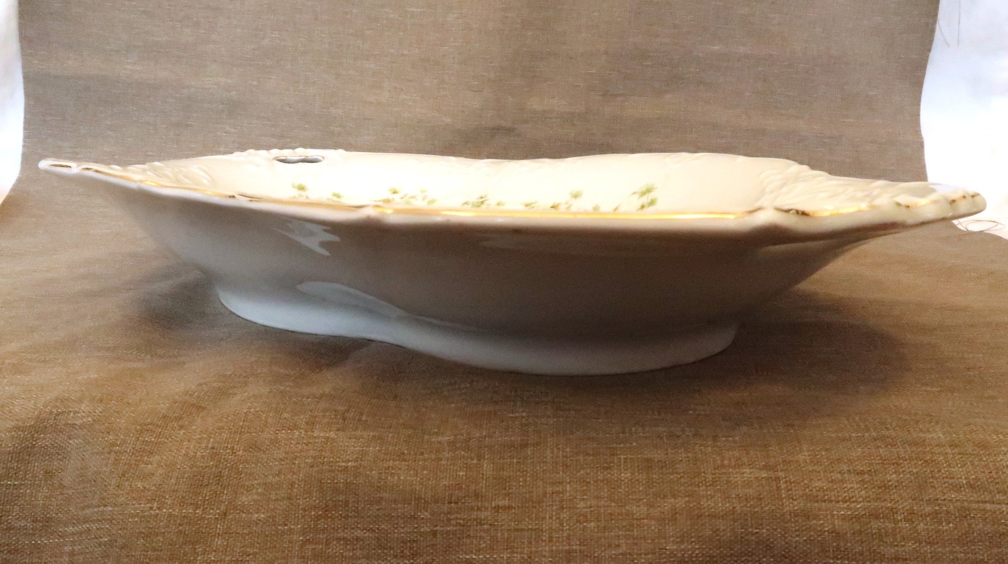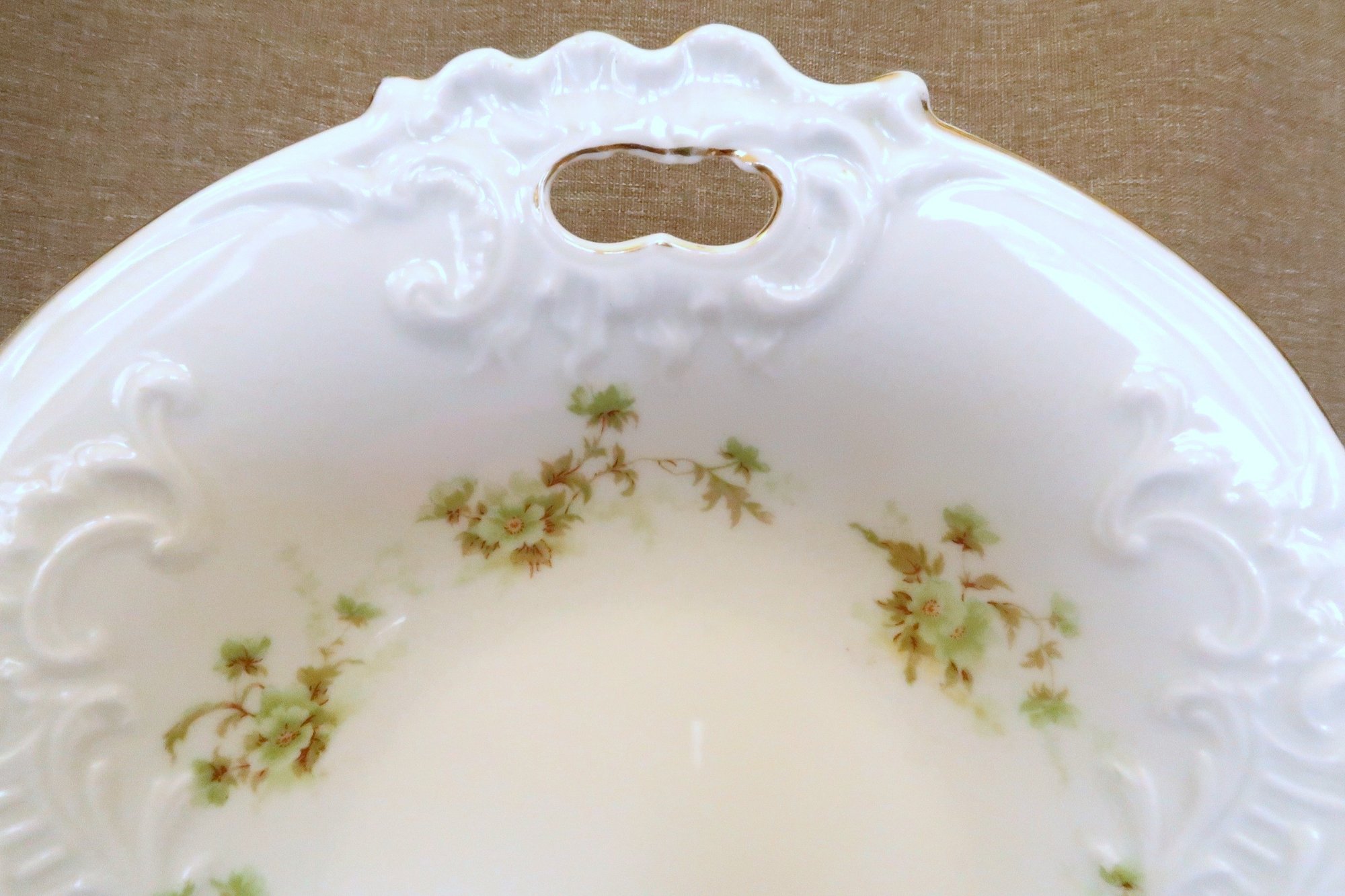Serving platter with embossed texture (white on white), green and pink floral design, and scalloped edges