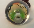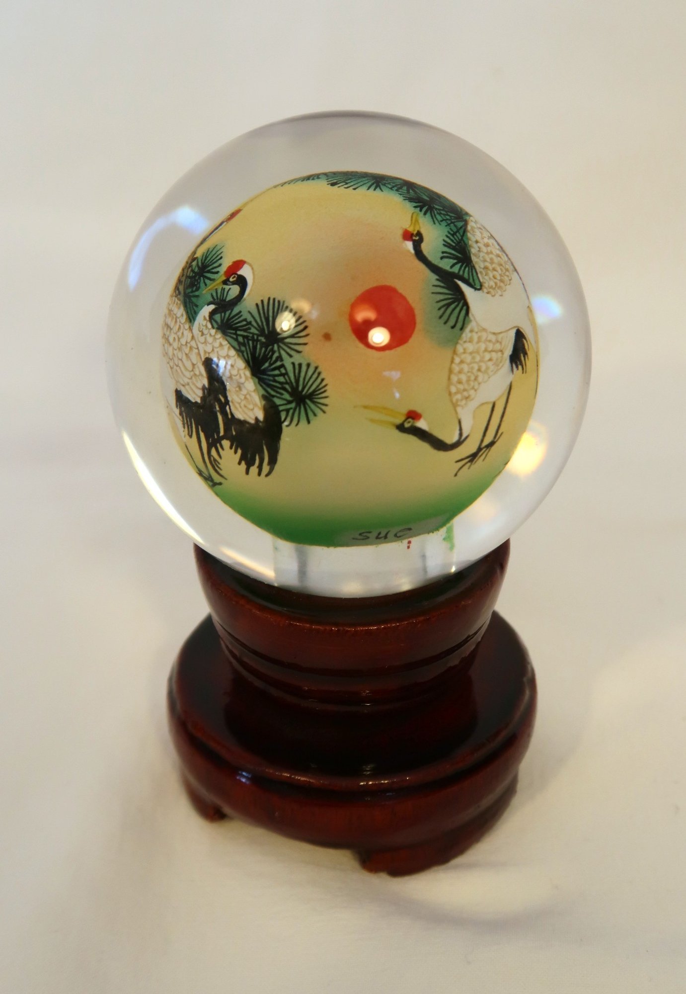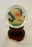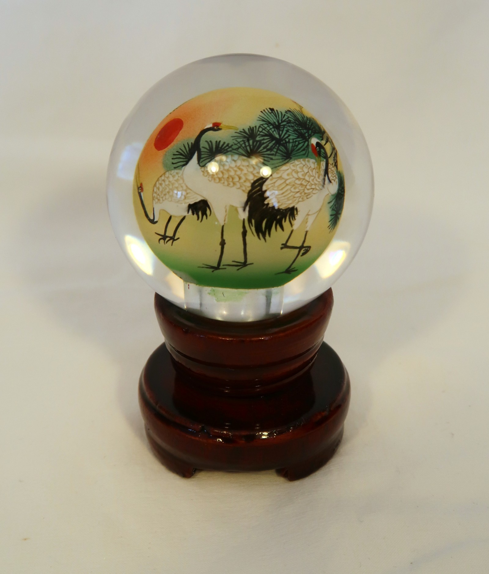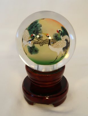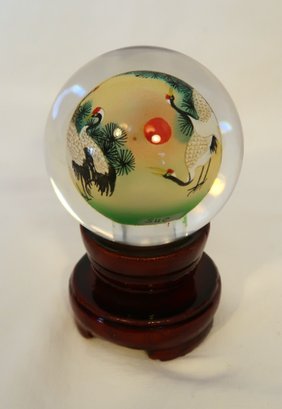 Vintage Reverse Hand Painted Cranes Revolving Sphere Ball Paperweight on Stand