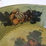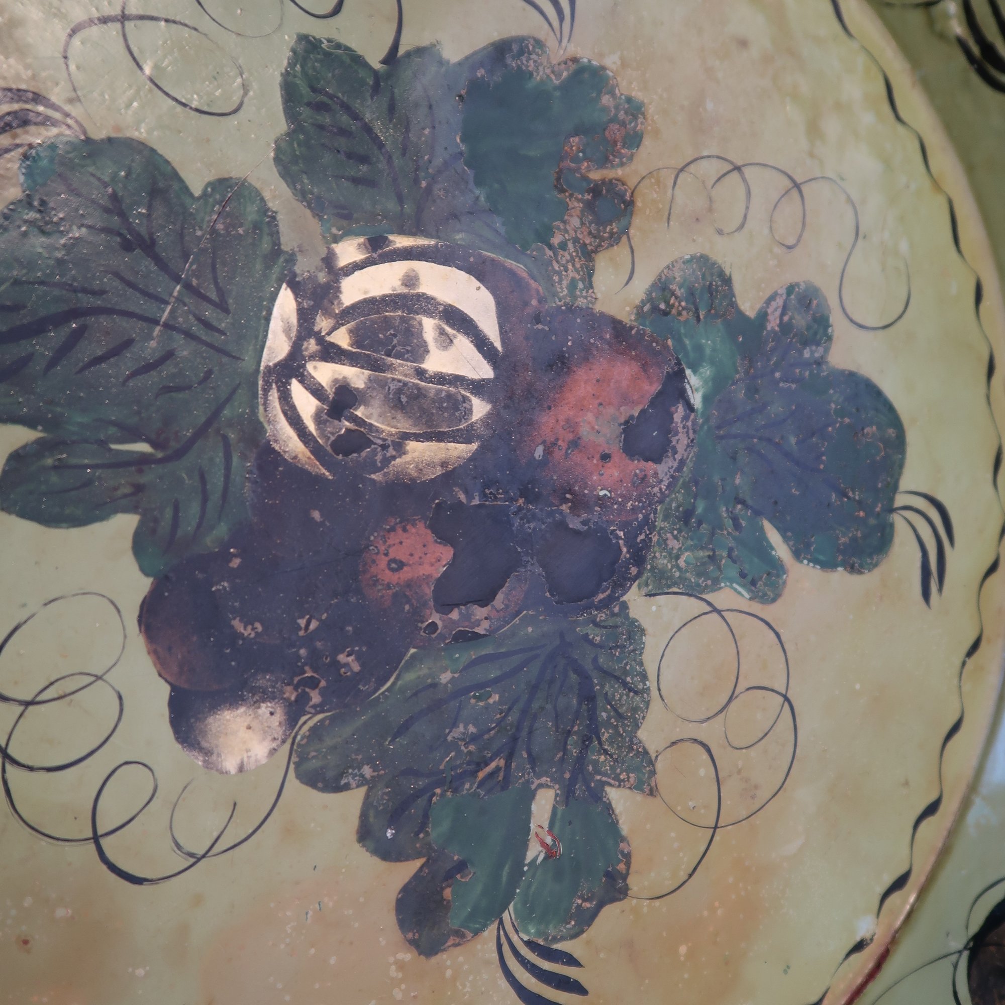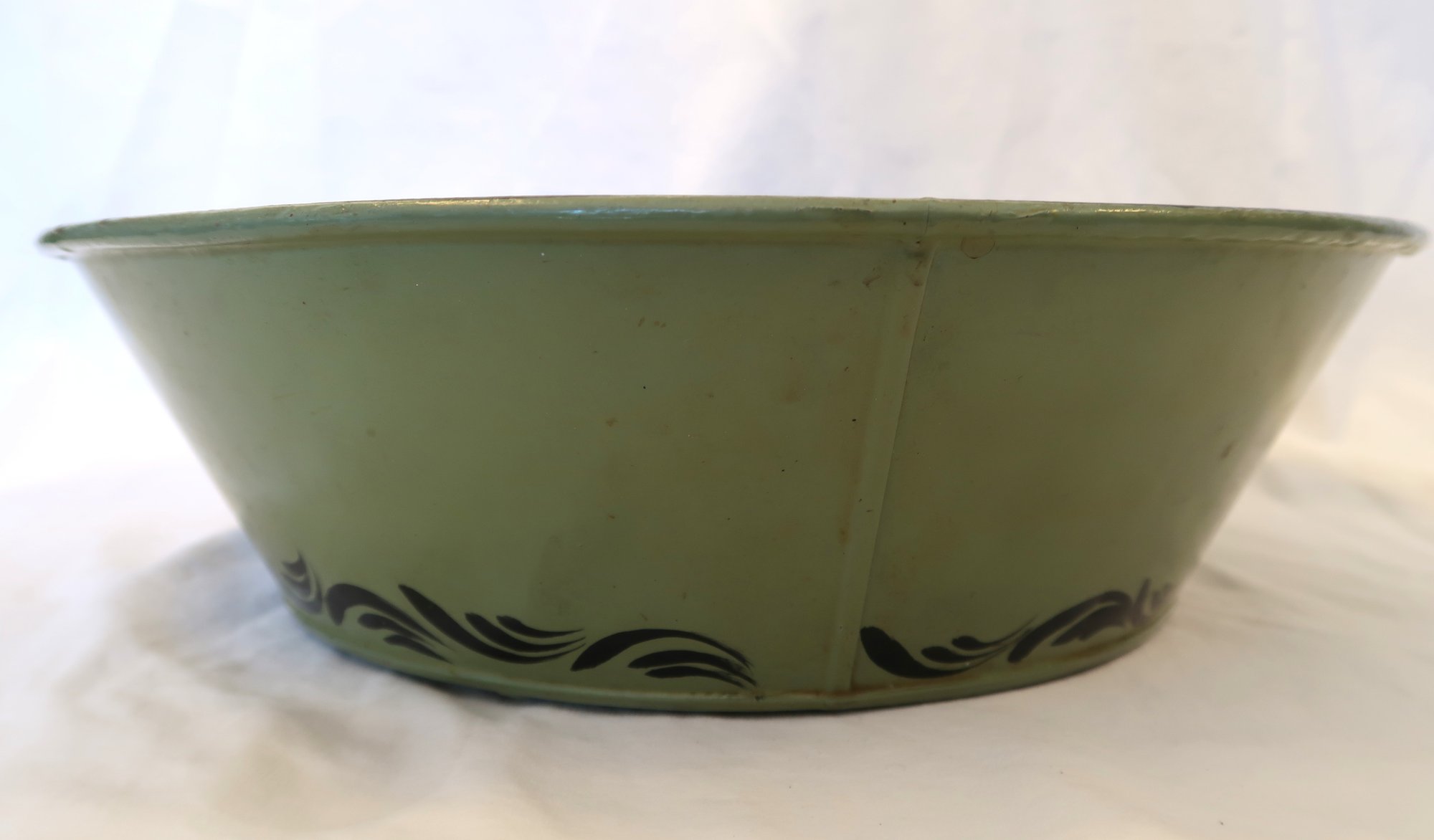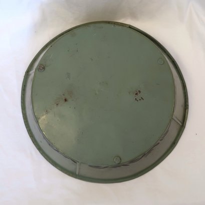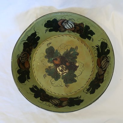Green painted tin bowl with pumpkin harvest design on the inside