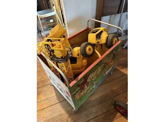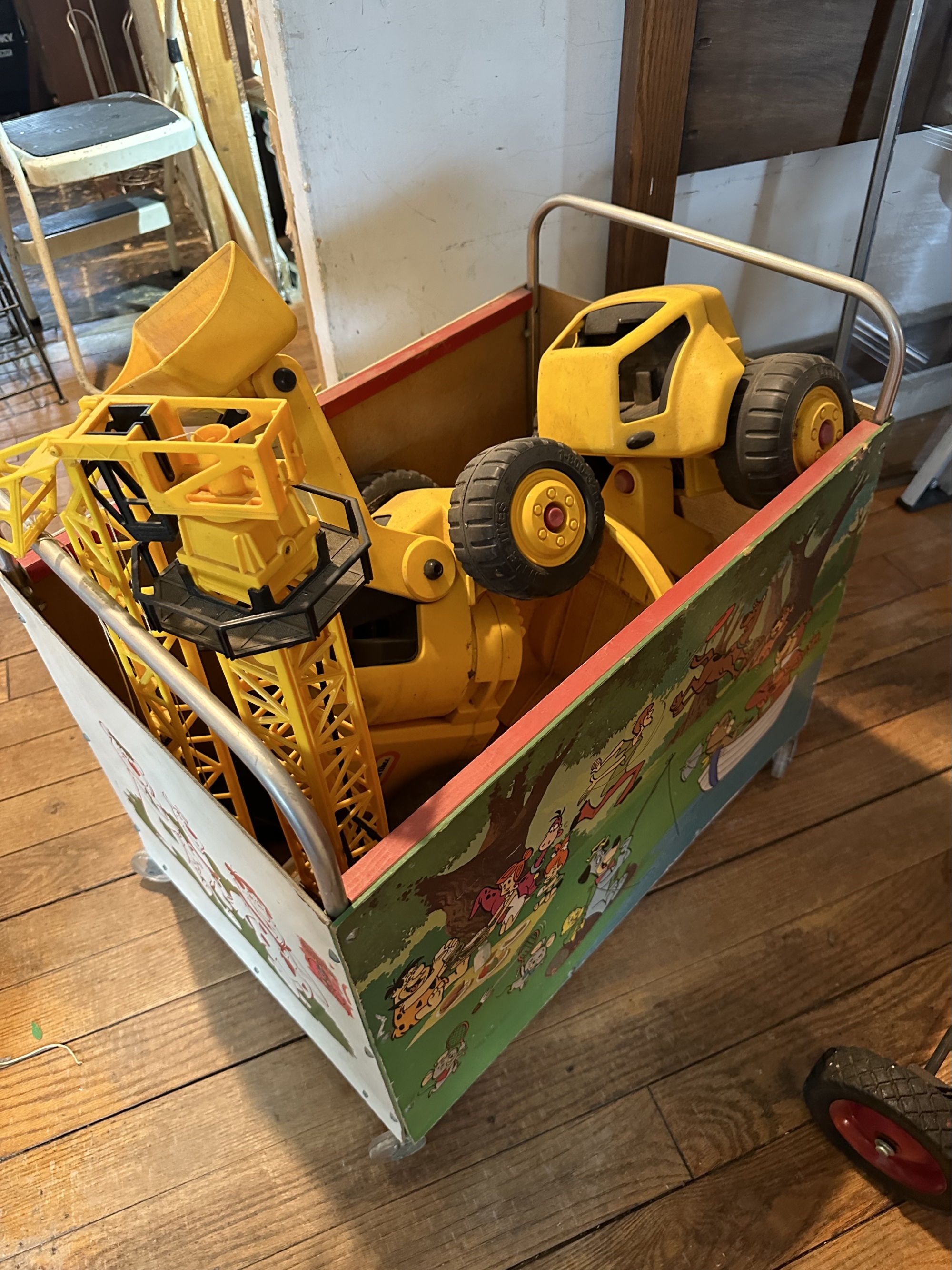 Great rolling flintstones bin with vintage trucks