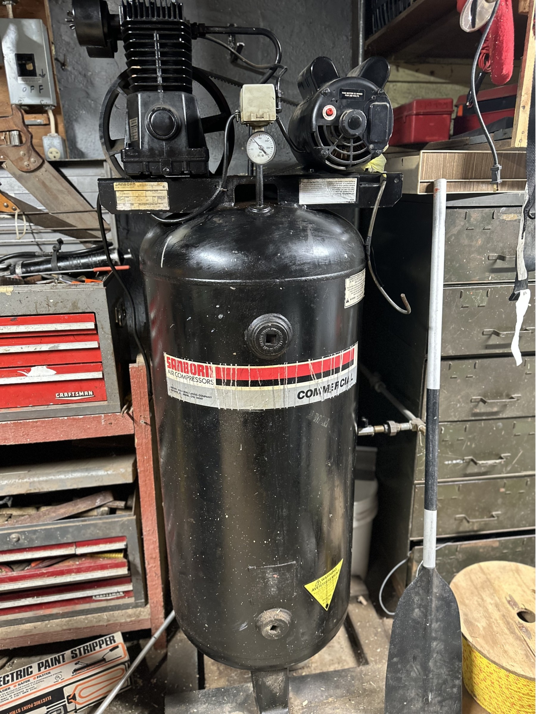Working great buyer must have the ability to move from a walk in basement this is an industrial size air compressor 6feet and heavy these sell over $700 used we do not move heavy items
