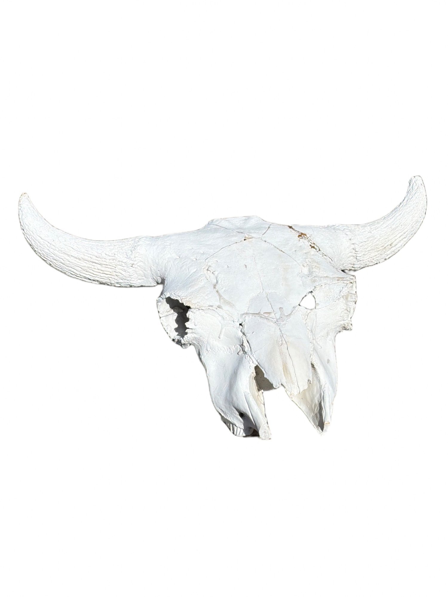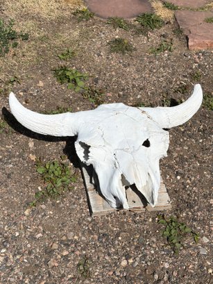 A 30-inch wide bovine skull featuring intact horns, mounted on a wooden base. The item appears to have weathered natural conditions but remains structurally intact. No markings or brand identifiers are present to indicate a specific origin or manufacturer.