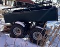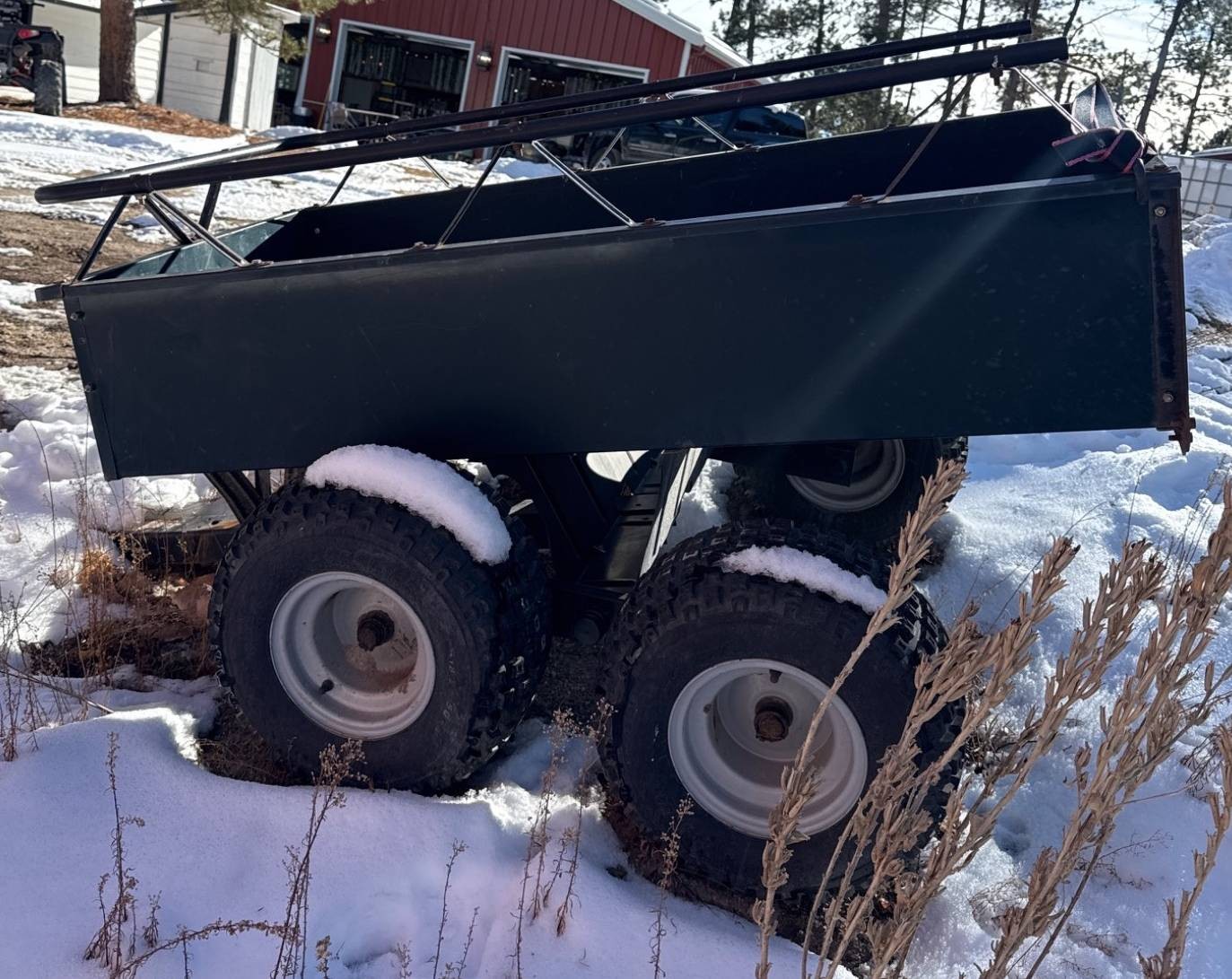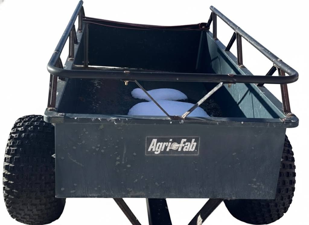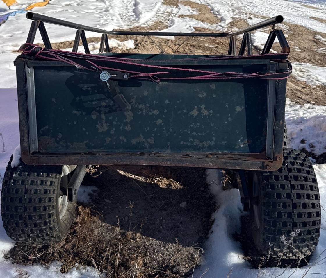 Utility dump cart manufactured by Agri-Fab, featuring a steel construction and a four-wheel design for enhanced stability. Designed for towing with lawn tractors or other equipment, this cart includes a dumping bed with a manual release lever and side rail supports. Signage indicates load capacity and usage instructions. Shows wear from outdoor use with visible rust and paint wear on the bed. Approximate dimensions: length 48 in, width 24 in, height 12 in (with side rails).