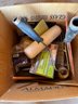 This lot features a box of assorted painting supplies including items such as paint rollers, brushes, a roller pan, and other accessories. The items appear to be housed in a repurposed cardboard box. The condition of the supplies varies. Ideal for painting projects or general repair work.