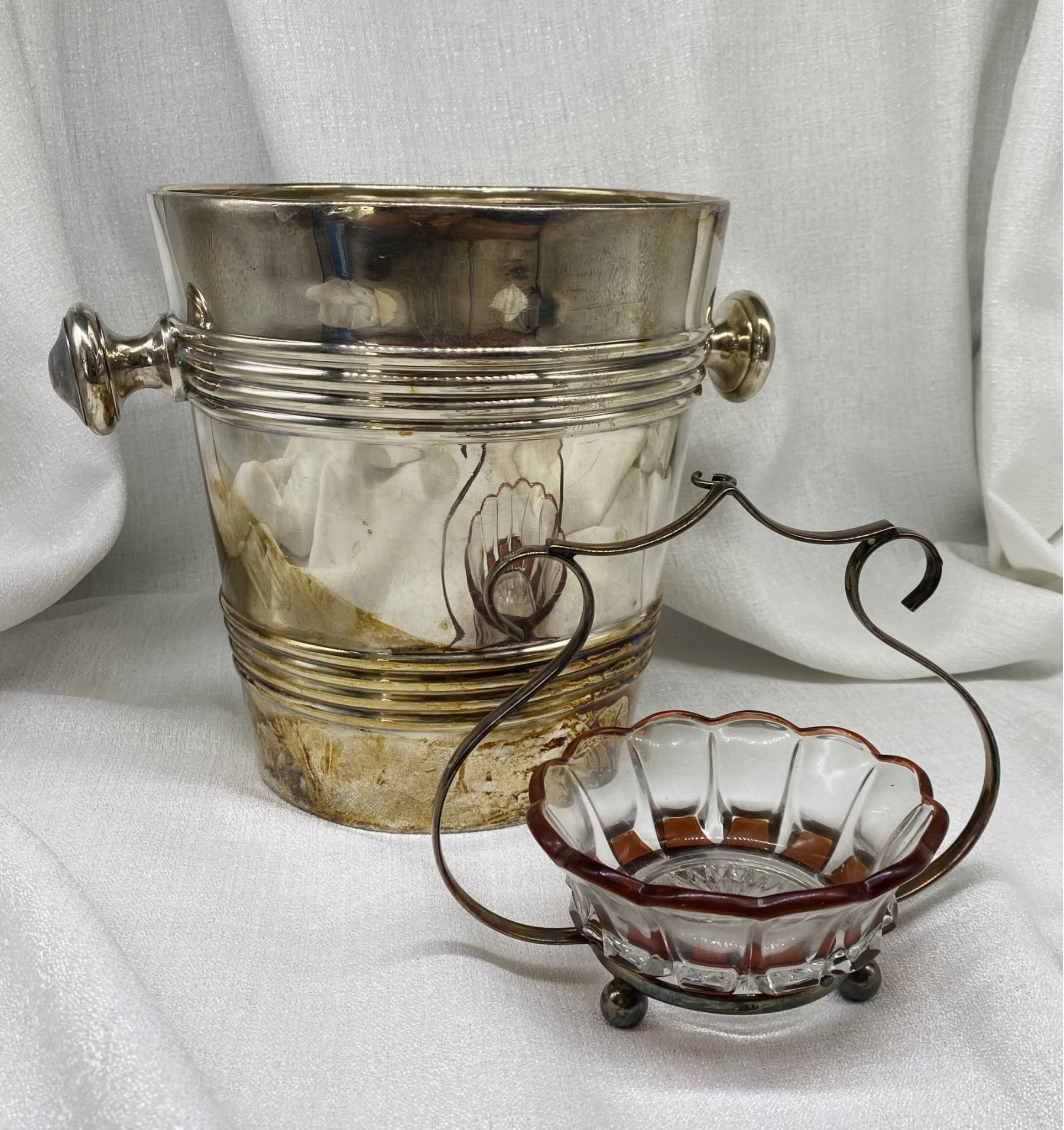 Amber Color Glass Bowl In Stand, Plus Large Ice Bucket