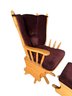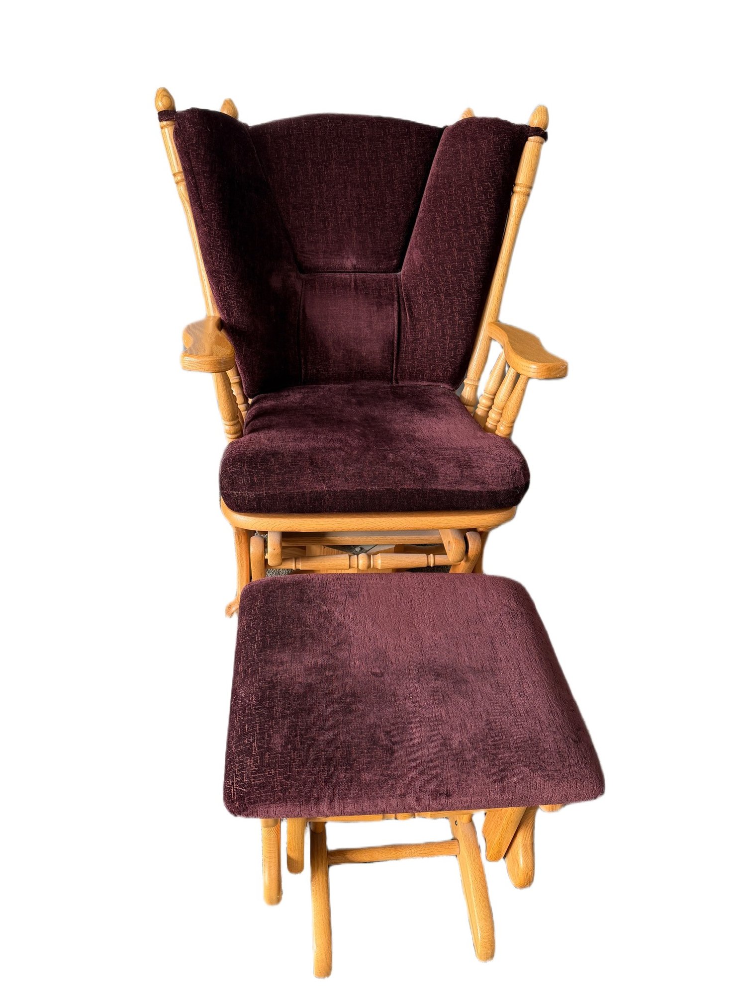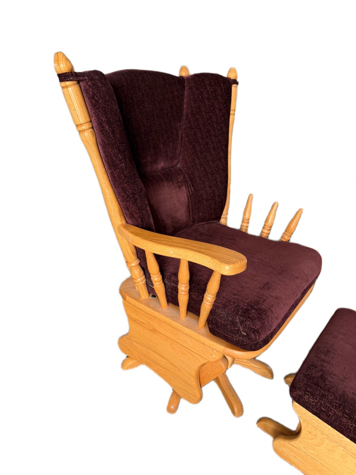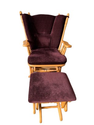 Amish-crafted wooden glider rocking chair with a matching ottoman. Constructed with light-toned solid wood featuring turned spindles on the backrest and armrests. The chair includes a dark upholstered seat and backrest, and the ottoman boasts a coordinating upholstered top. Designed with a gliding mechanism for smooth movement. Ideal for comfortable seating or relaxation.
