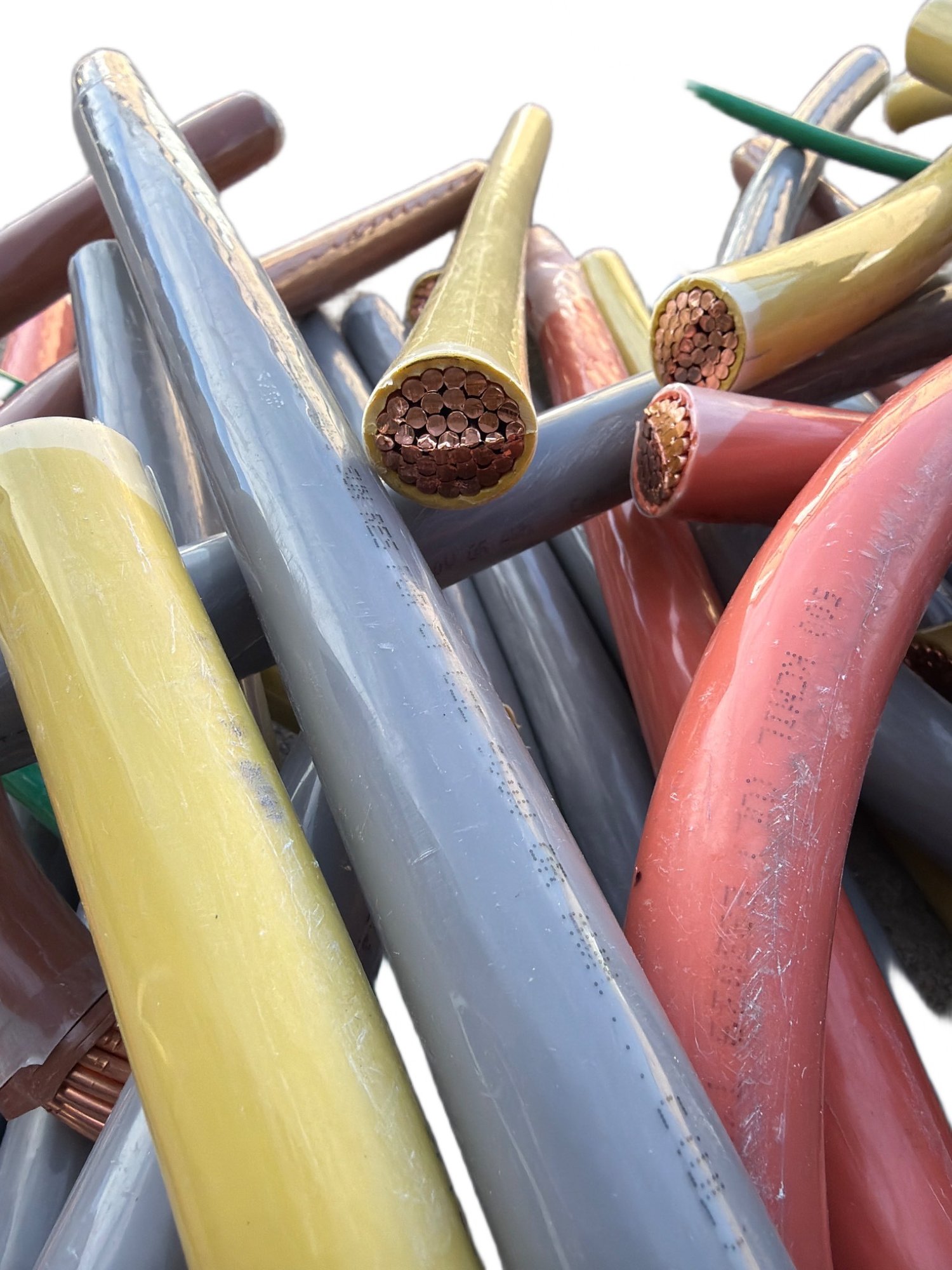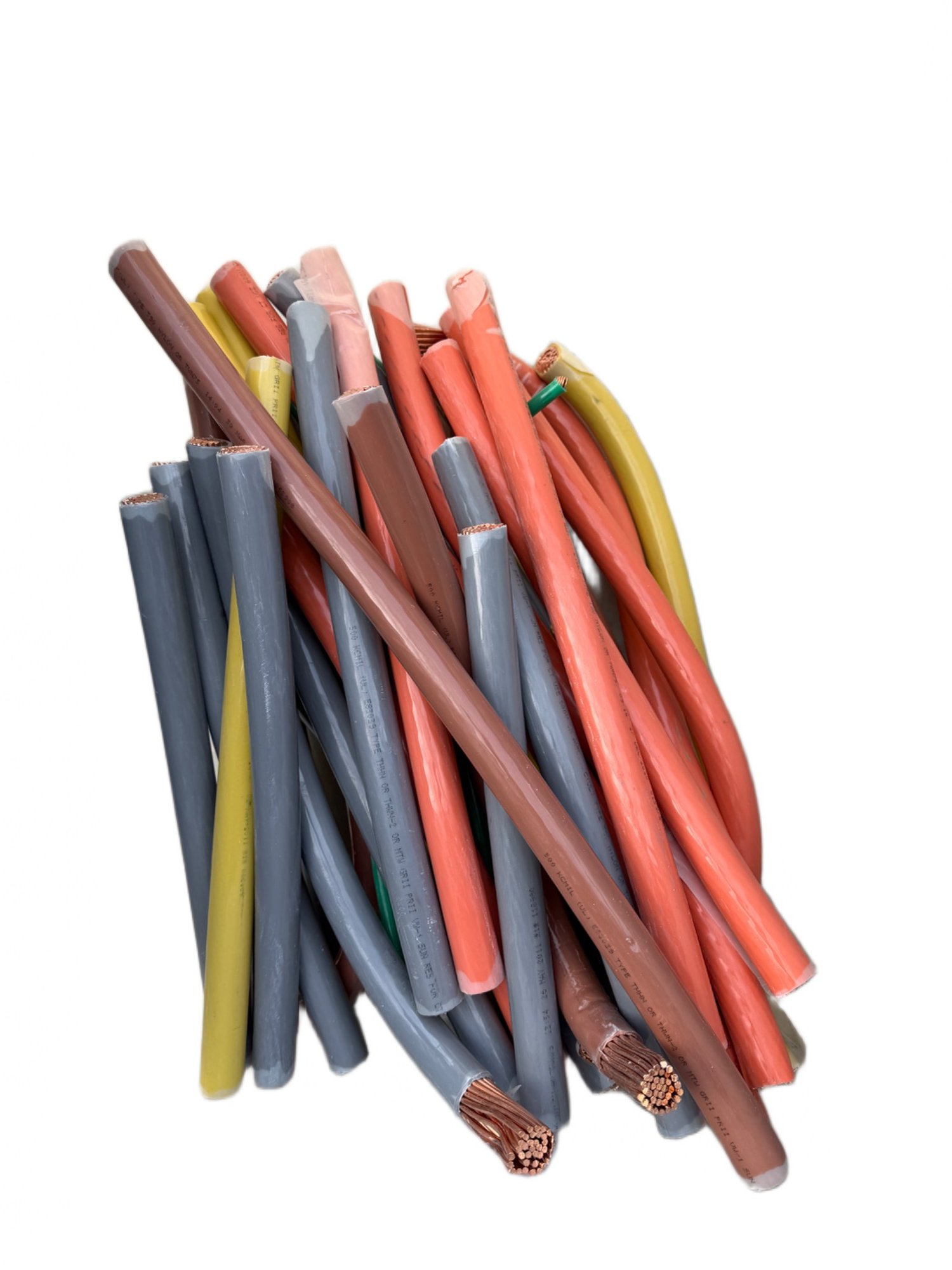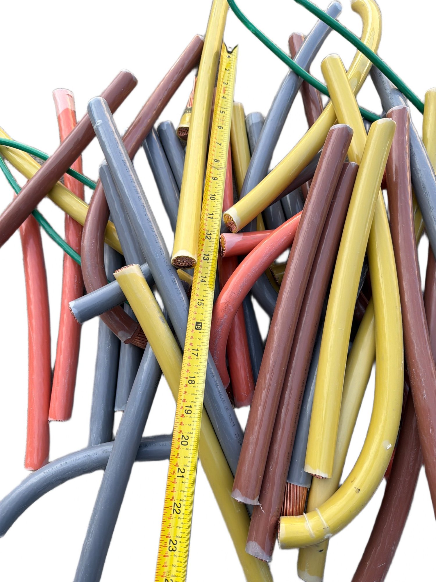 Insulated copper wires in various colors, including yellow, red, grey, brown, and green. Some cables reveal cut copper inside. The wires measure approximately 24-28 inches in length. Ideal for copper recovery or related applications. The contents consist solely of segments with visible copper strands.