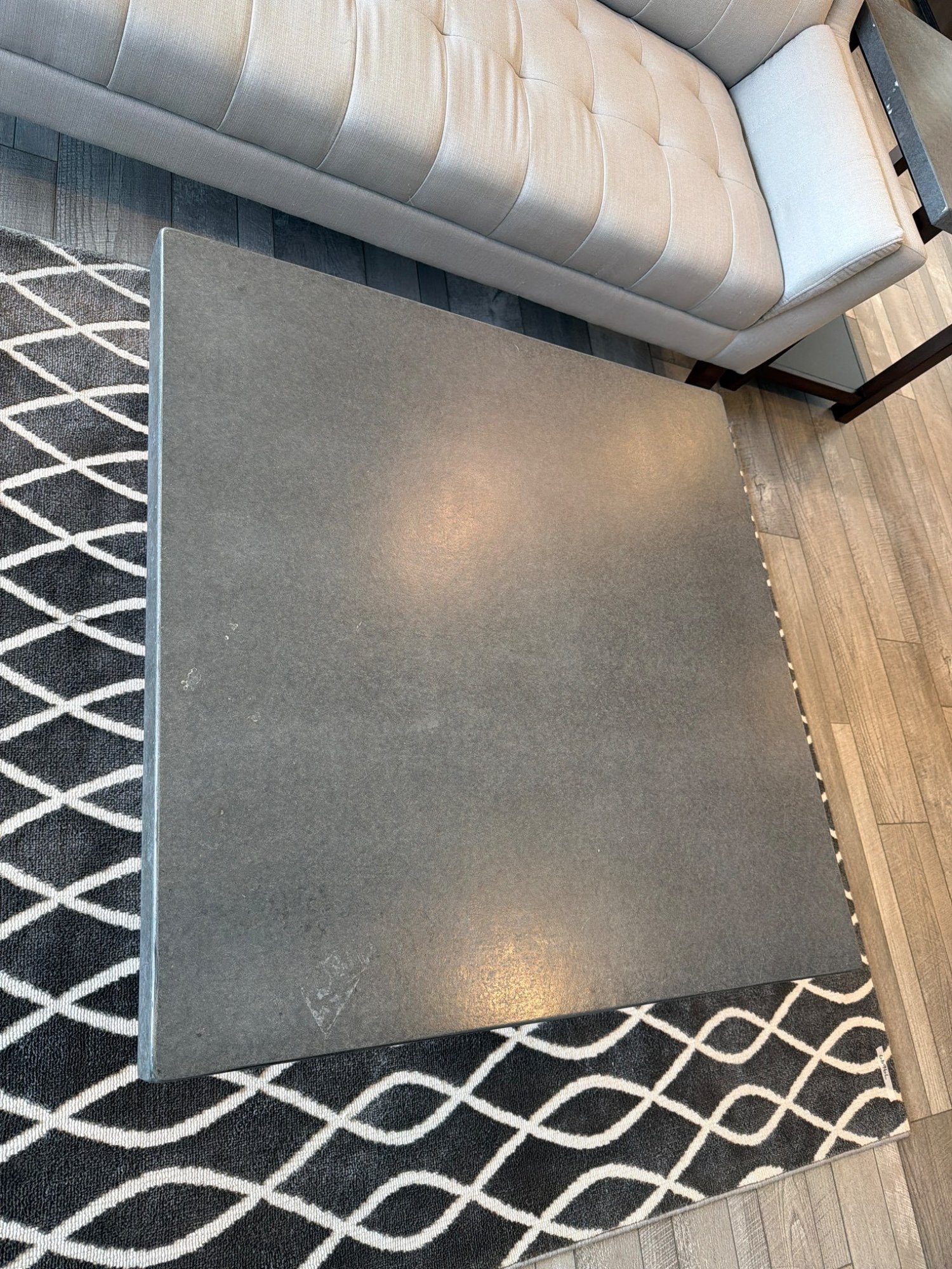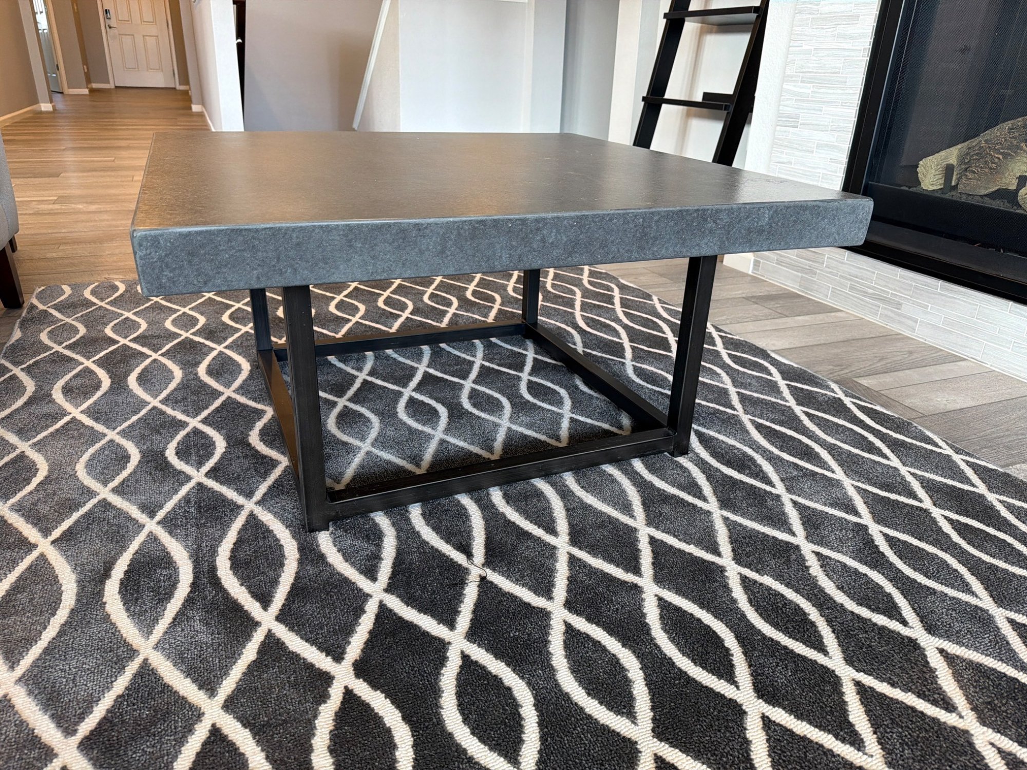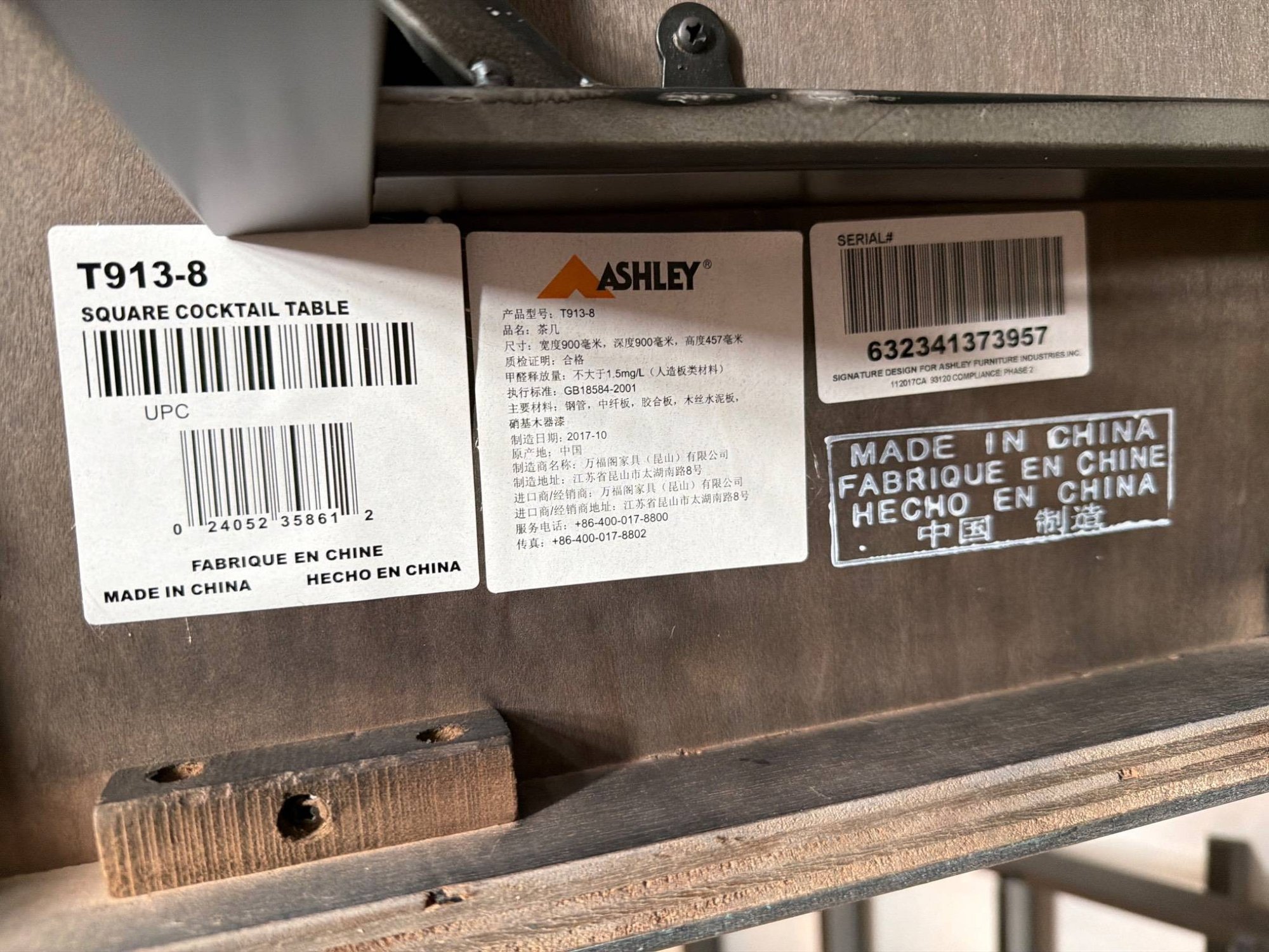 Square cocktail table by Ashley Furniture, model T913-8. Features a textured stone-like laminate top with a black rectangular metal frame base. Designed for modern and contemporary interior spaces. Made in China, as indicated on the manufacturer's label. Measures approximately 36 inches wide, 36 inches deep, and 16 inches high.