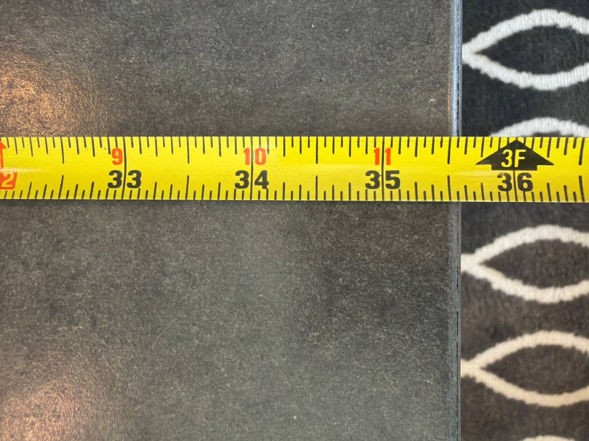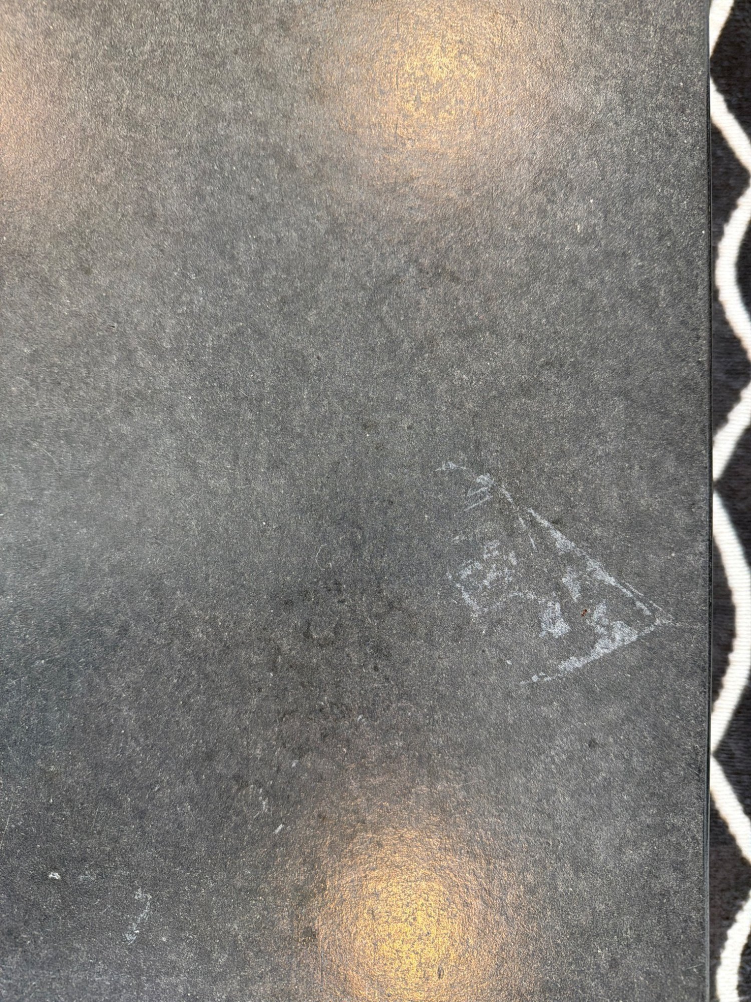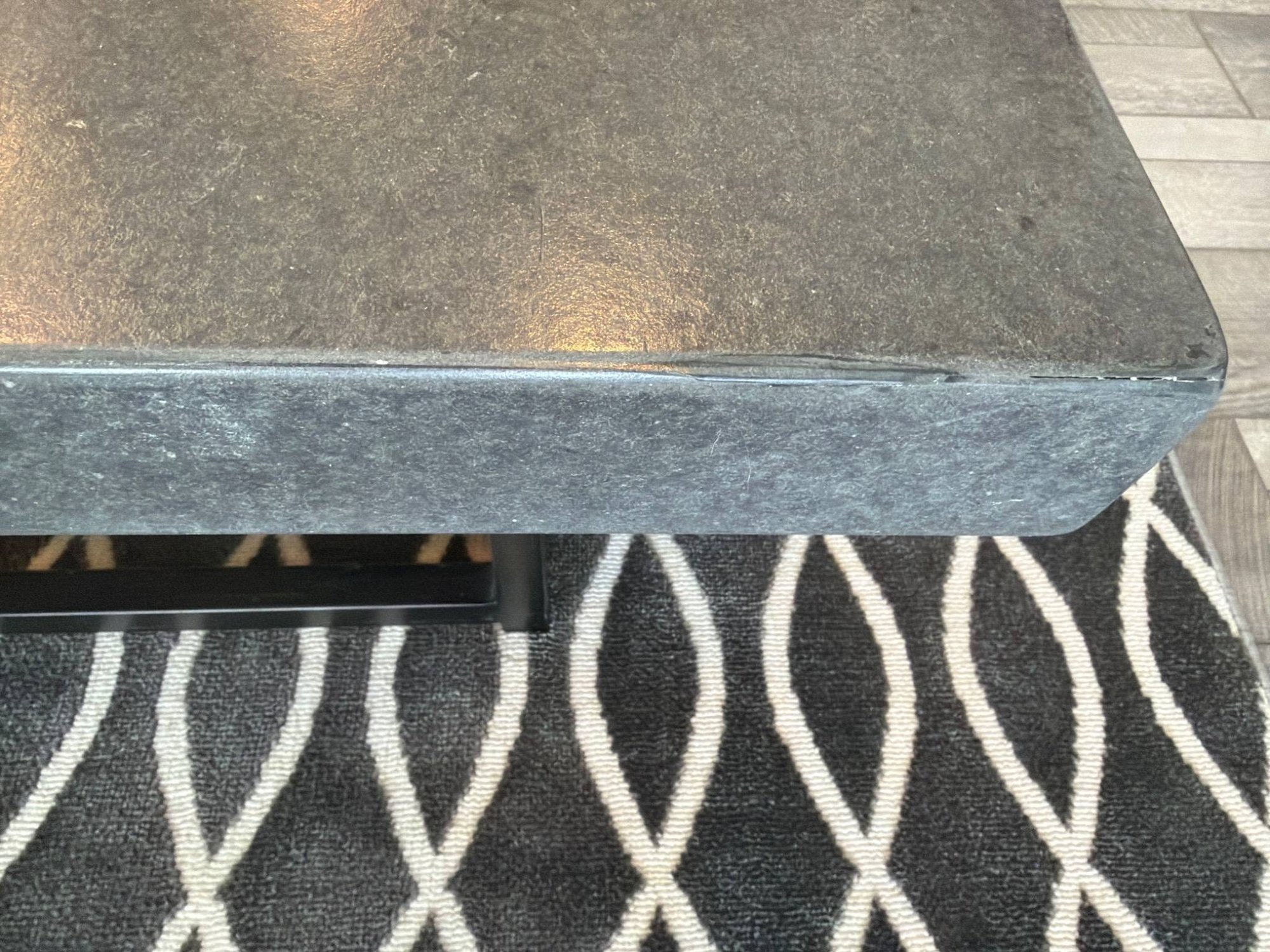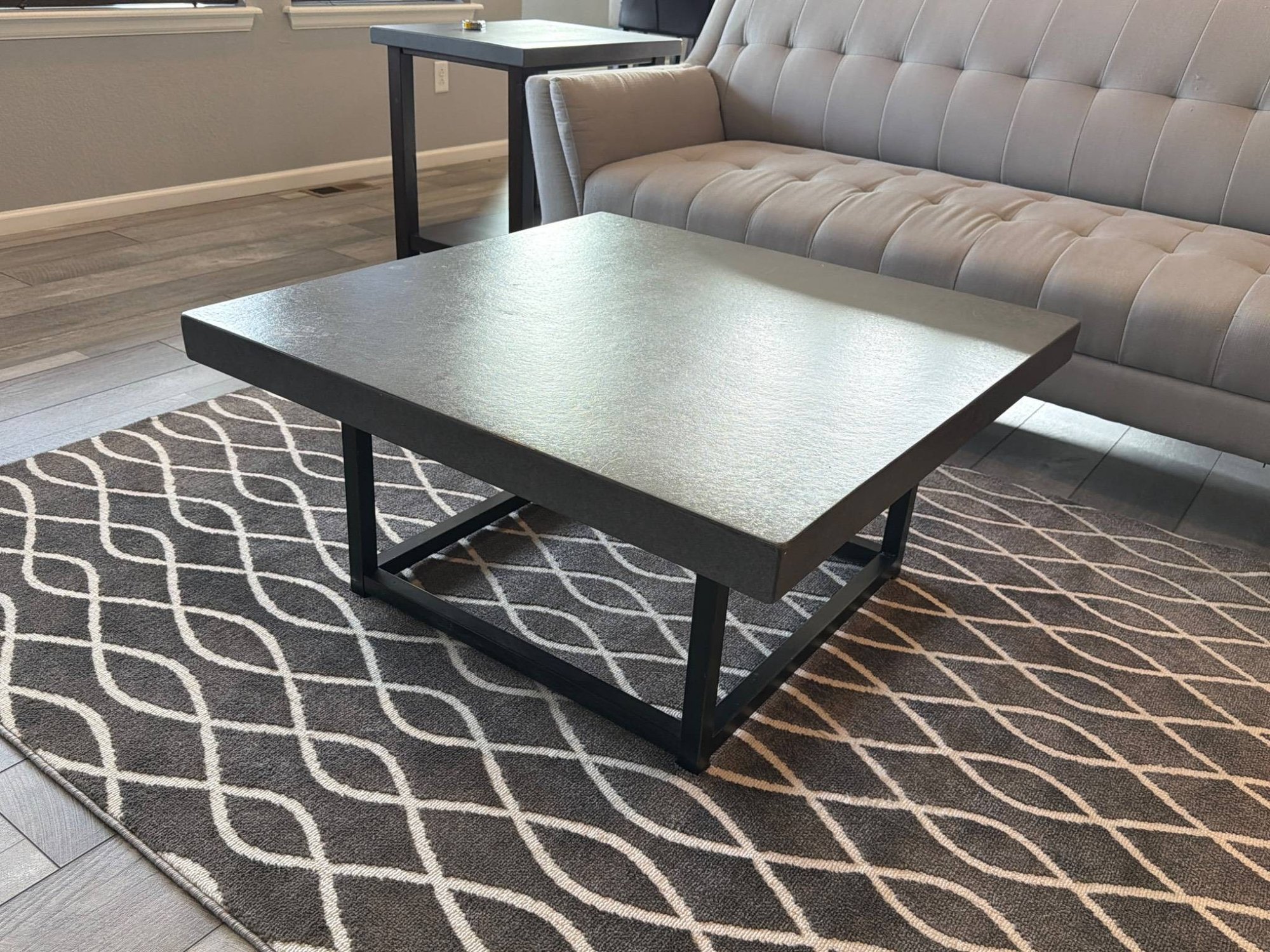 Square cocktail table by Ashley Furniture, model T913-8. Features a textured stone-like laminate top with a black rectangular metal frame base. Designed for modern and contemporary interior spaces. Made in China, as indicated on the manufacturer's label. Measures approximately 36 inches wide, 36 inches deep, and 16 inches high.