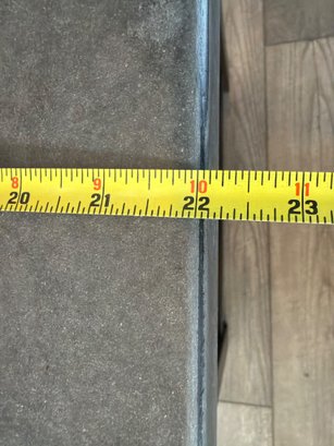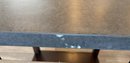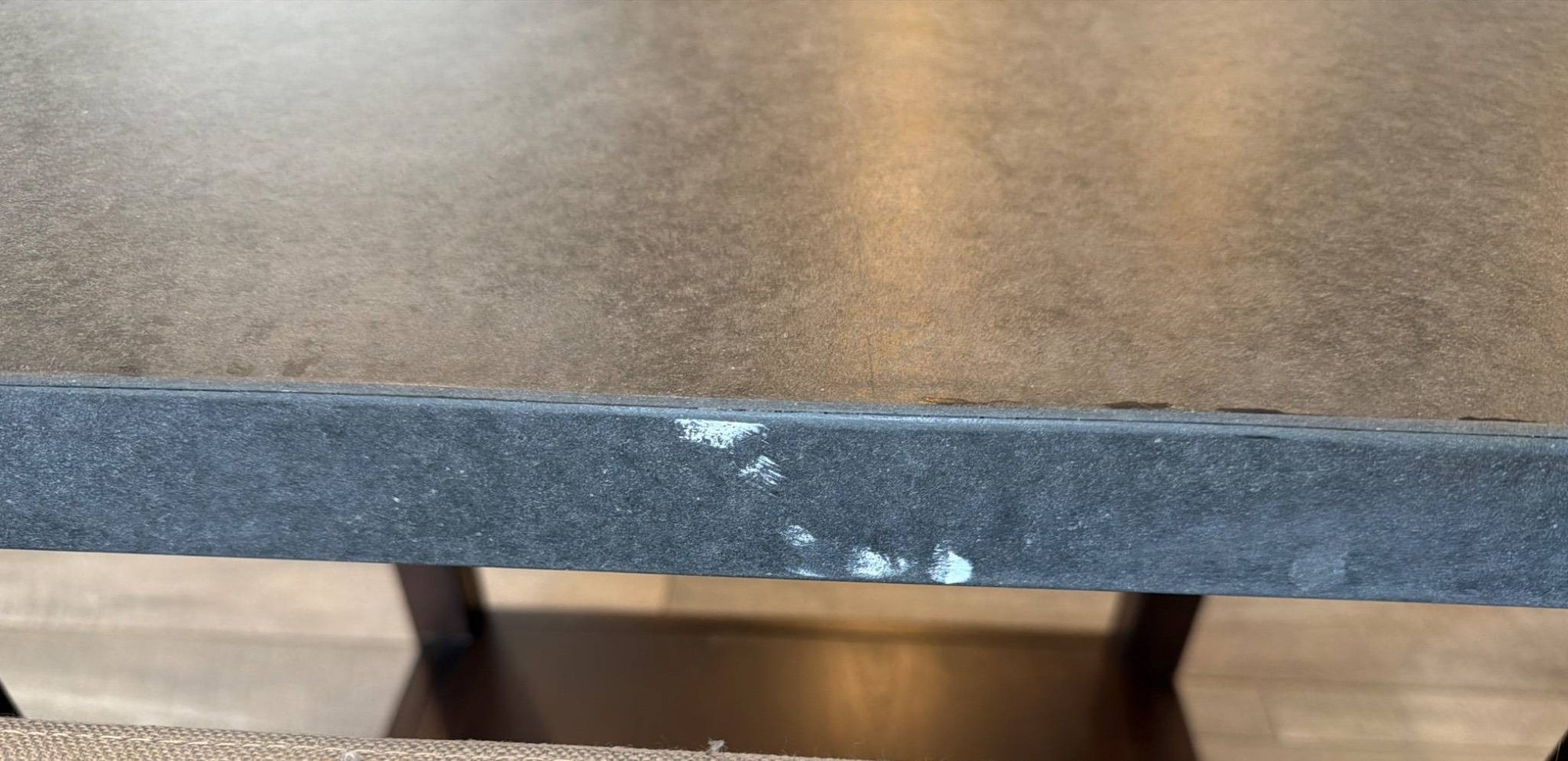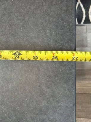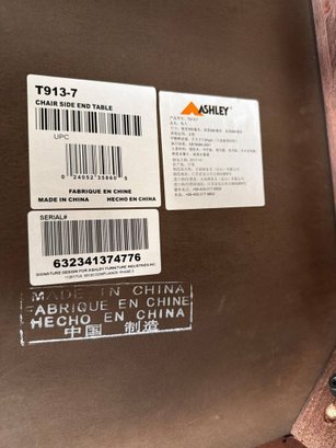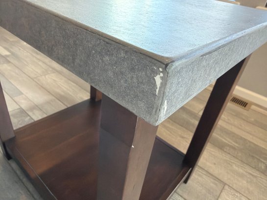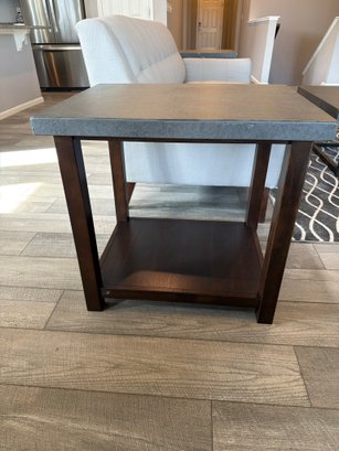 Ashley Furniture T913-7 Chanceen end table featuring a faux concrete top and a wood base in a dark stain. Includes an open lower shelf for additional storage or display. Minor wear and chipping visible on the table edge. Overall dimensions are approximately 22 inches wide, 24 inches deep, and 24 inches high.