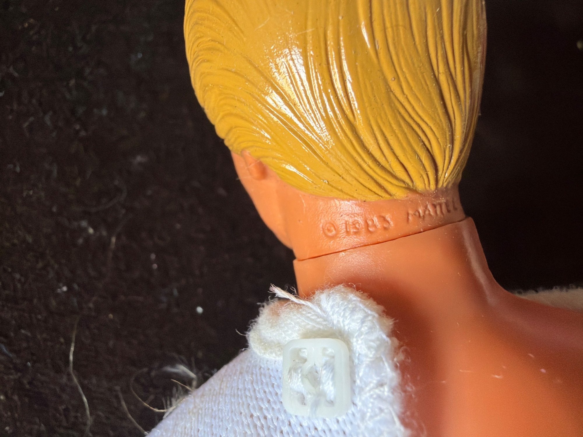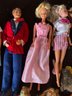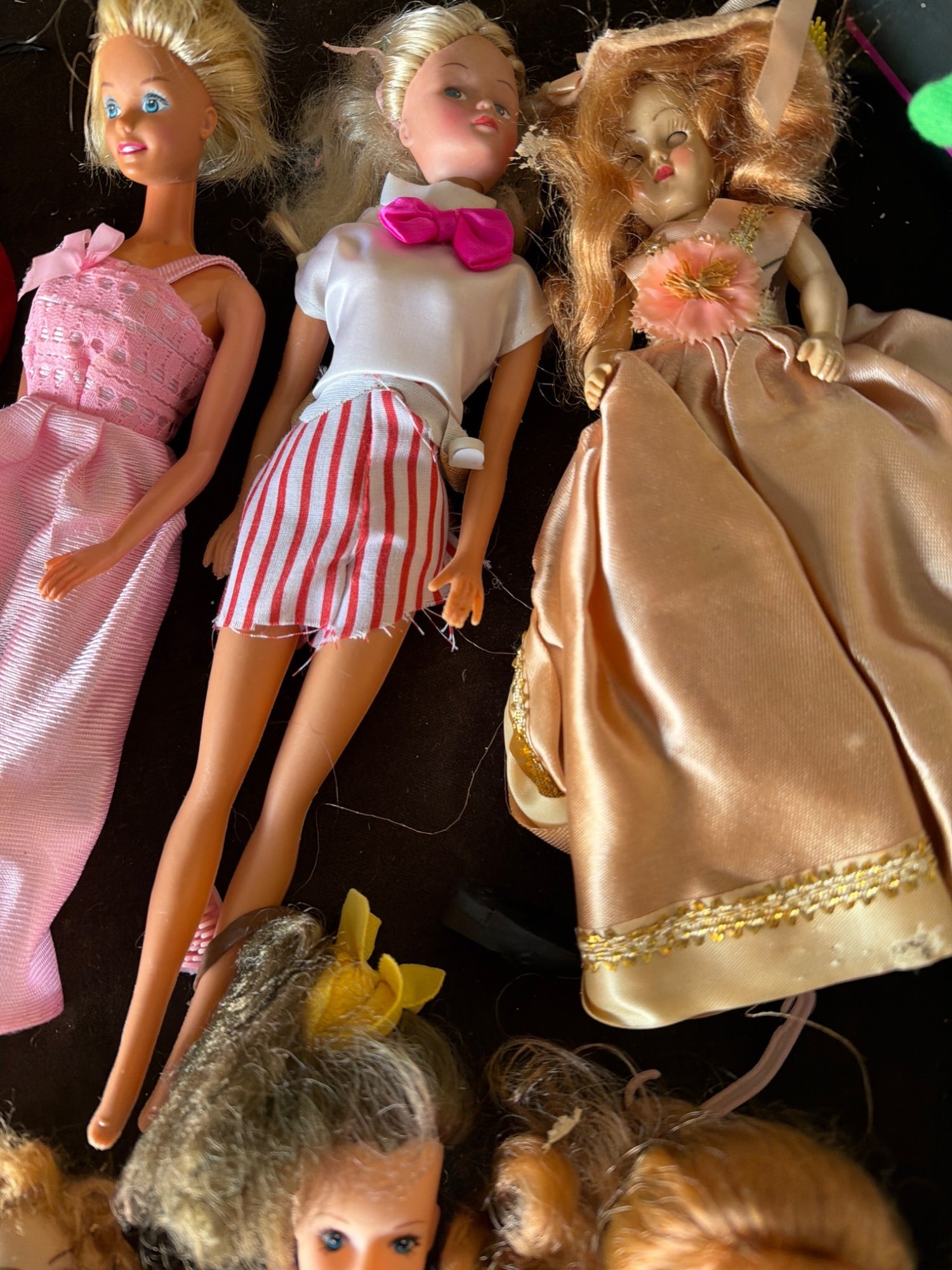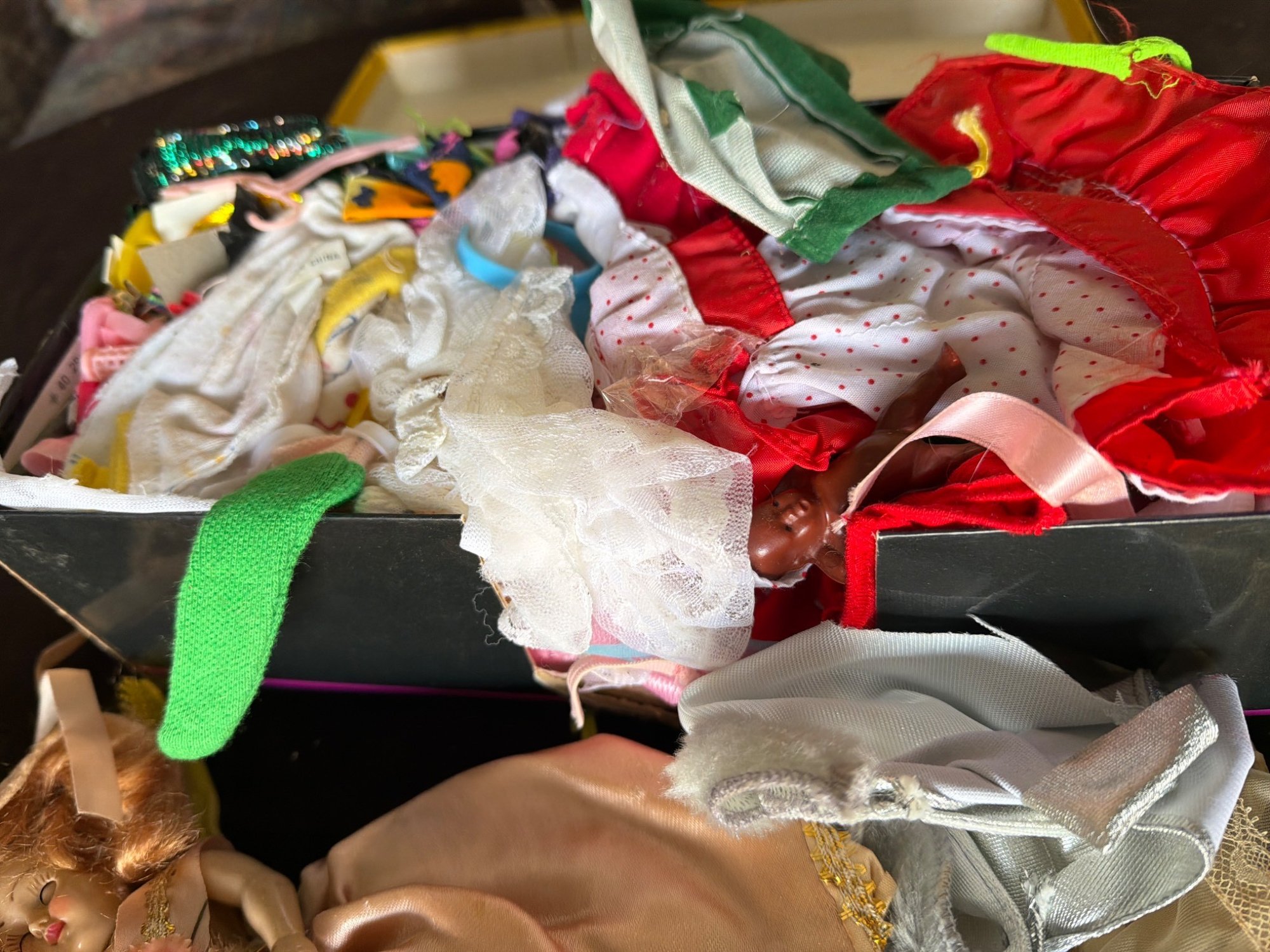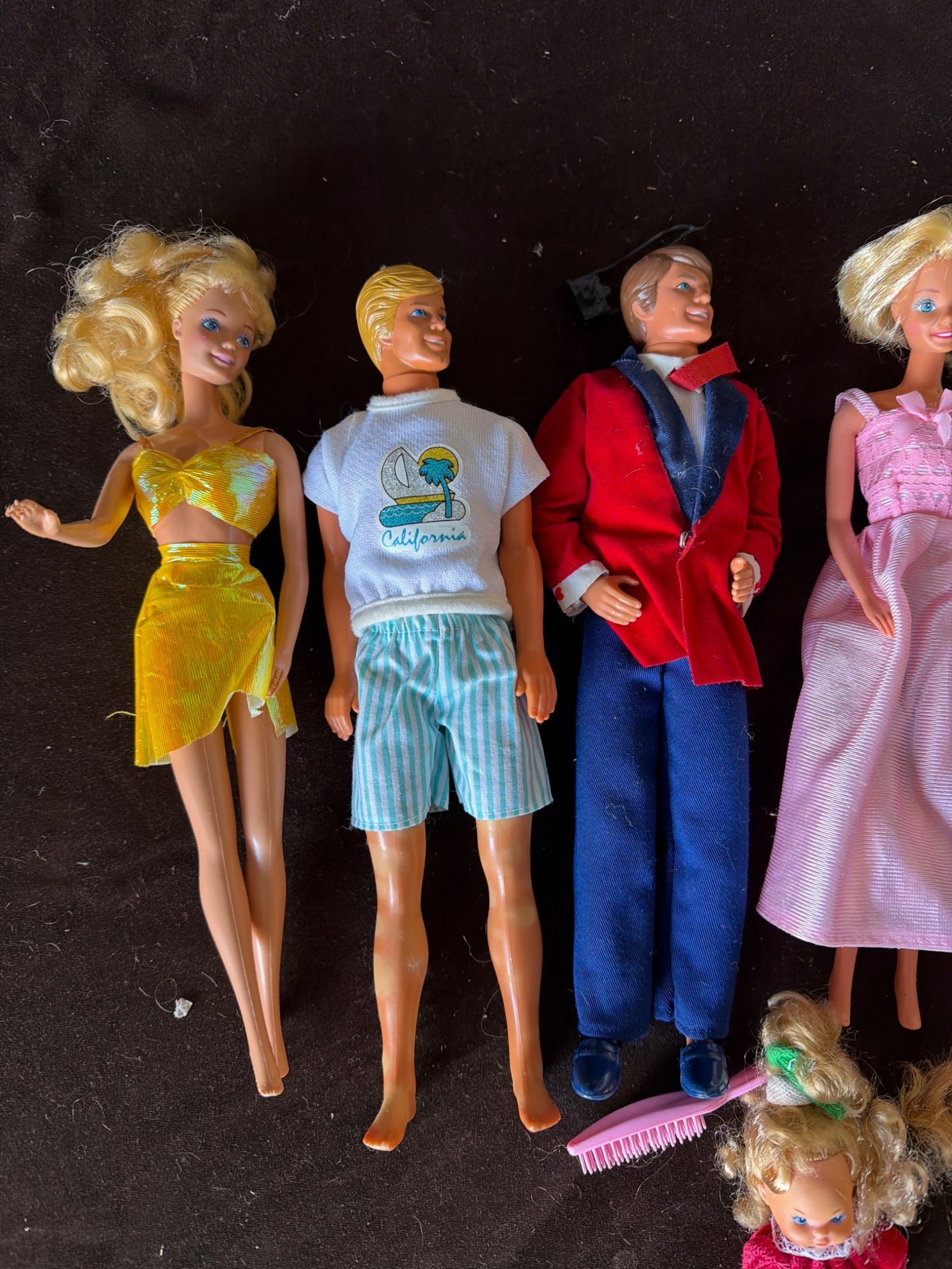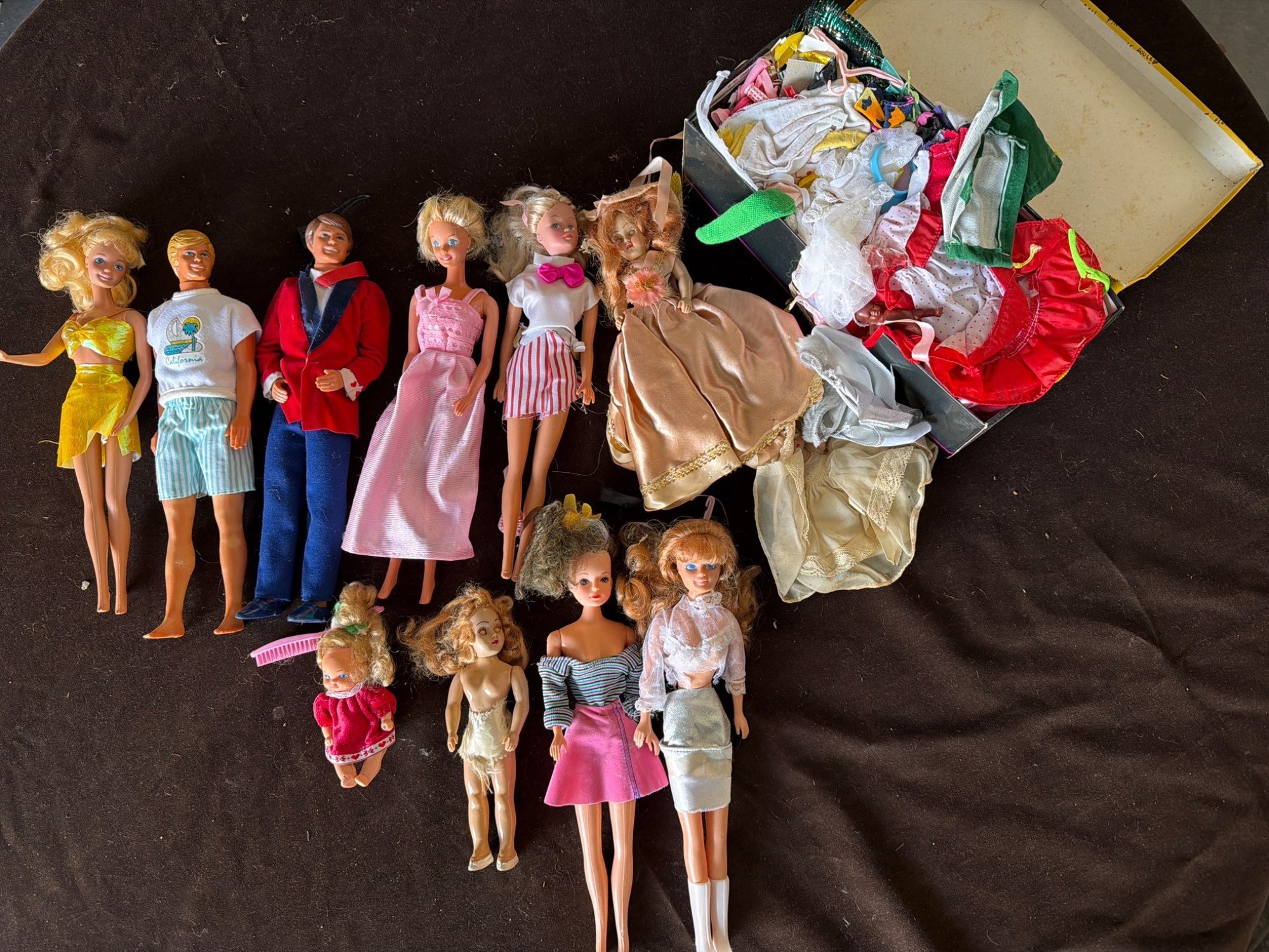 Barbie and Ken dolls, including vintage styles and clothing. Some items are marked Mattel, dated 1983 on the male doll’s neck. Included are an assortment of outfits and accessories stored in a box. Dolls and clothing vary in condition. Measurements are not provided.