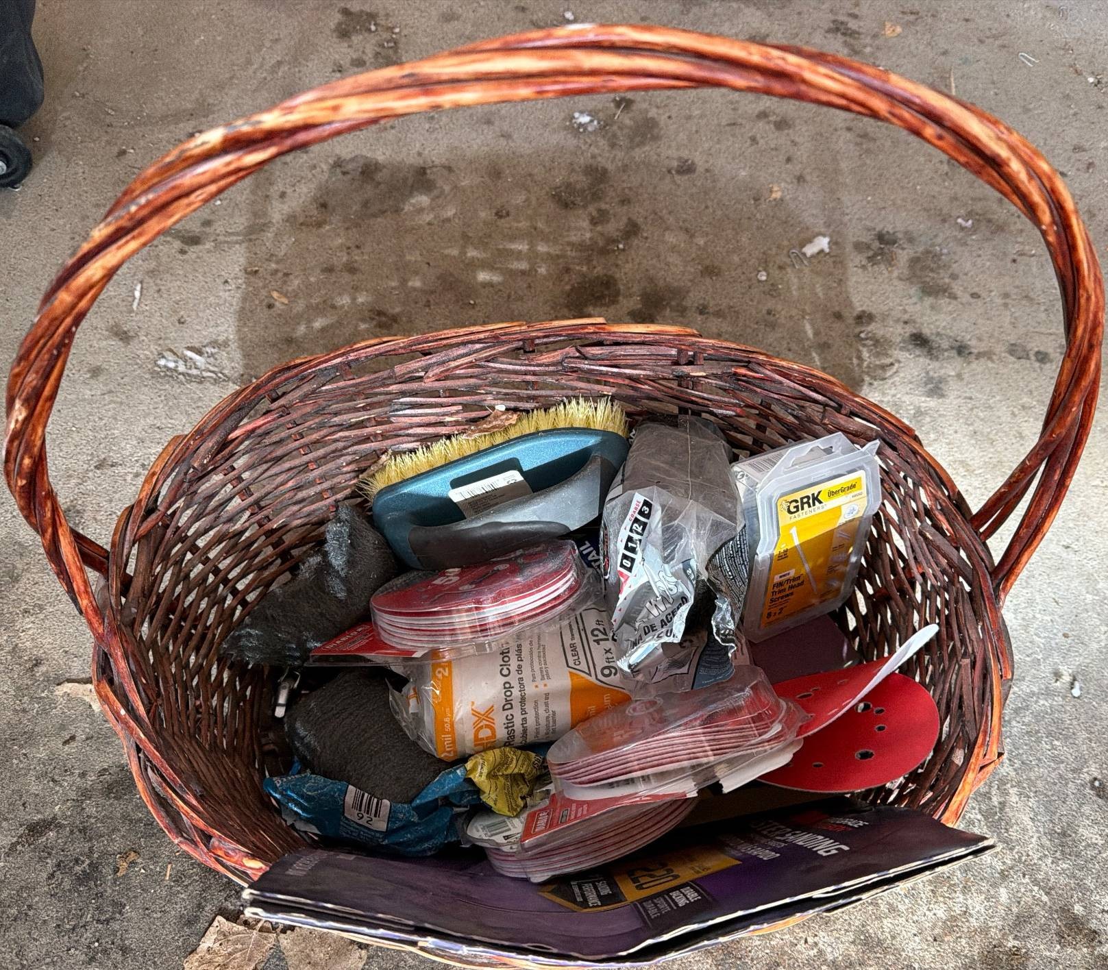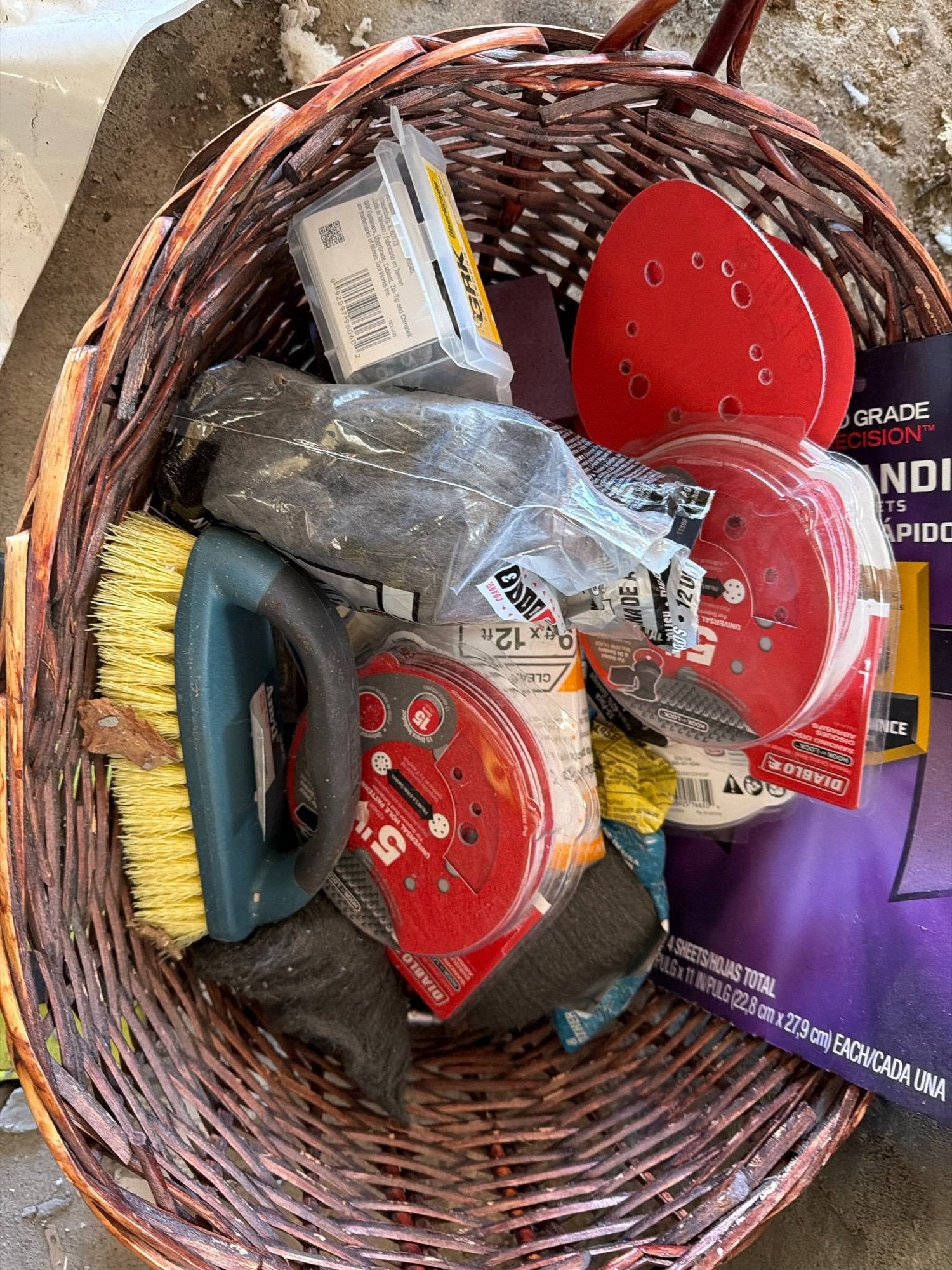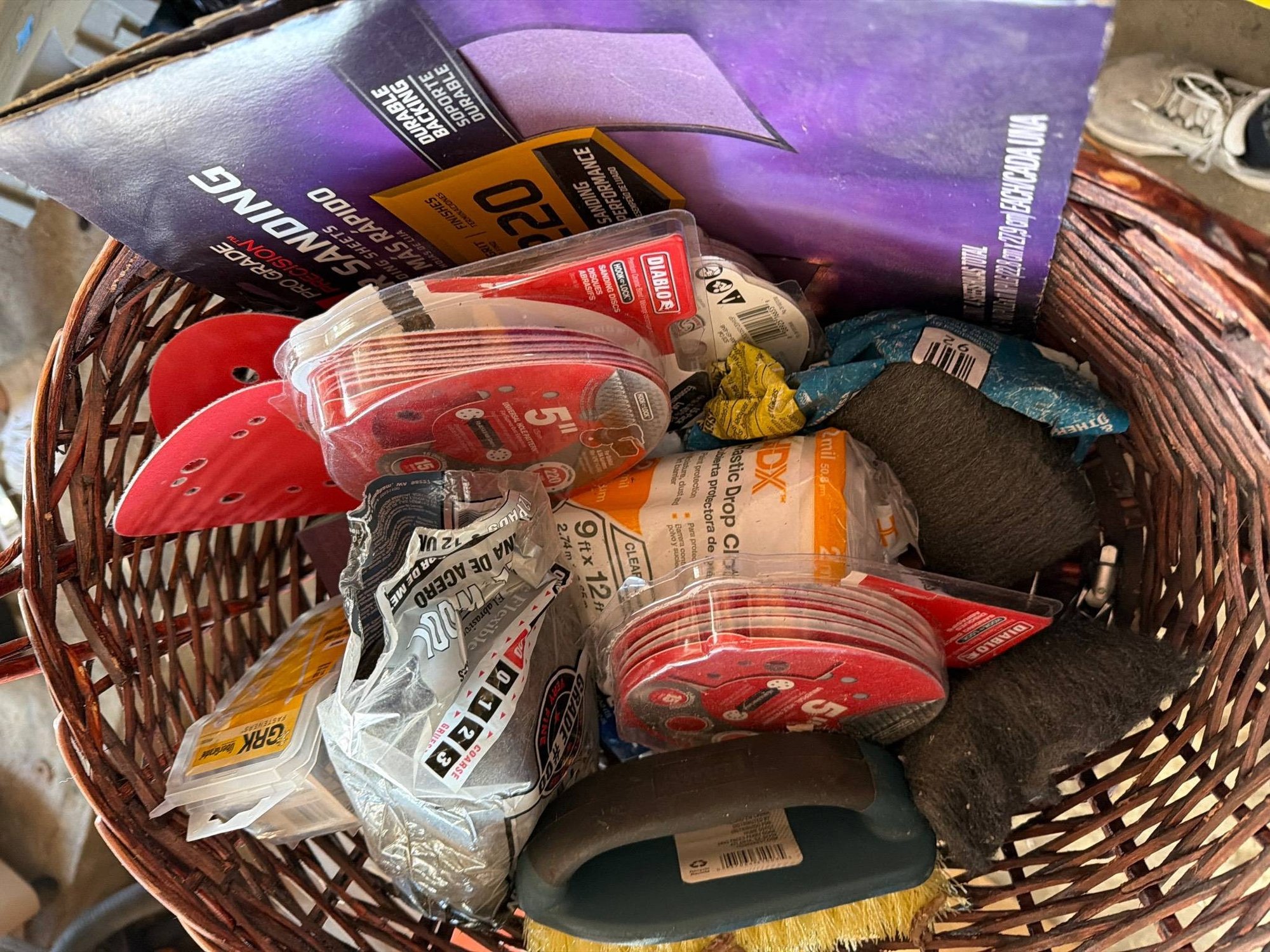 A woven basket containing a variety of tools and surface preparation supplies, including multiple packs of sanding discs (5-inch with 8 holes, varying grits), steel wool pads, a yellow and green cleaning brush, adhesive hooks in packaging, and other handheld accessories. Measurements of the basket are approximately 22 inches in length, 12 inches in width, and 10 inches in height.