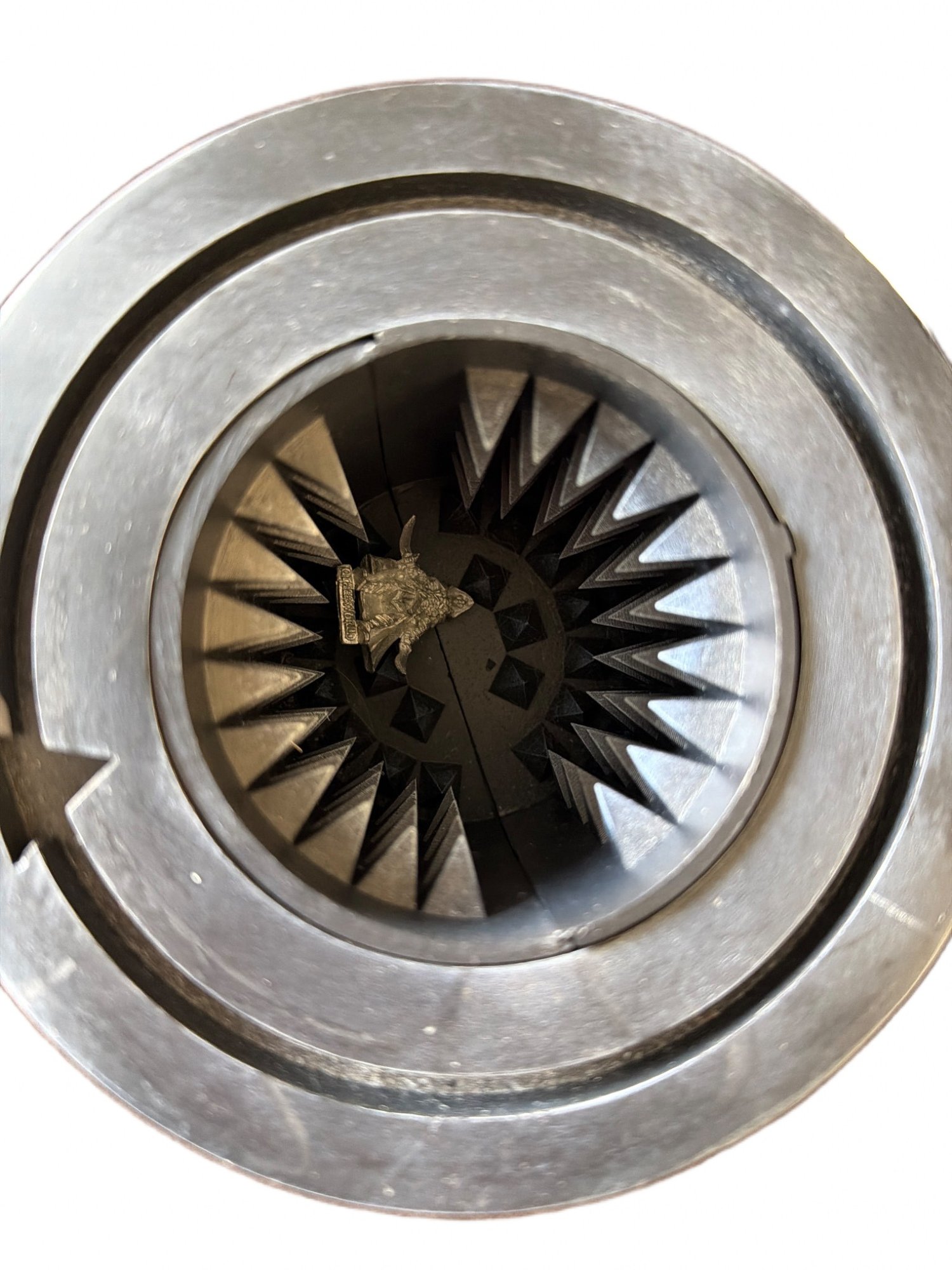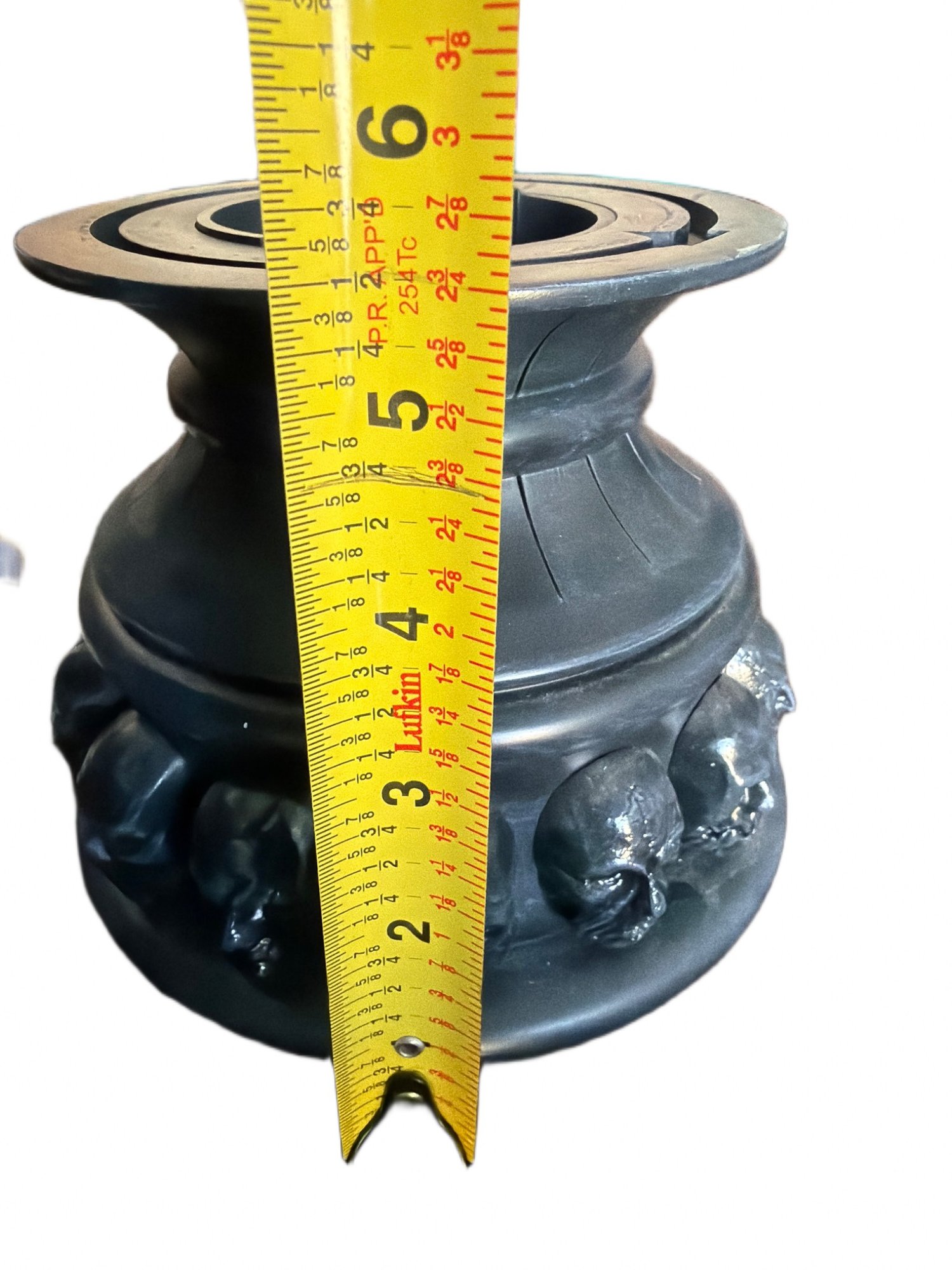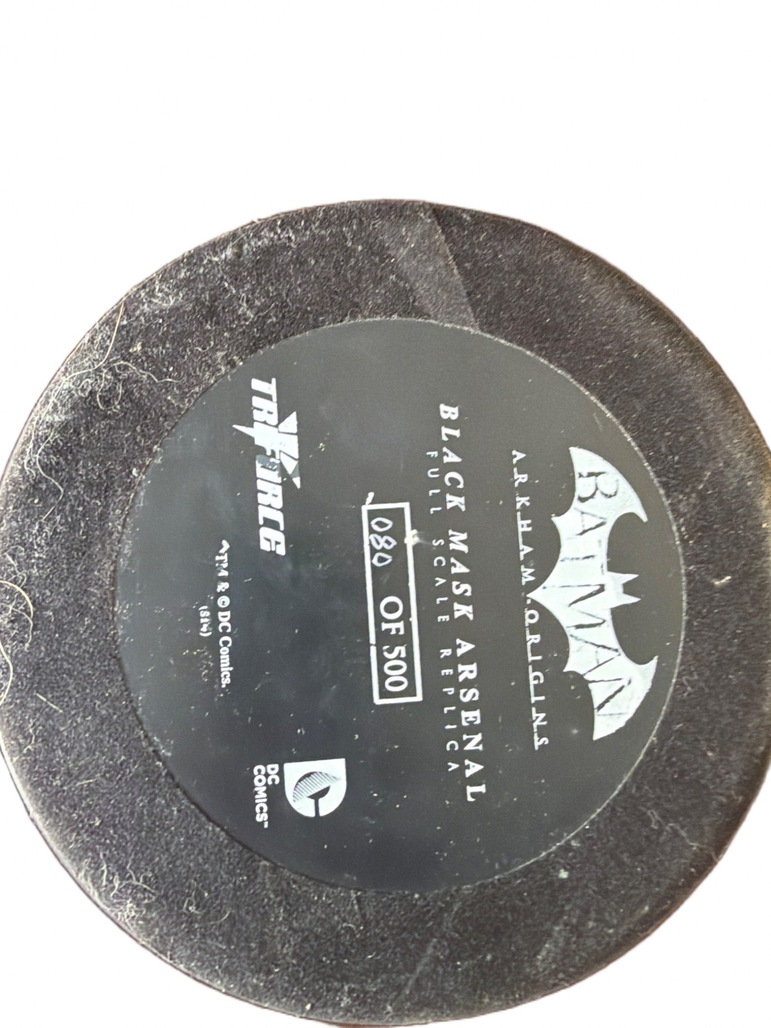 Batman Arkham Origins Black Mask Arsenal prop replica manufactured by Triforce. This collectible is a limited edition, marked as 188 of 500. Made of durable materials, its design features intricate skull detailing and sharp interior elements. Measurements: approximately 6.5 inches in height.