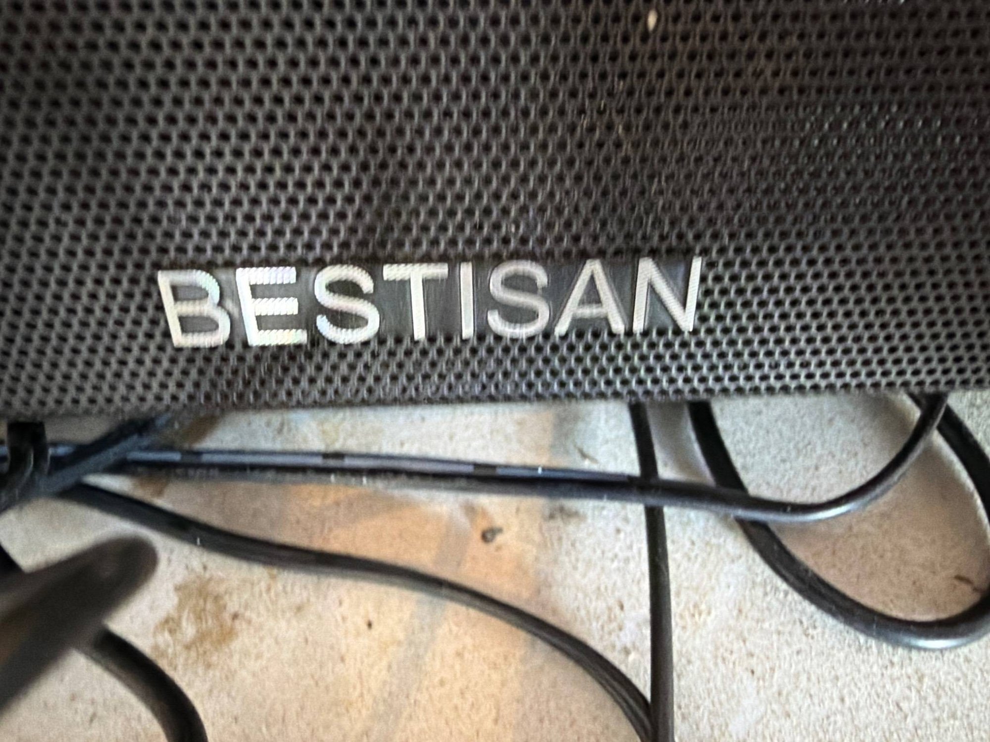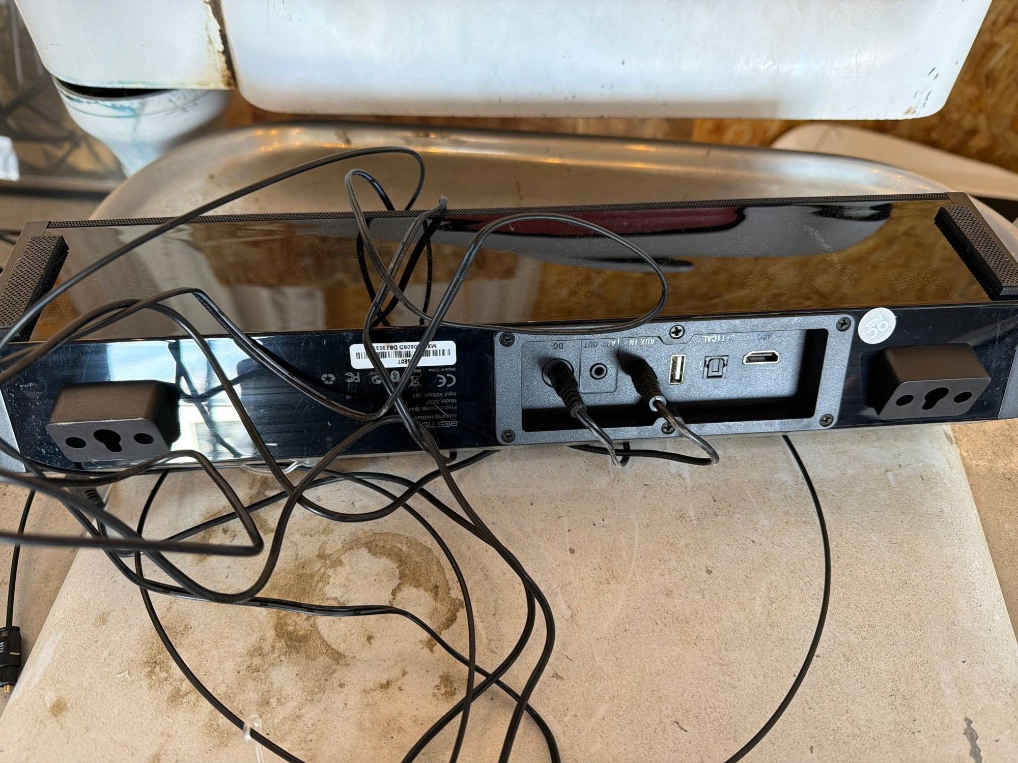 Bestisan soundbar featuring a compact, rectangular design with a control panel and multiple input options, including USB and optical connections. The soundbar includes the power adapter and connecting cables, as shown. Black finish with a textured grille and a gloss-like top surface. Dimensions approximately 23 inches wide by 3 inches deep by 4 inches tall.