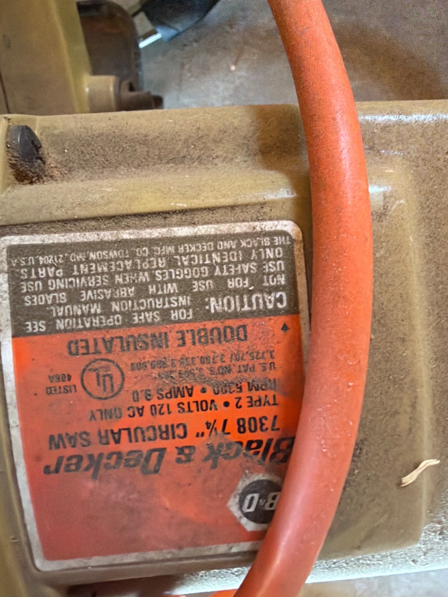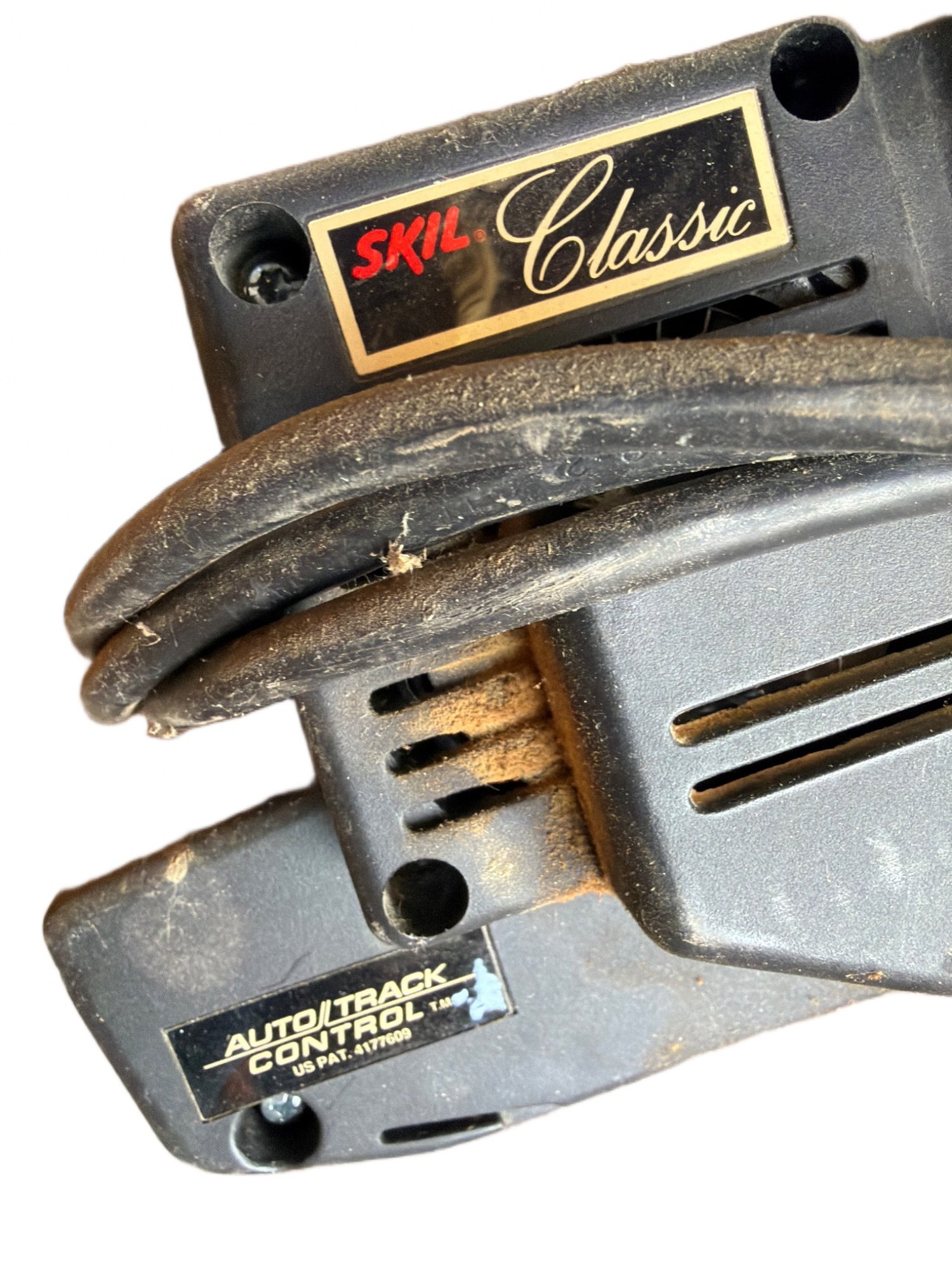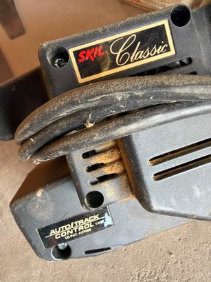 This listing includes a Black & Decker 7308 7 1/4-inch circular saw with a double-insulated design and a Skil Classic tool with Auto Track Control (patent 4,775,080). The Black & Decker saw operates at 120V AC and has a Type 2 designation. Both tools show visible wear consistent with use and may require servicing. Sold as-is.
