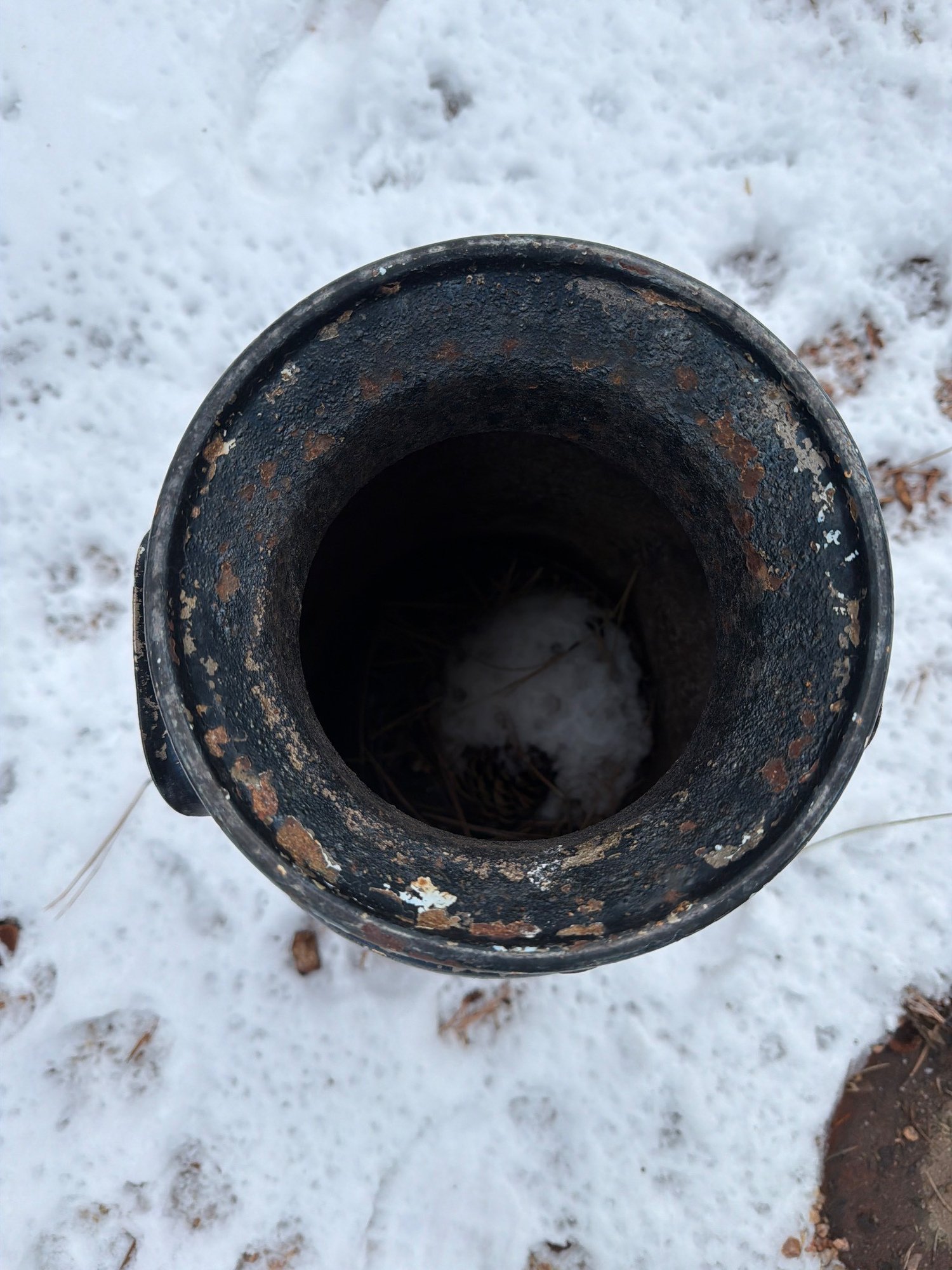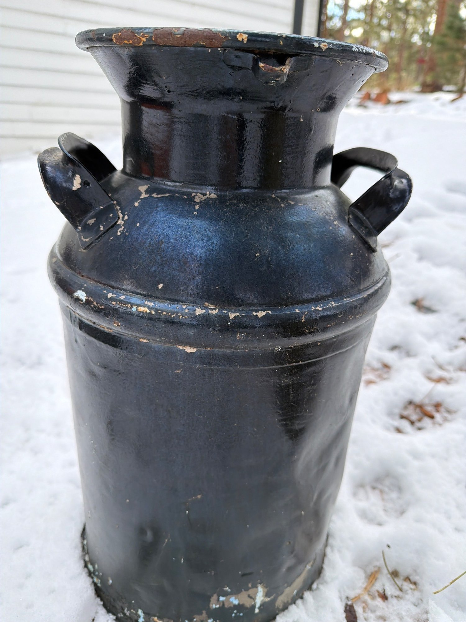 Black-painted metal milk can featuring a cylindrical body, wide neck with rolled rim, and two side handles for carrying. The paint shows signs of chipping and wear, with rust visible on the interior and around the rim. Suitable for decoration or rustic-themed spaces. Height is approximately 20 inches, and diameter is 10 inches.