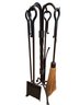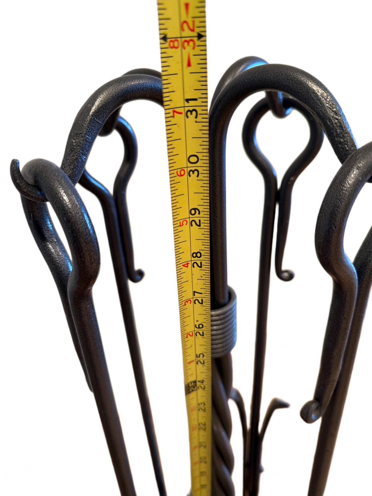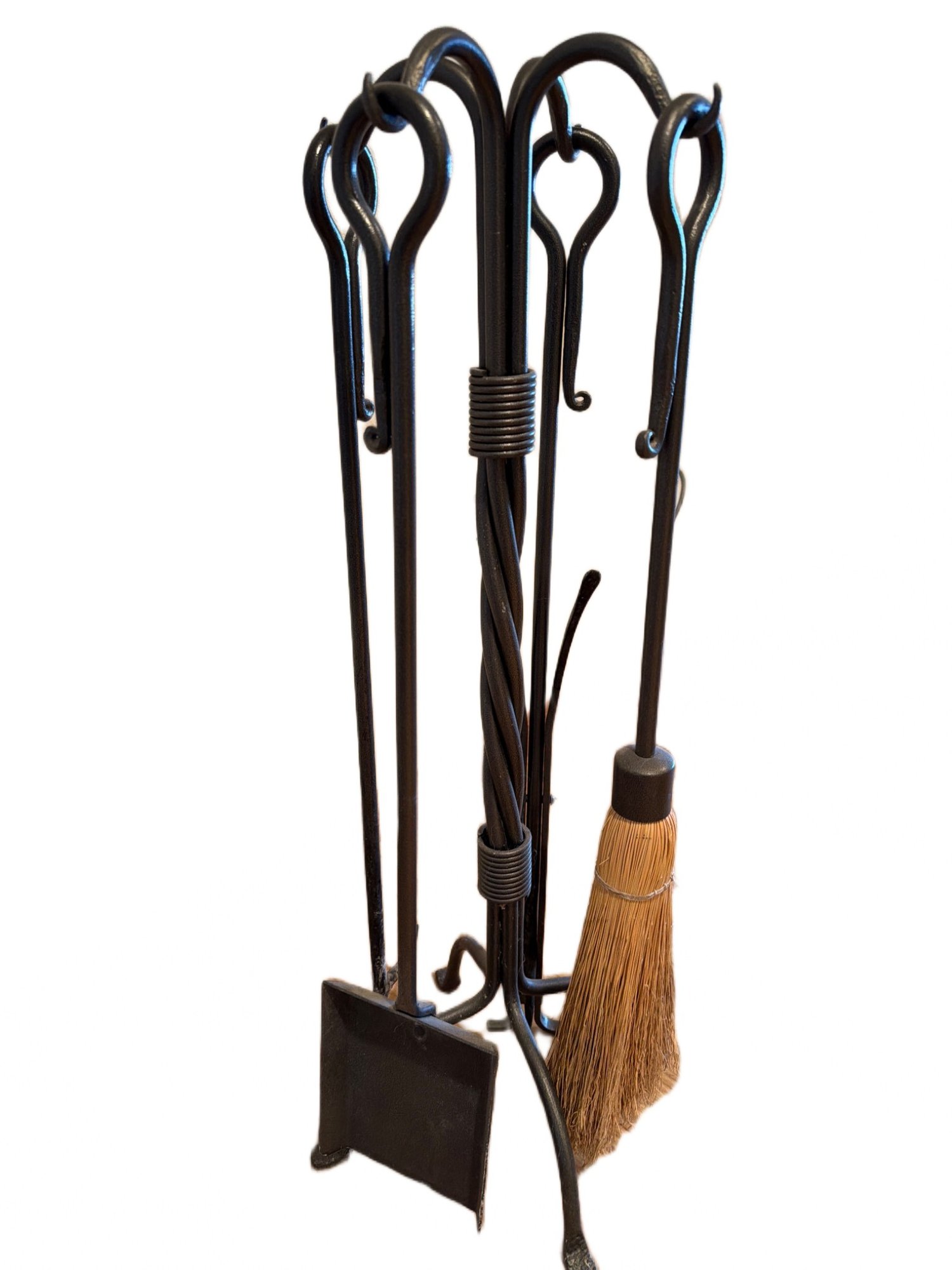 This set includes essential fireplace tools: broom, poker, shovel, and tongs. Made of sturdy black wrought iron, the set stands approximately 30 inches tall on a matching holder with a twisted metal design. The tools have hanging rings for organization on the stand. Ideal for fireplace maintenance.