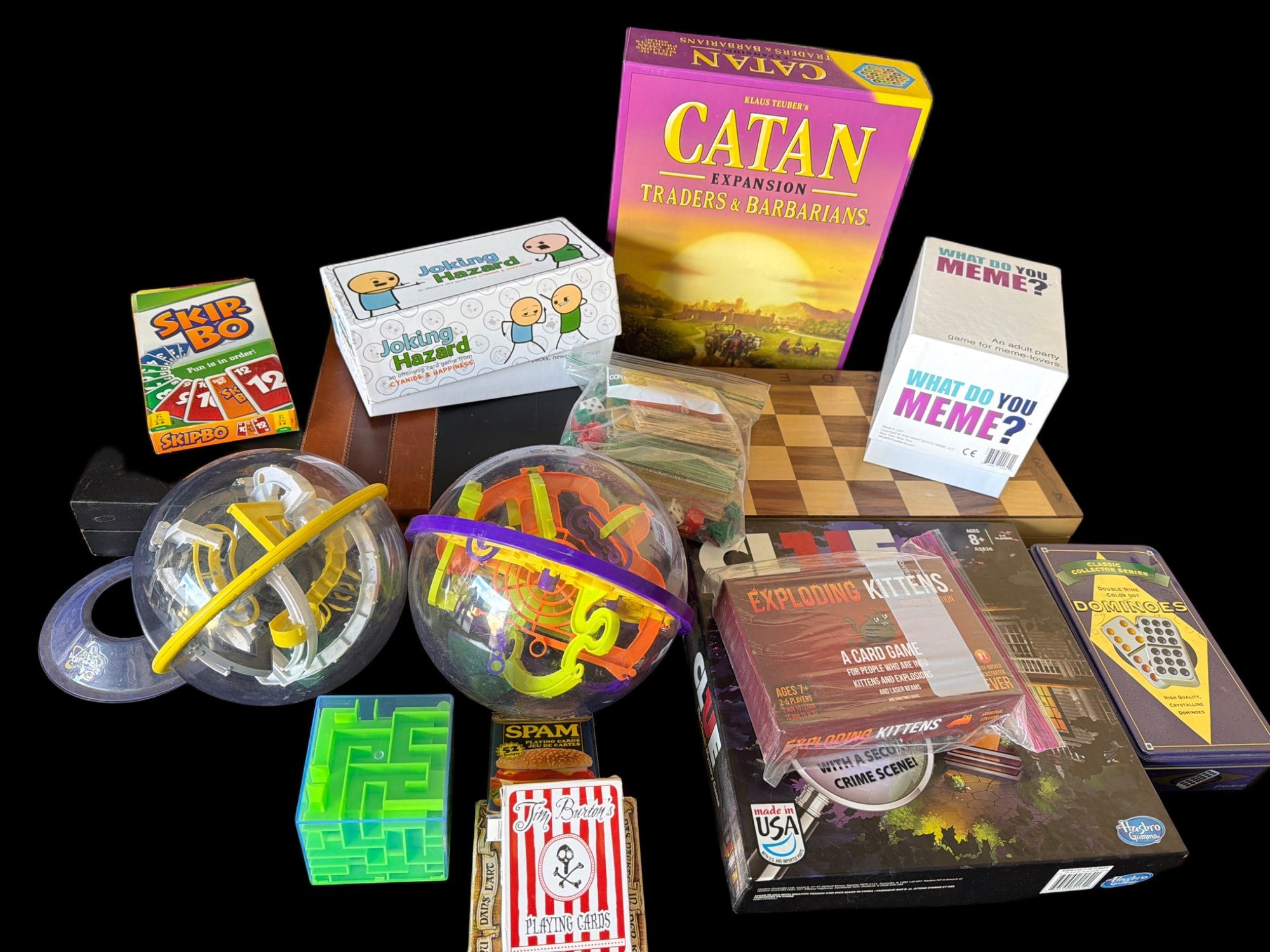 Various board games and puzzles, including the Catan expansion 'Traders & Barbarians,' 'What Do You Meme,' 'Chippo,' a Spam-themed slot machine game, and others. Includes two spherical puzzle balls, a chess and checkers wooden game set, and a green maze puzzle. A range of card and board game types are featured, catering to a variety of ages and interests.
