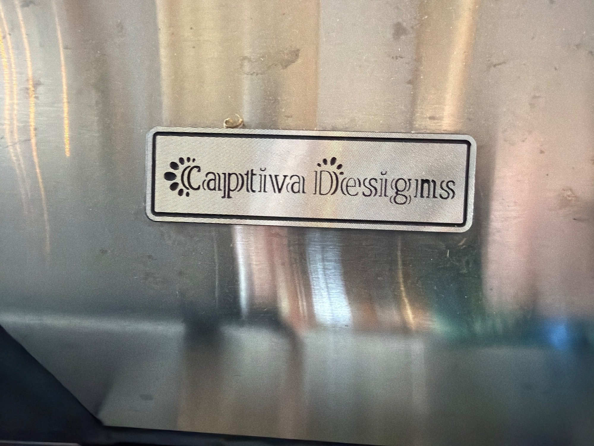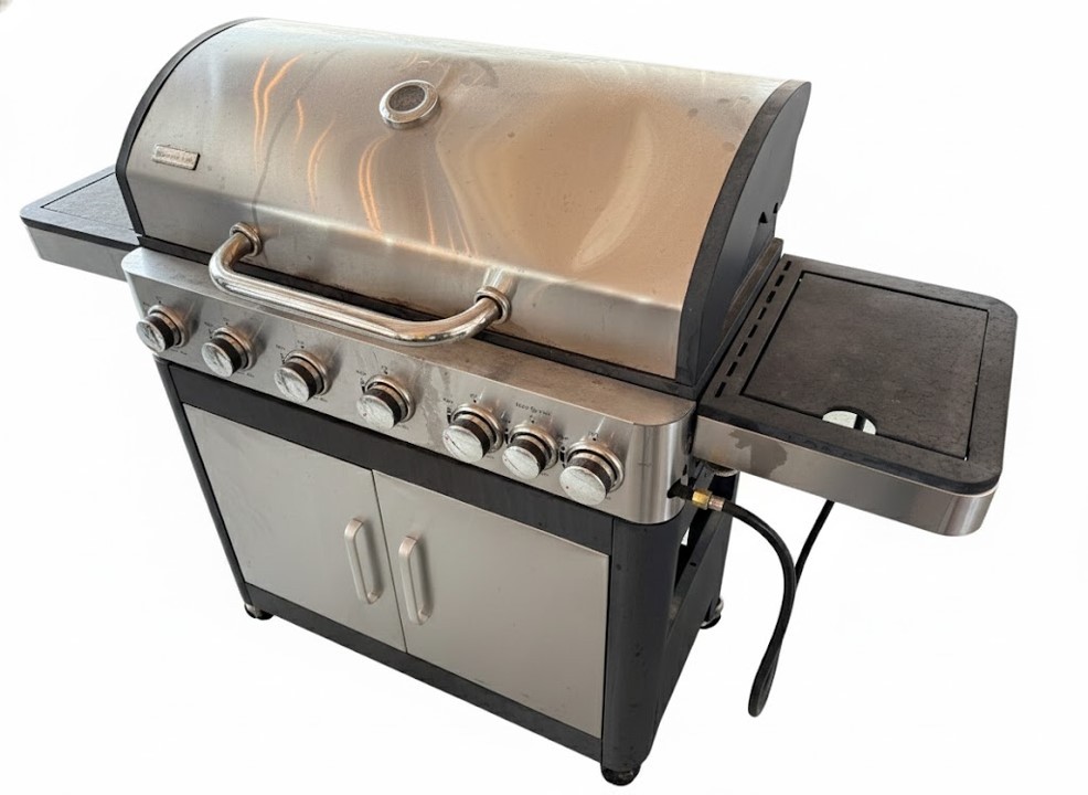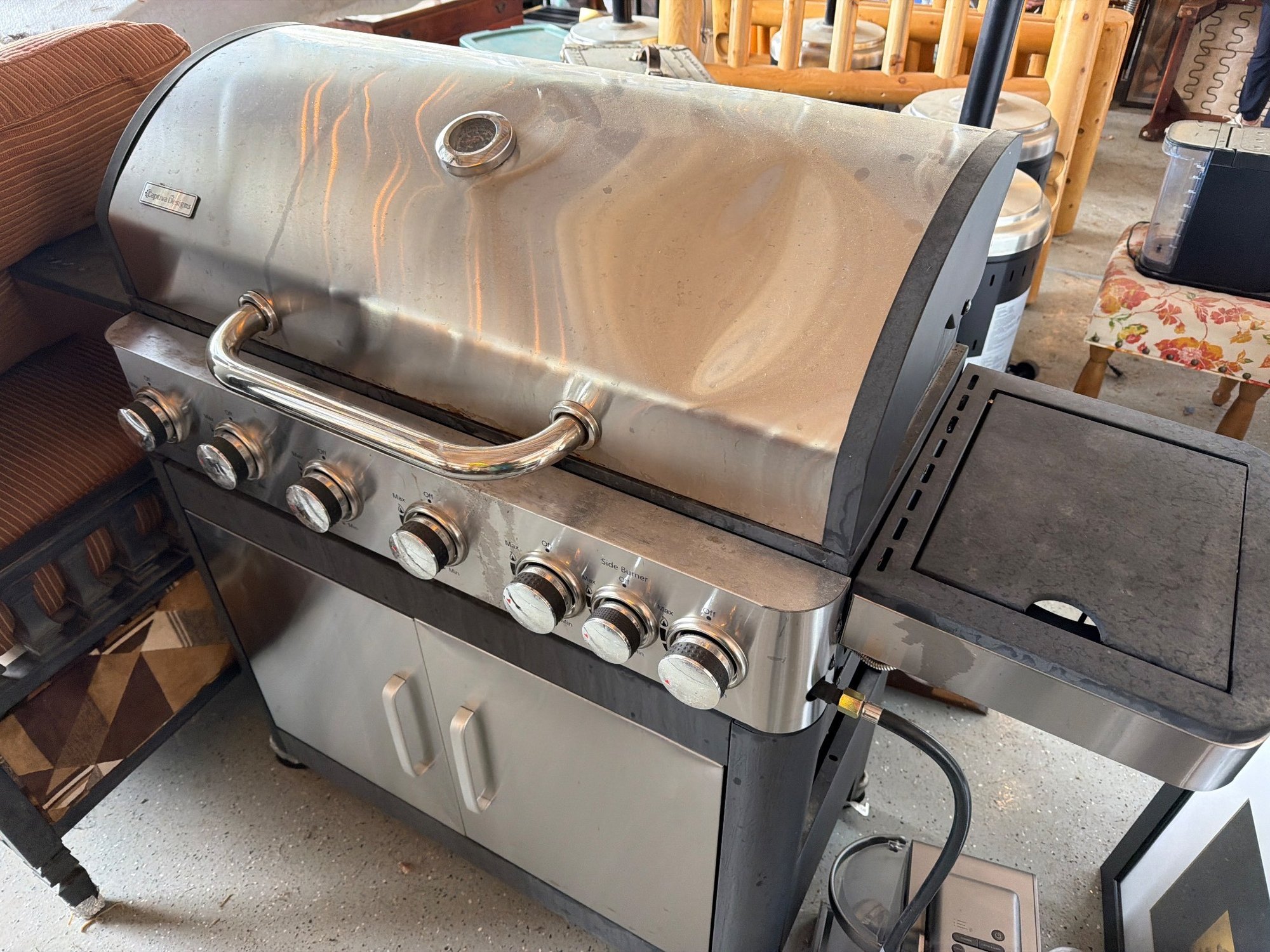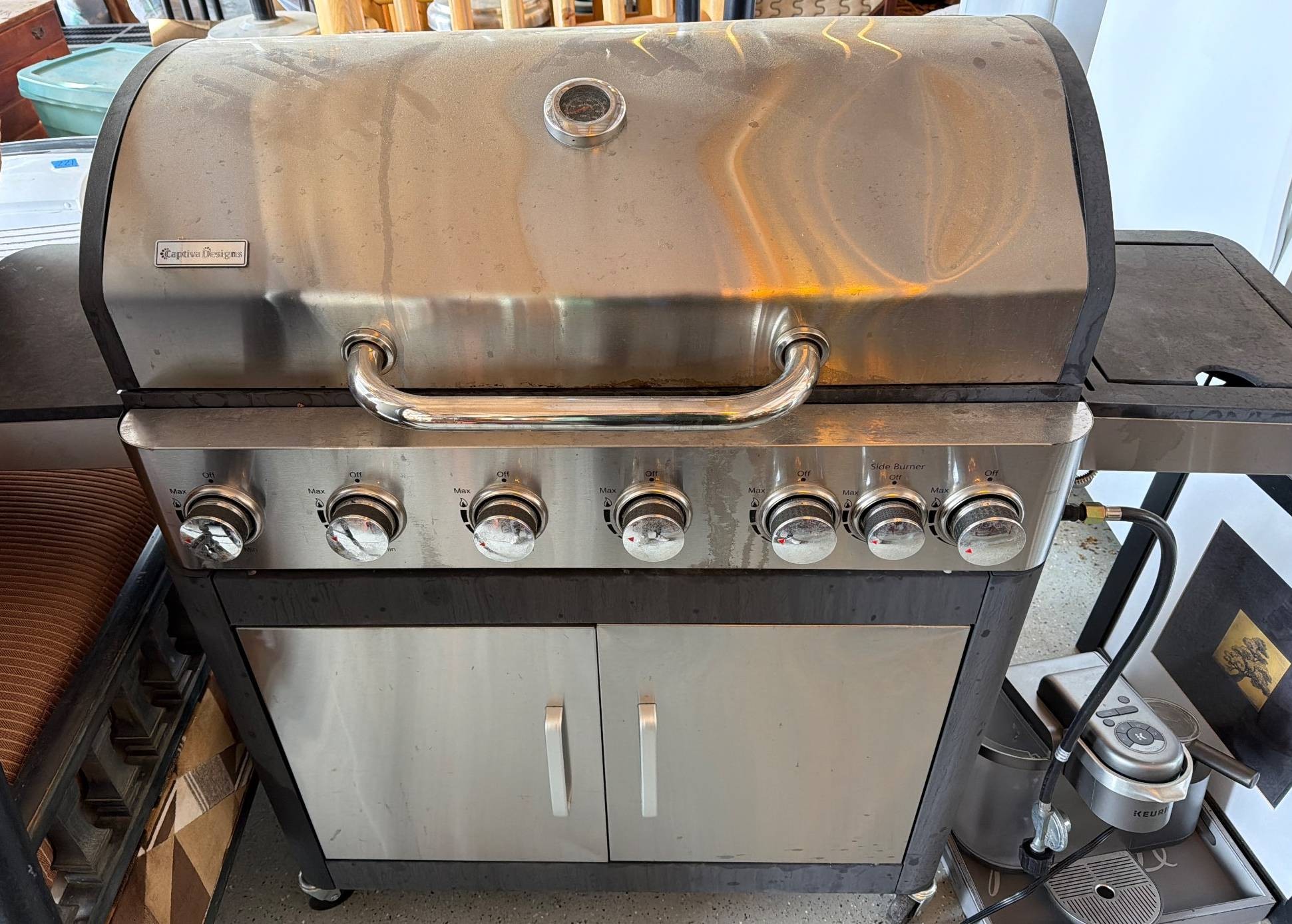 Captiva Designs stainless steel gas grill featuring six primary burners and one side burner. Equipped with a temperature gauge on the lid, side folding shelves, and storage compartment with double doors underneath. Constructed with stainless steel and black metal accents. Dimensions: approximately 60 inches wide, 24 inches deep, and 47 inches high.