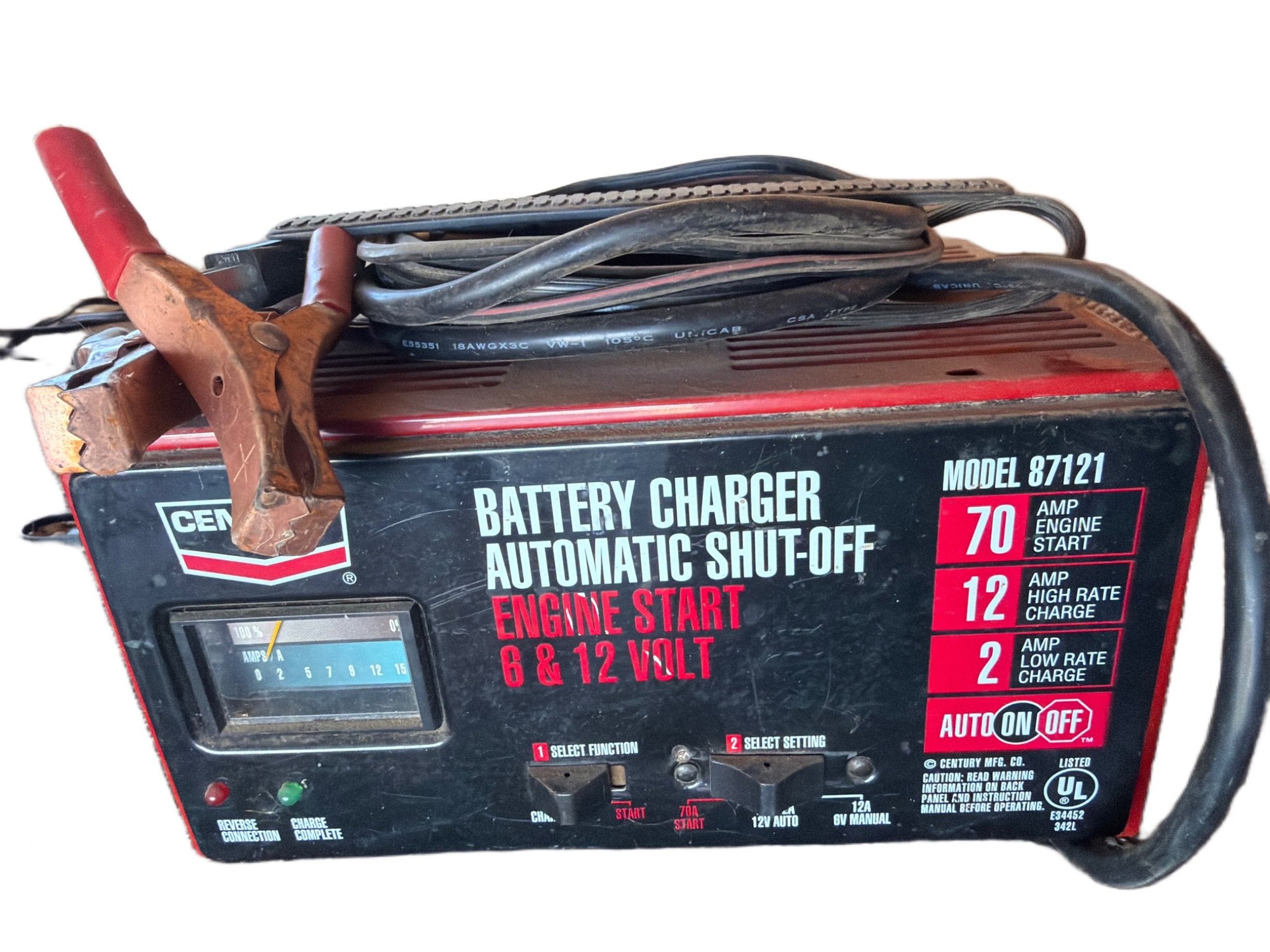 Cen-Tech battery charger with model number 87121, featuring automatic shut-off functionality and the capability to charge 6-volt and 12-volt batteries. It includes a 70-amp engine start setting, 12-amp high-rate charge setting, and 2-amp low-rate charge setting. The unit is UL certified and features indicator lights for ease of use.