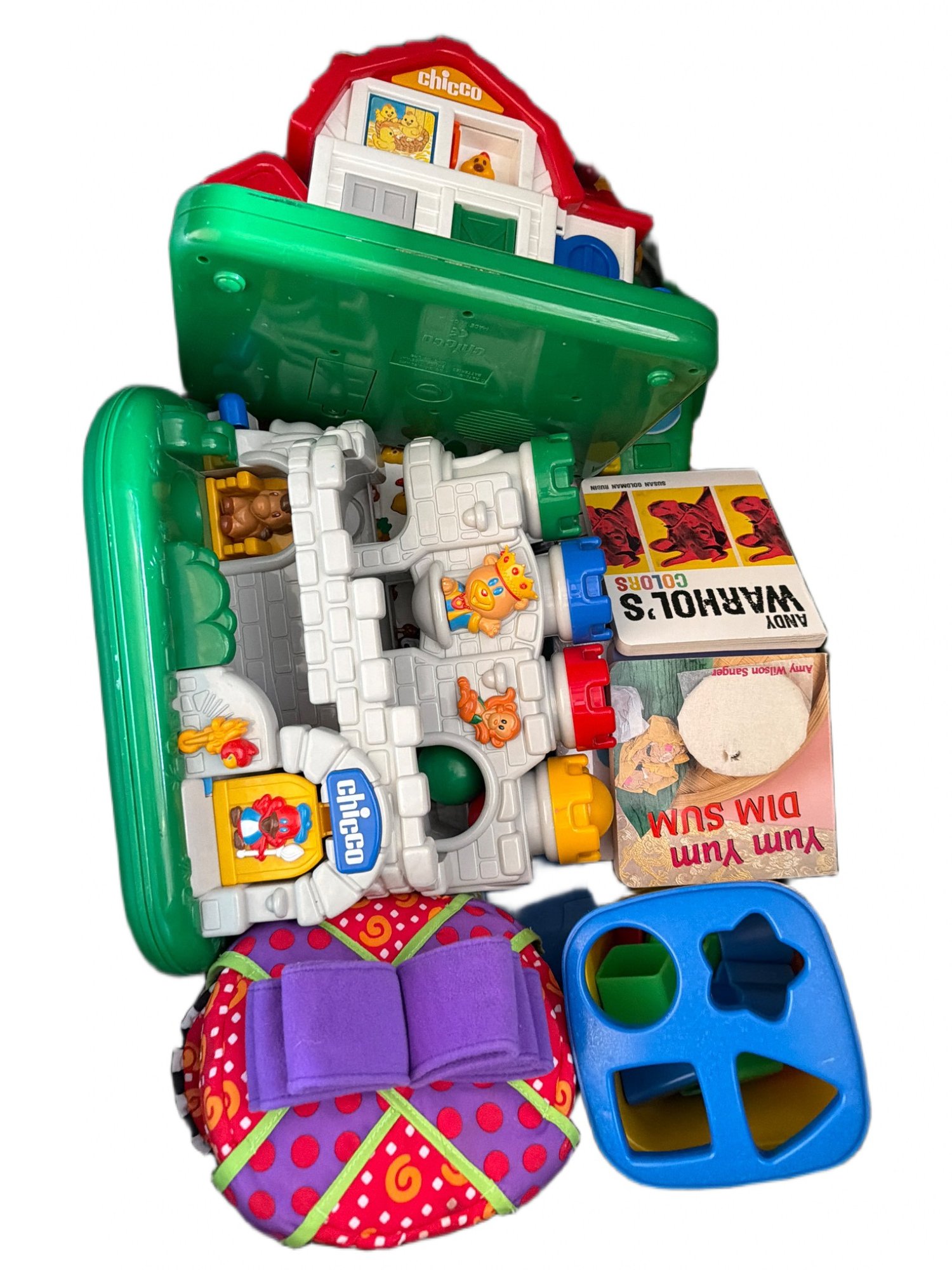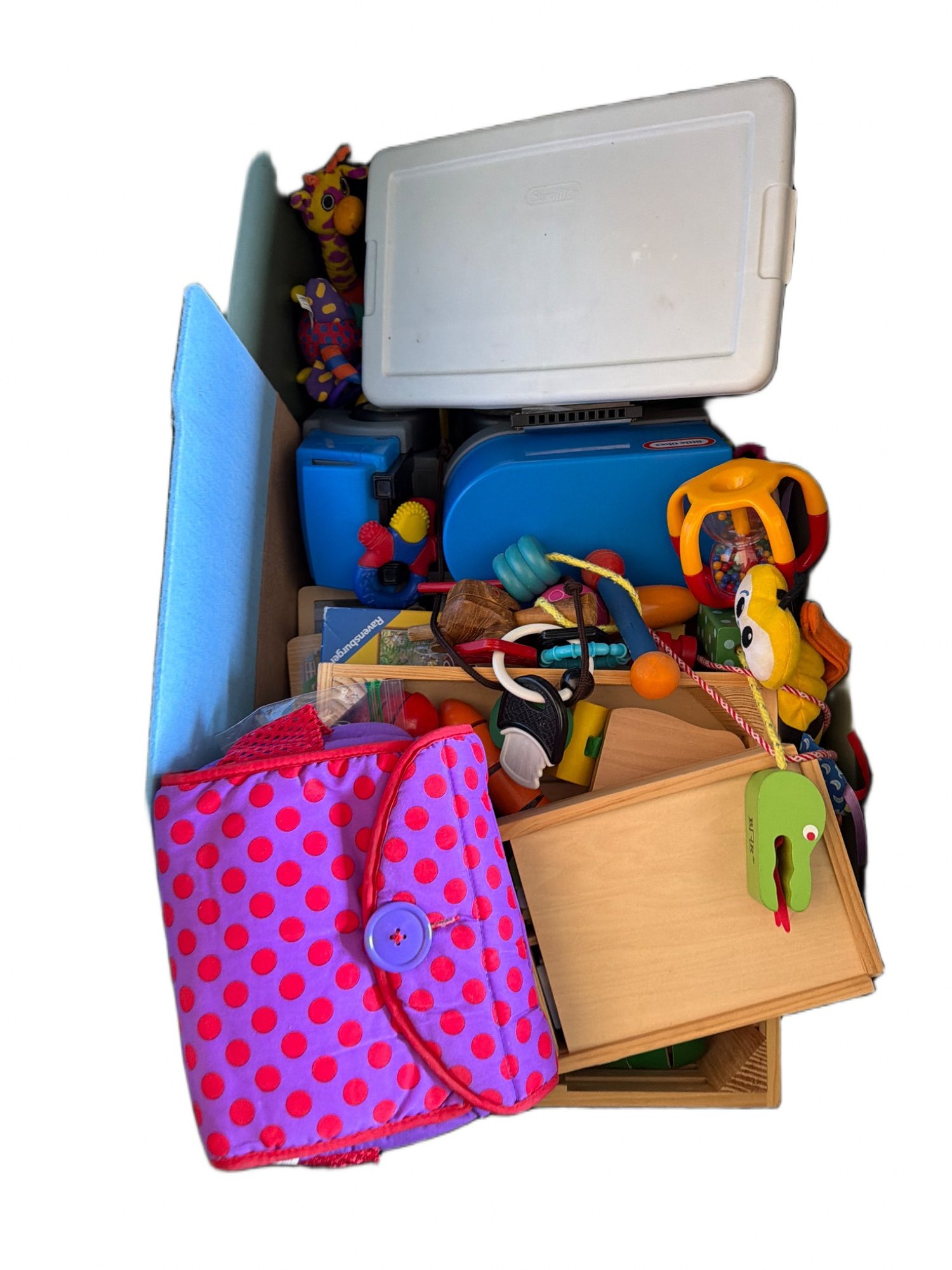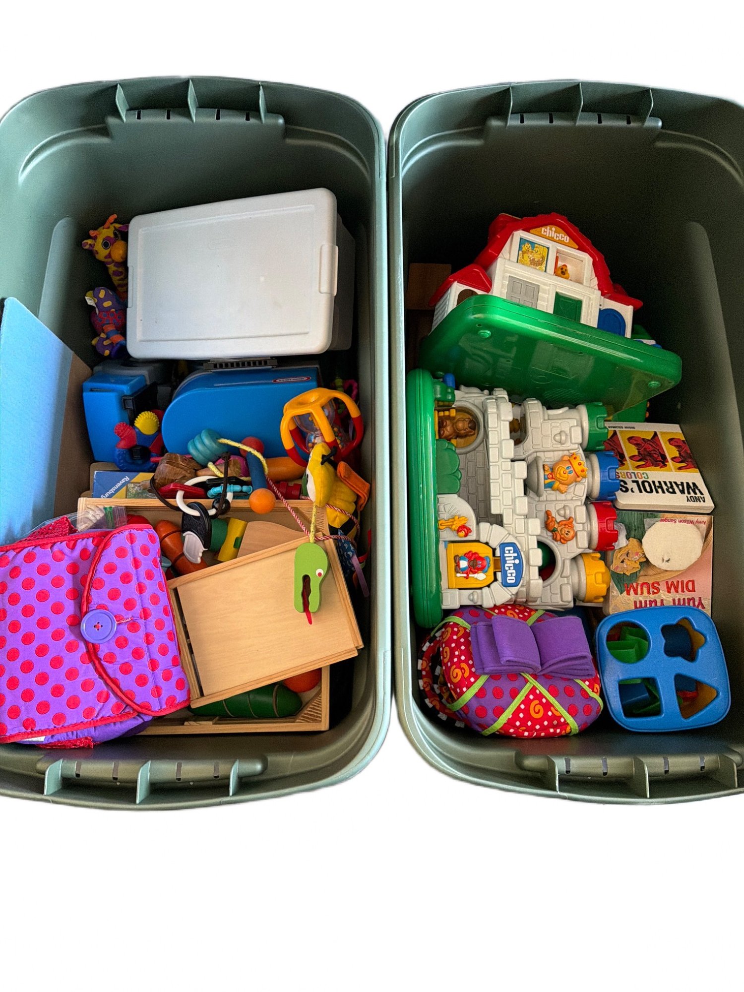Children's toys contained in two plastic storage bins. Includes Fisher-Price Little People playsets, interactive toys, wooden puzzles, books, and various smaller items. All items are pre-owned and appear to be in various conditions. Dimensions of the bins and toys are not specified.
