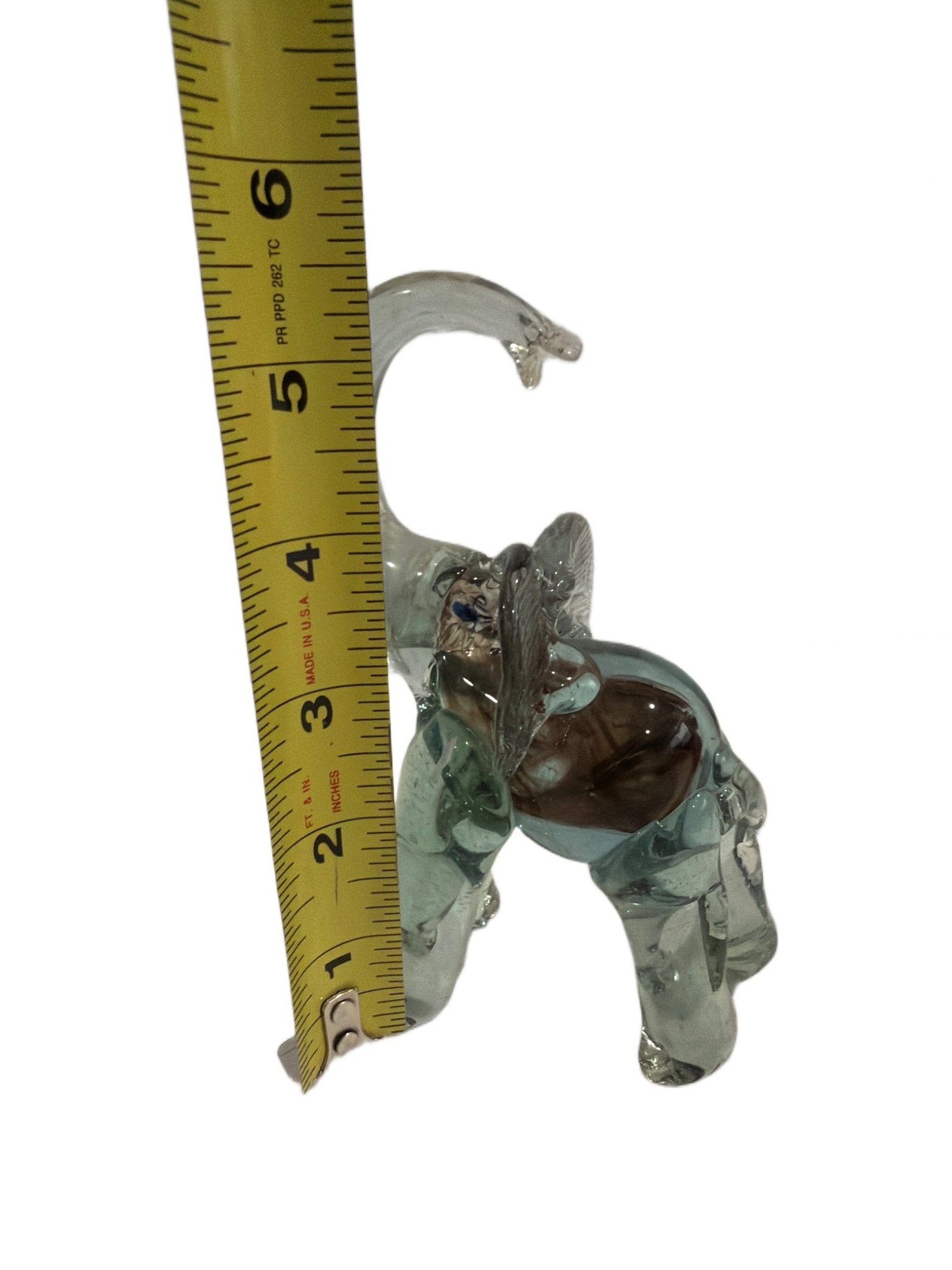 Glass elephant figurine crafted from clear glass with an internal blend of colored glass accents. Detailed features include an upward-curved trunk, defined ears, and textured body. Measures approximately 5.5 inches tall and 3 inches wide.