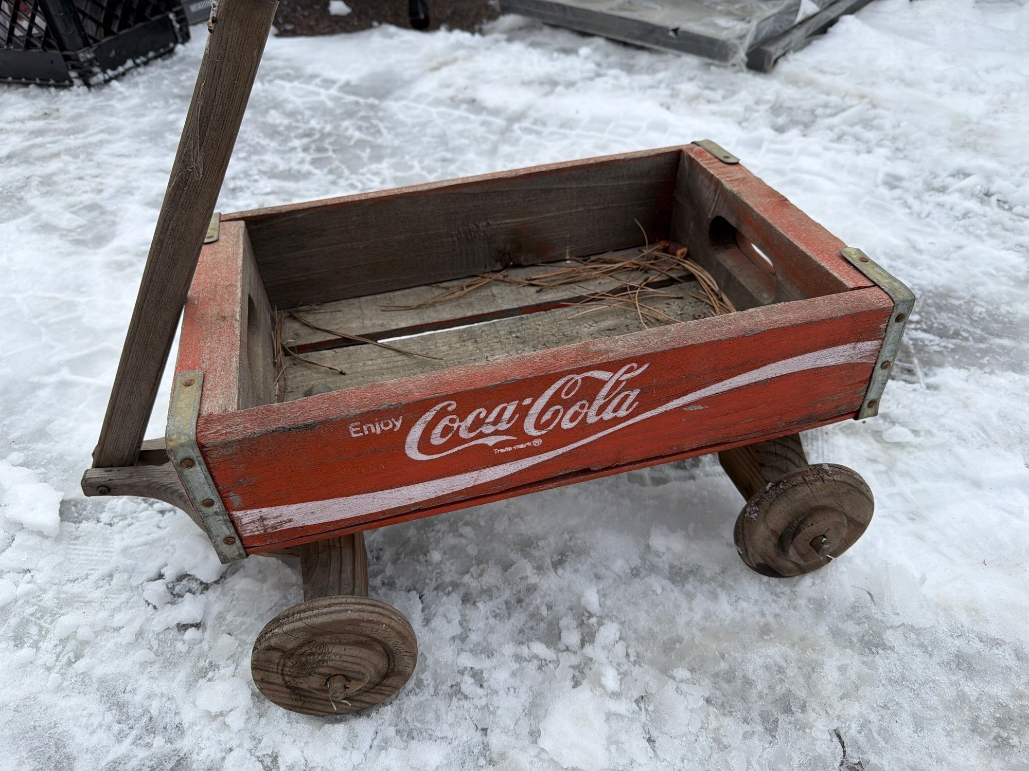 Coca-Cola branded wooden toy wagon with a rectangular body featuring the iconic ‘Enjoy Coca-Cola’ logo printed on both sides. The wagon is supported by four wooden wheels and has a wooden pull handle attached to a metal bracket. Visible signs of wear, including paint fading and structural aging, consistent with prolonged use. Approximate dimensions are 24 in long, 12 in wide, and 10 in high.