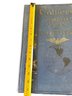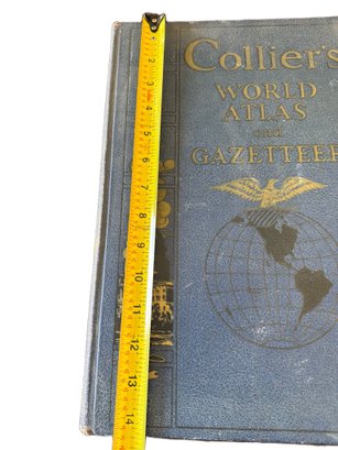 Collier's World Atlas and Gazetteer hardcover book featuring its recognizable blue and gold embossed cover. Likely from the early 20th century, this atlas includes beautifully detailed maps and geographical information. The book measures approximately 13.5 inches in height.