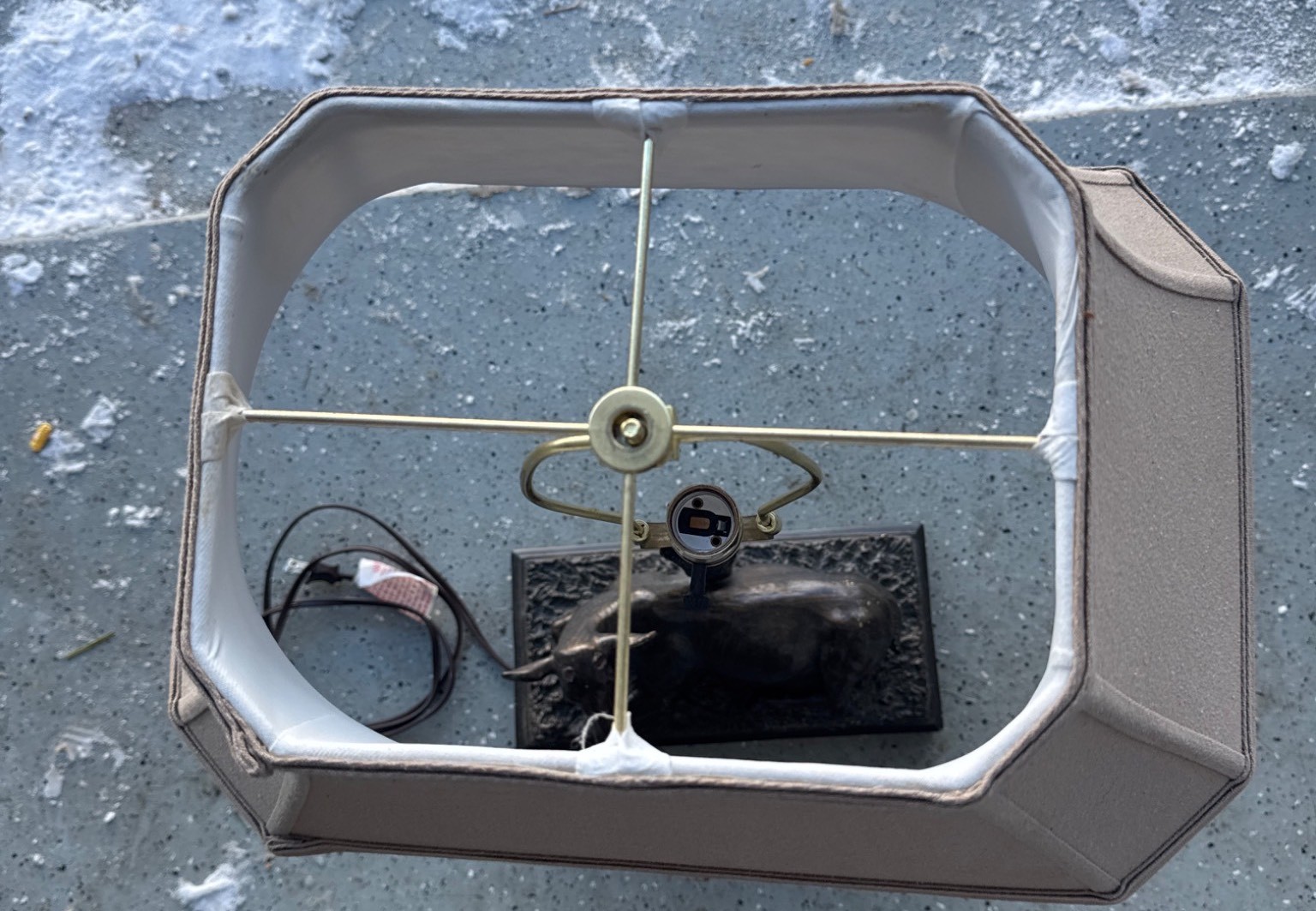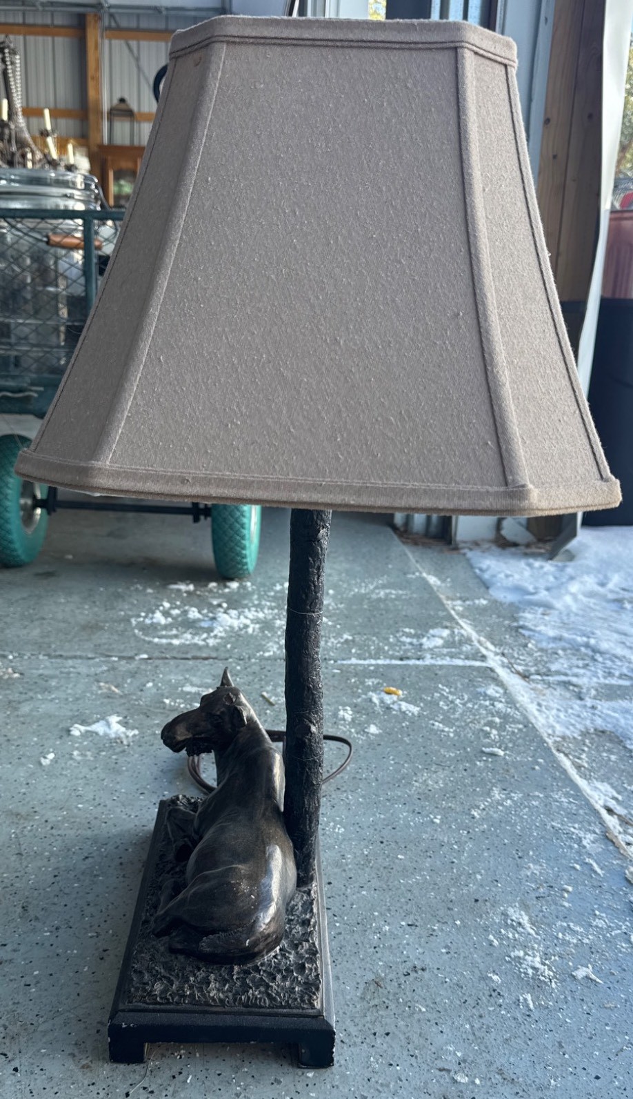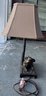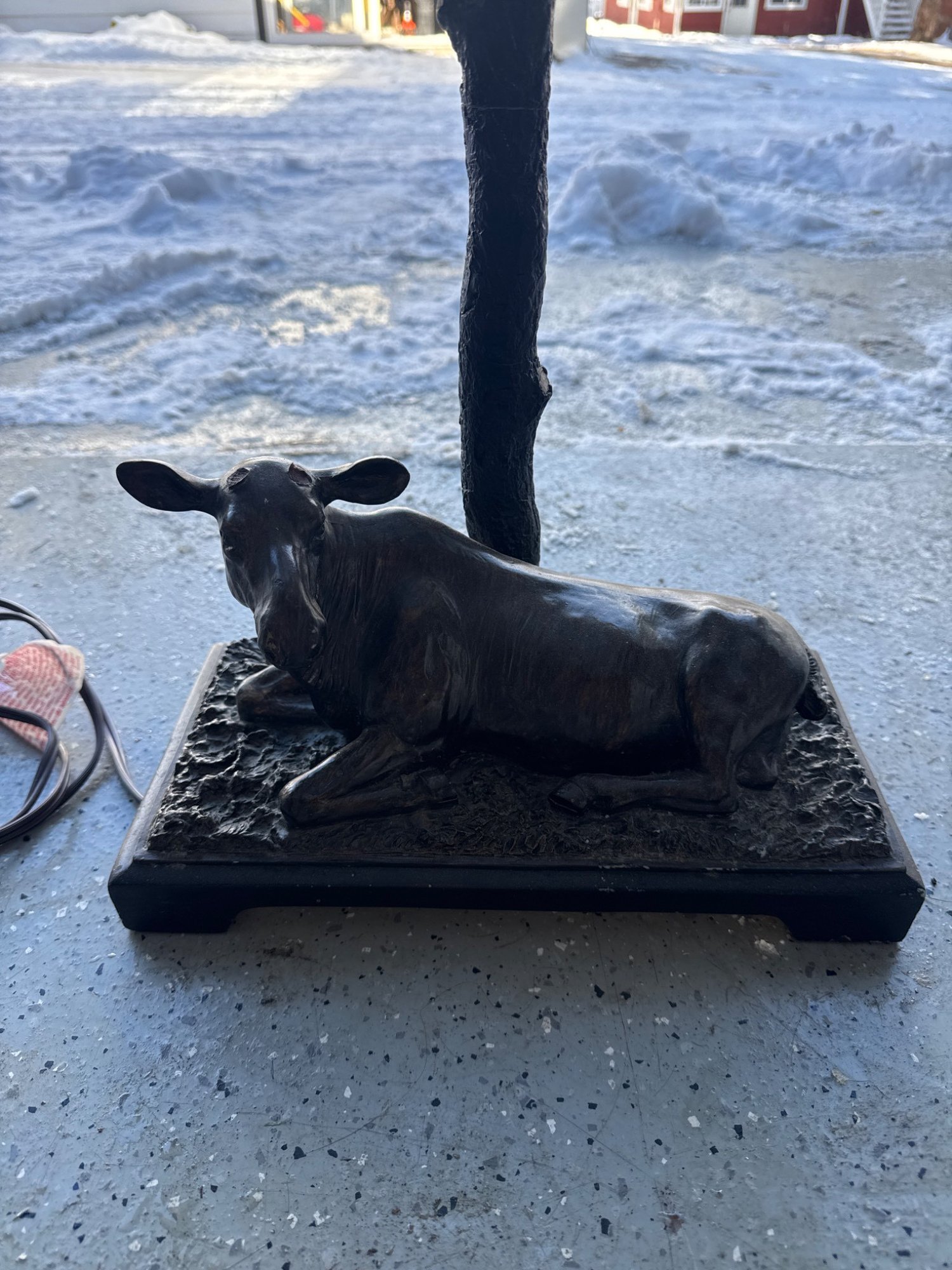 Table lamp featuring a cow figurine lying on a textured rectangular base, supporting a design resembling a tree trunk as the lamp stem. Includes a taupe-colored fabric shade with a rectangular profile. The lamp is wired for electrical use, with visible cord included. Shows moderate wear consistent with use. Dimensions: Base approximately 9 inches wide, total height approximately 20 inches.