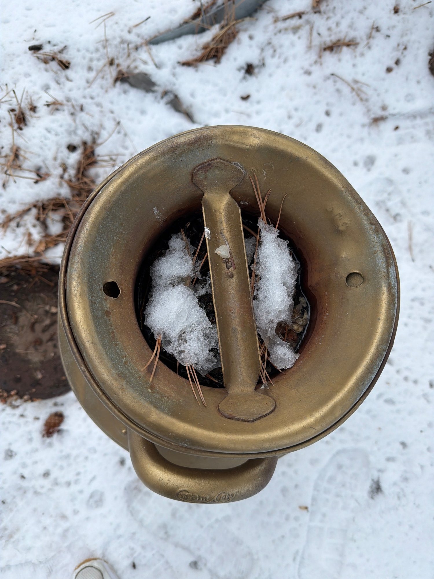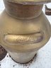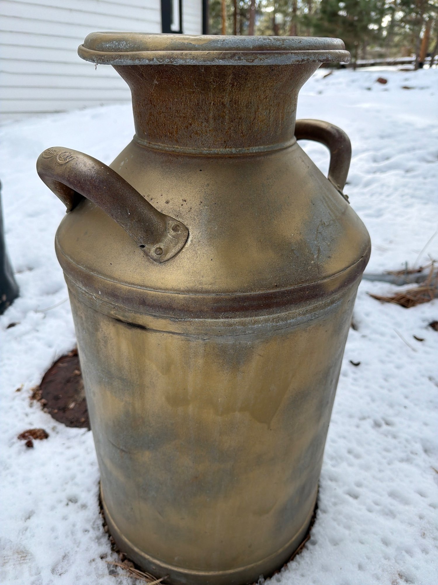 Cream City milk can featuring a brass-tone finish and embossed branding on the handle. Designed with two sturdy side handles and a top opening with a central bar. The finish shows signs of weathering consistent with outdoor exposure. Dimensions: approximately 22 inches in height and 12 inches in diameter.