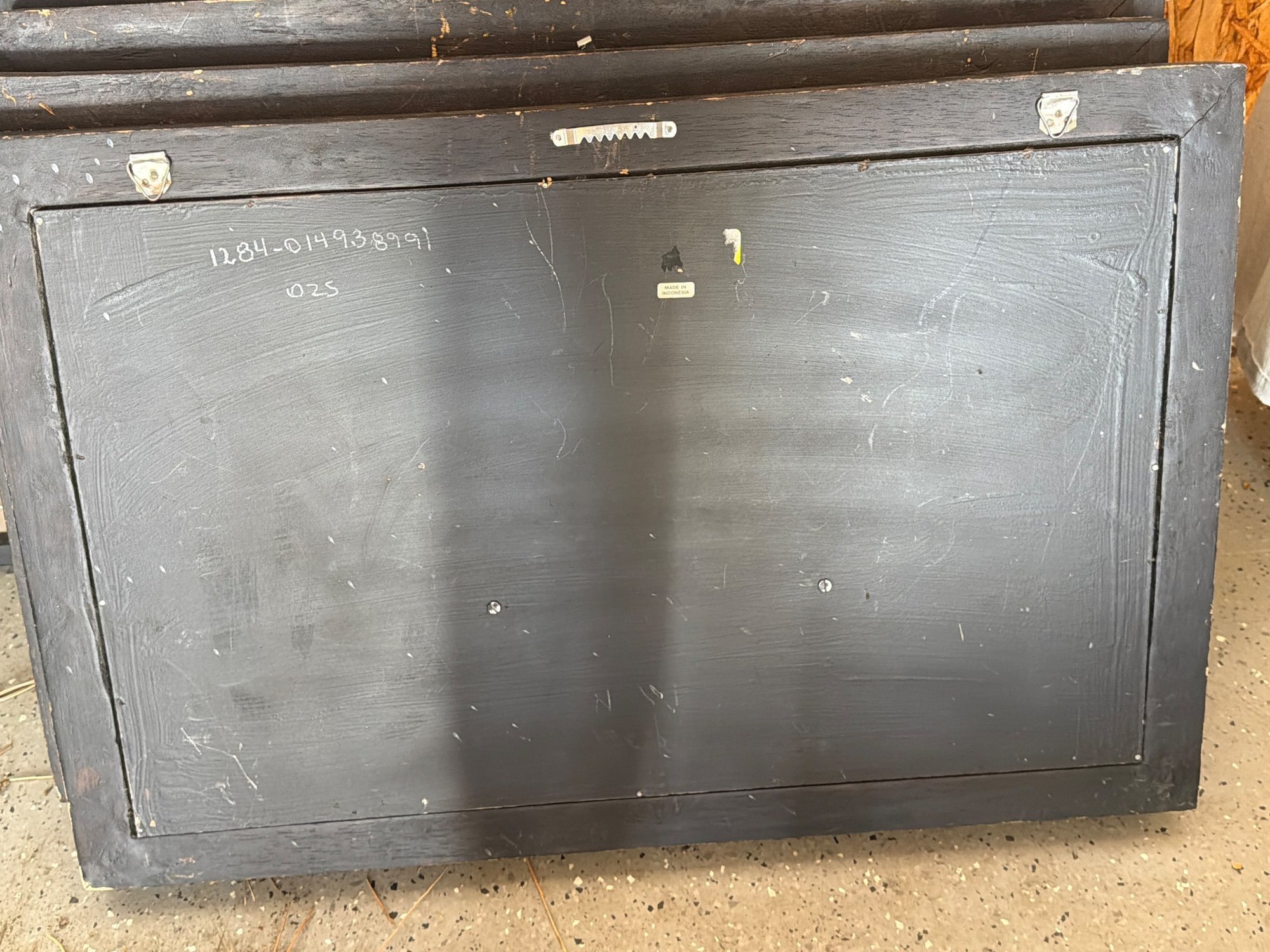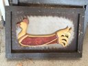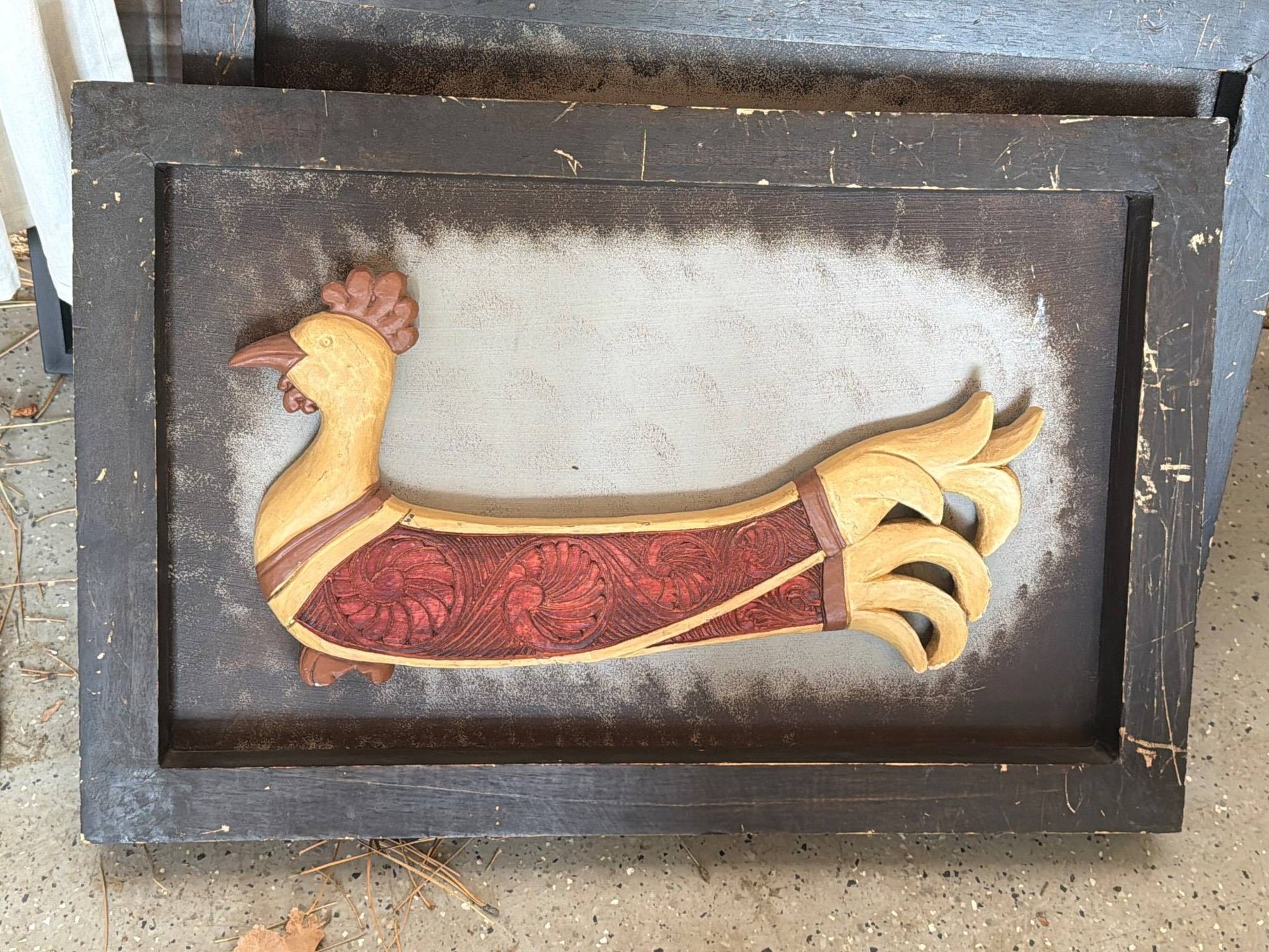 This framed wooden plaque features a carved rooster motif with intricate red patterned detailing along its body. The rooster’s head and tail are painted in complementary shades, adding depth to the piece. The wooden frame is painted black to provide contrast. Two metal hooks at the back make it ready for hanging. Suitable as an art piece or for decoration. Dimensions: Approximately 23 inches wide by 15 inches tall.