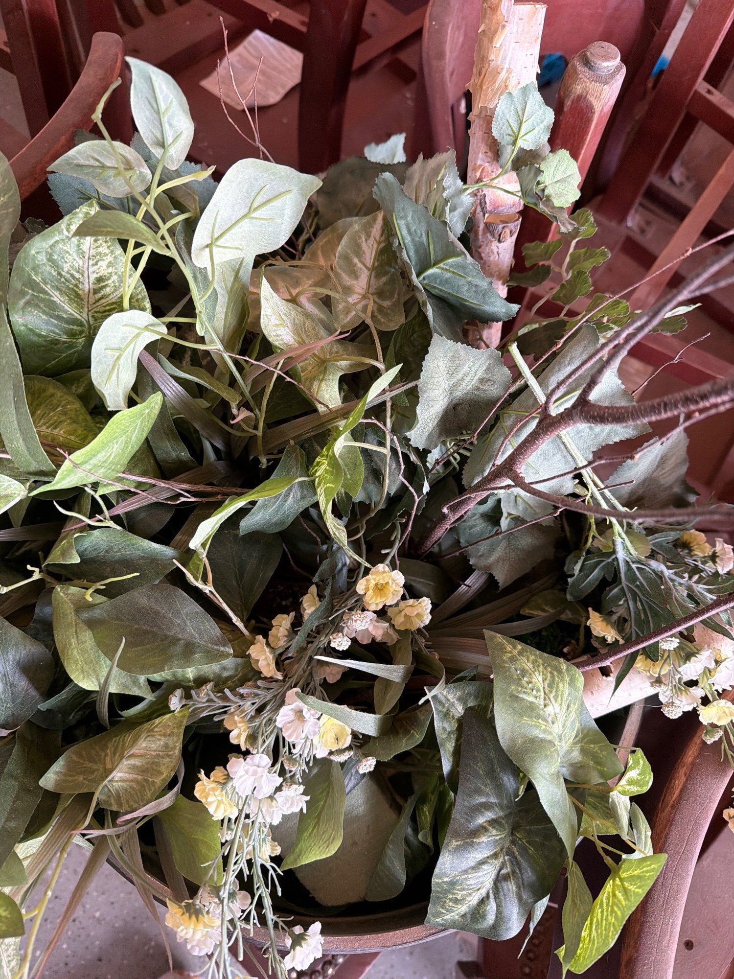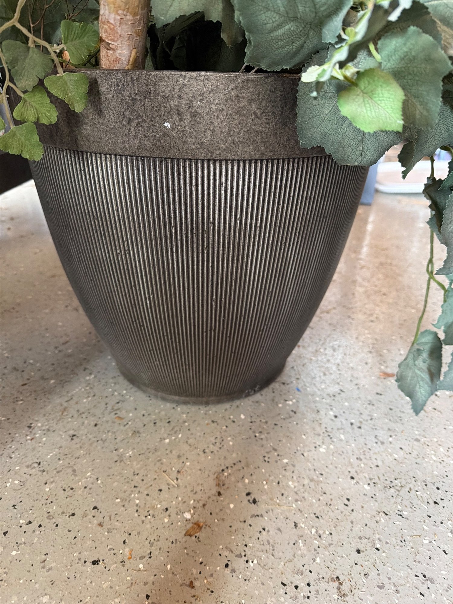 This decorative planter features a ribbed metallic finish and comes filled with an artificial arrangement of green foliage and small white flowers. Designed for indoor settings, the planter adds a touch of greenery in a maintenance-free design. The sturdy container measures approximately 18 inches in height and 15 inches in diameter, making it a practical and visually appealing piece.