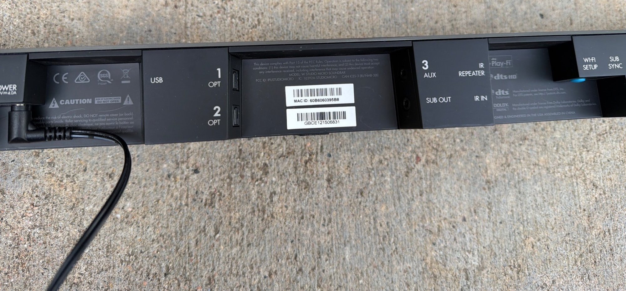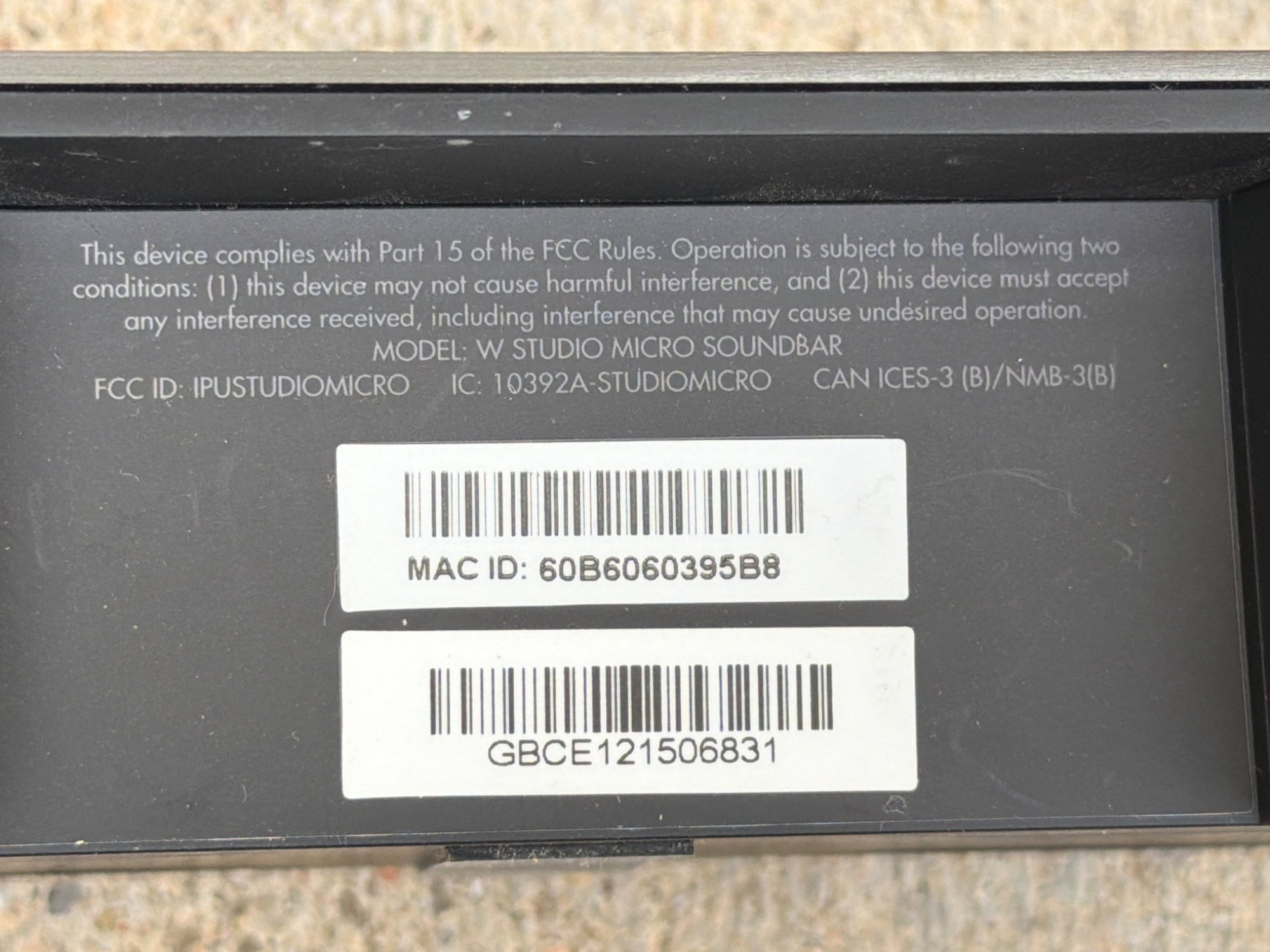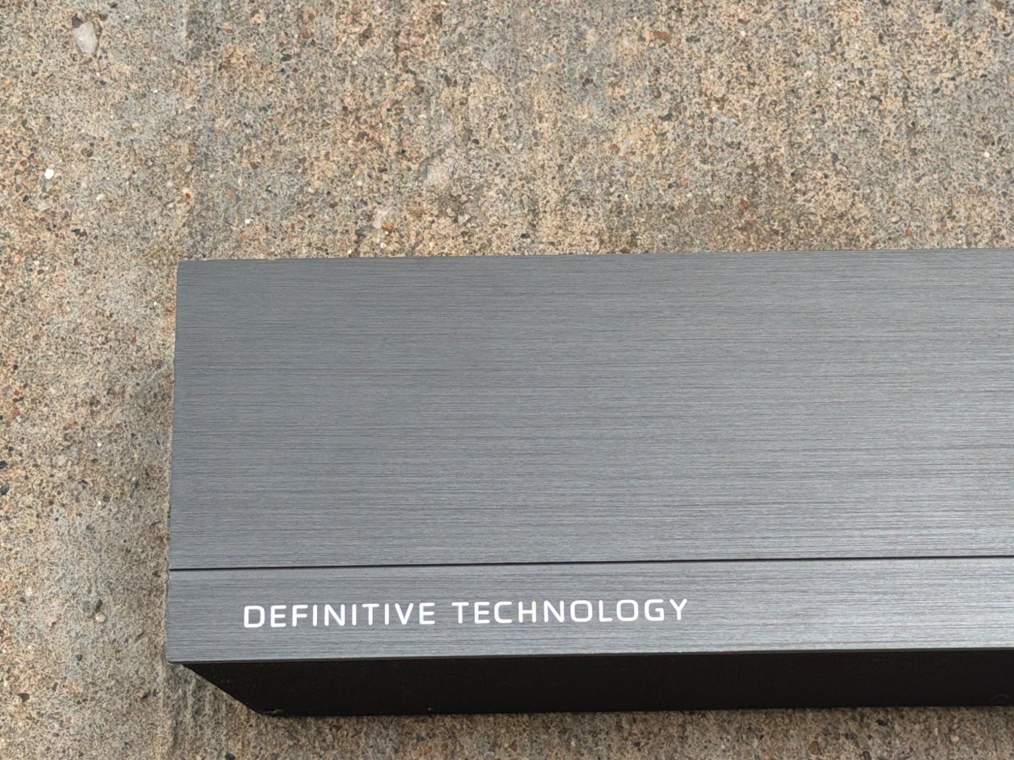 Definitive Technology Studio Micro soundbar in black aluminum finish. Features multiple input options and model details on the reverse. Includes accompanying power adapter. Dimensions: Approximately 35 x 3 x 2 inches.