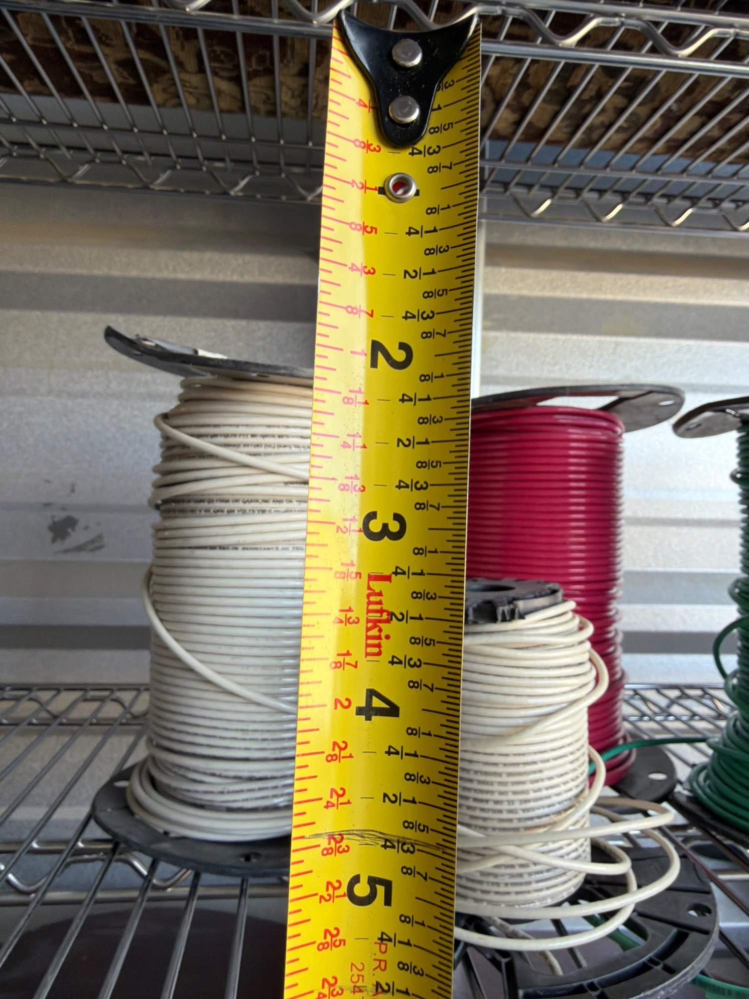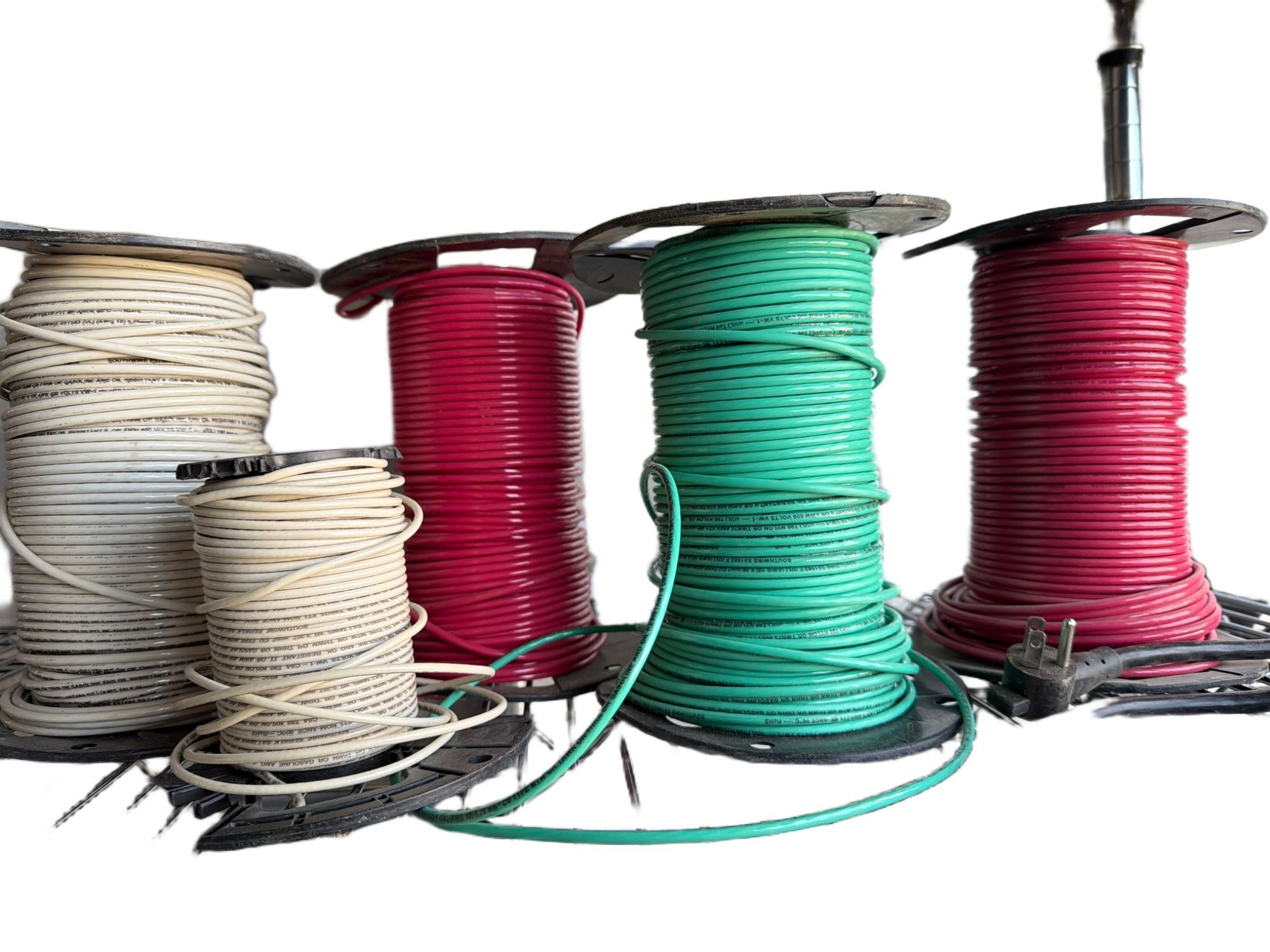 Spools of electrical wire in red, green, and white colors. The wires appear to be wrapped around standard spools, with some partially used. The tallest spools are approximately 4.5 inches in height. Suitable for electrical or wiring purposes.