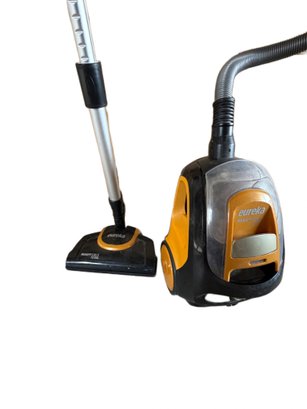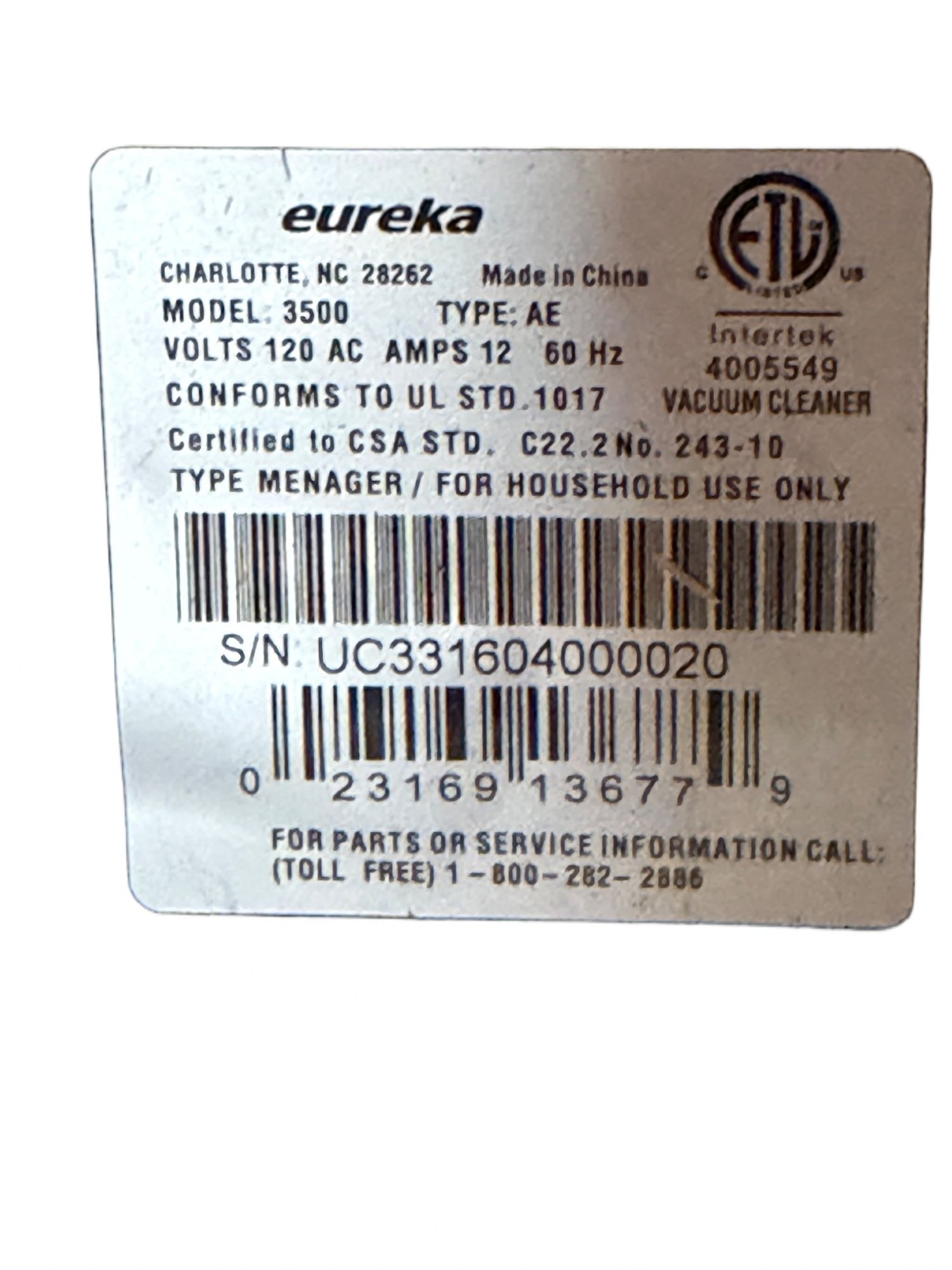 Eureka model 3500 canister vacuum cleaner, serial number UC331604000020. Rated at 120 volts AC, 12 amps, and 60 Hz. Manufactured for household use only and compliant with UL Std. 1017 and CSA Std. C22.2 No. 243-10. Includes a flexible hose, metal handle, and matching floor cleaning head. Made in China and marked AE type. For indoor dry surfaces only. Includes serial label and safety warnings.
