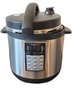 Fagor electric pressure cooker featuring a stainless steel housing and black plastic lid with secure locking mechanism. Includes a digital control panel with multiple buttons for cooking settings such as 'Rice,' 'Beans,' and 'Soup.' The cooker is designed with a pressure valve on the lid for safety. Dimensions: Approximately 13 inches tall and 12 inches in diameter.