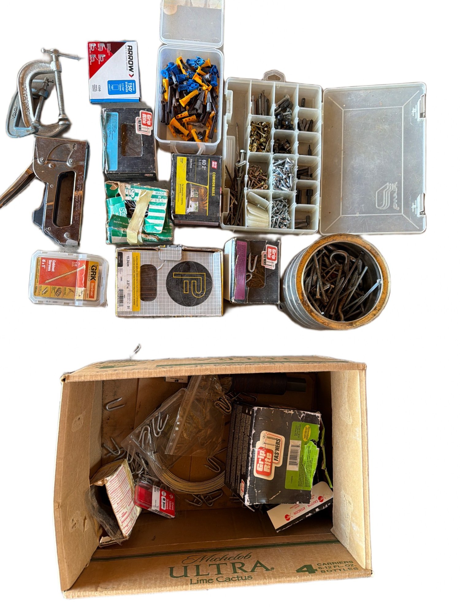 This lot includes a variety of hardware items and tools, including multiple boxes of nails, screws, staples, fasteners, and a stapler. Visual inspection shows contents such as different-sized screws, nails, and staples organized in compartments, along with miscellaneous hardware components and tools stored in a cardboard box and plastic containers. No specific model numbers are visible.
