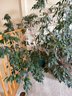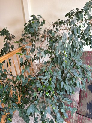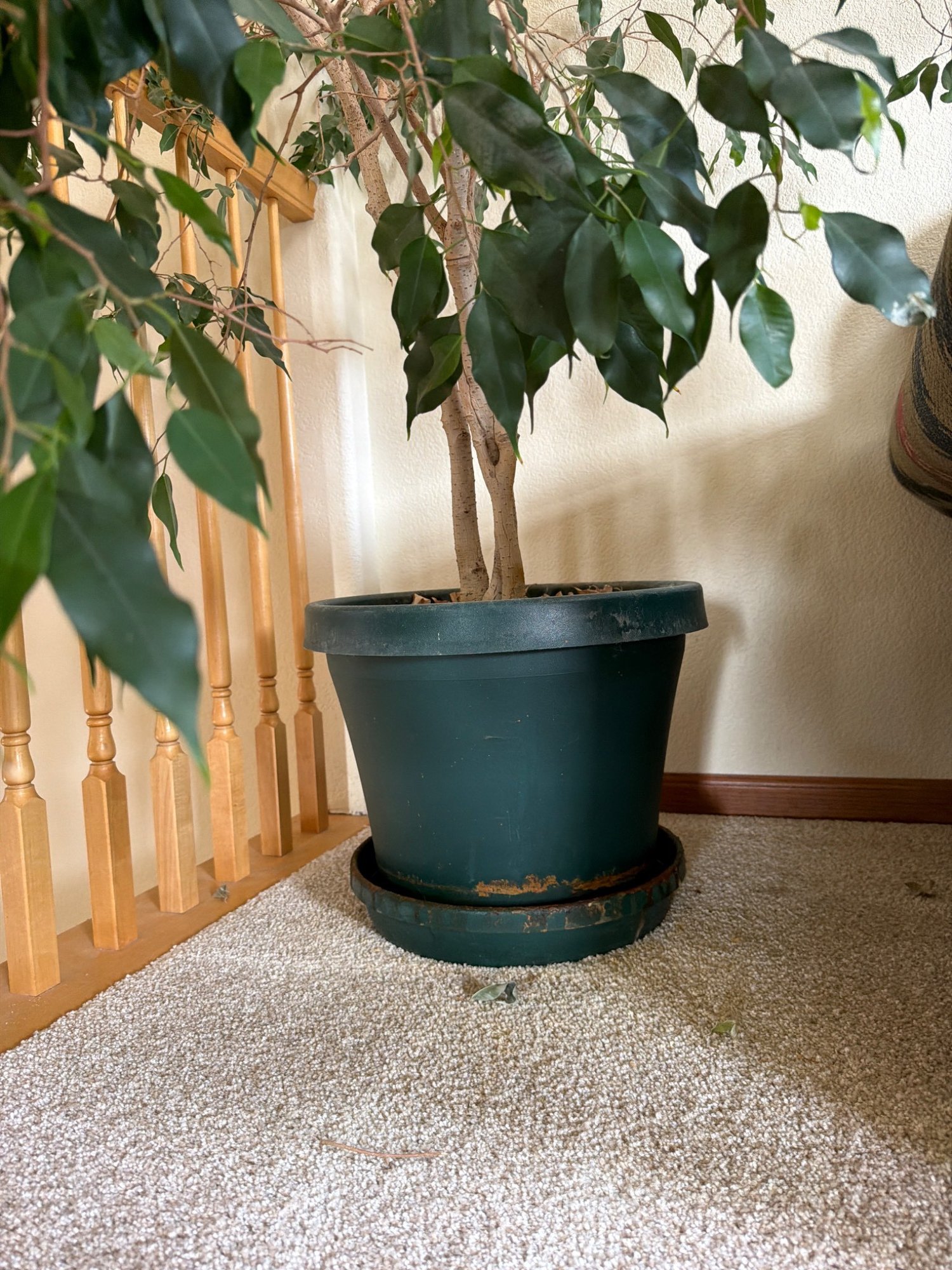 Large Ficus Benjamina plant in a dark green plastic planter with matching tray. The tree features abundant foliage and appears to be well-developed. The pot measures approximately 16 inches in diameter and about 14 inches in height. Overall height of the plant and planter together is estimated at approximately 5 feet.