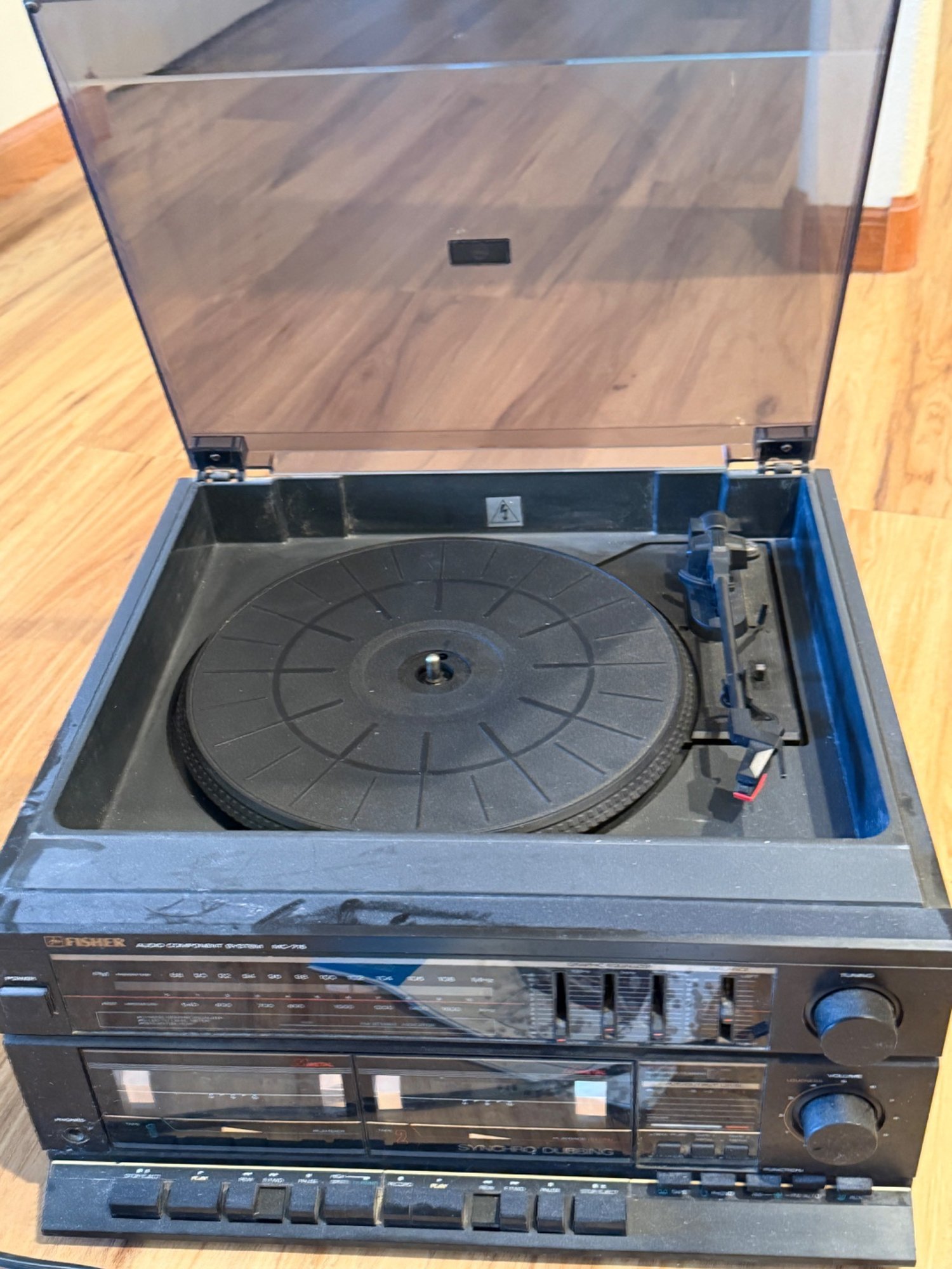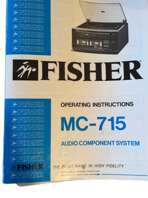 Fisher MC-715 Audio Component System includes a turntable, dual cassette recorder, AM/FM radio, and equalizer. Features an approximate dimension of 14 x 14 x 8 inches. Comes with original operating instructions. Fully integrated unit for diverse audio playback. Manufacturer: Fisher; Model: MC-715.