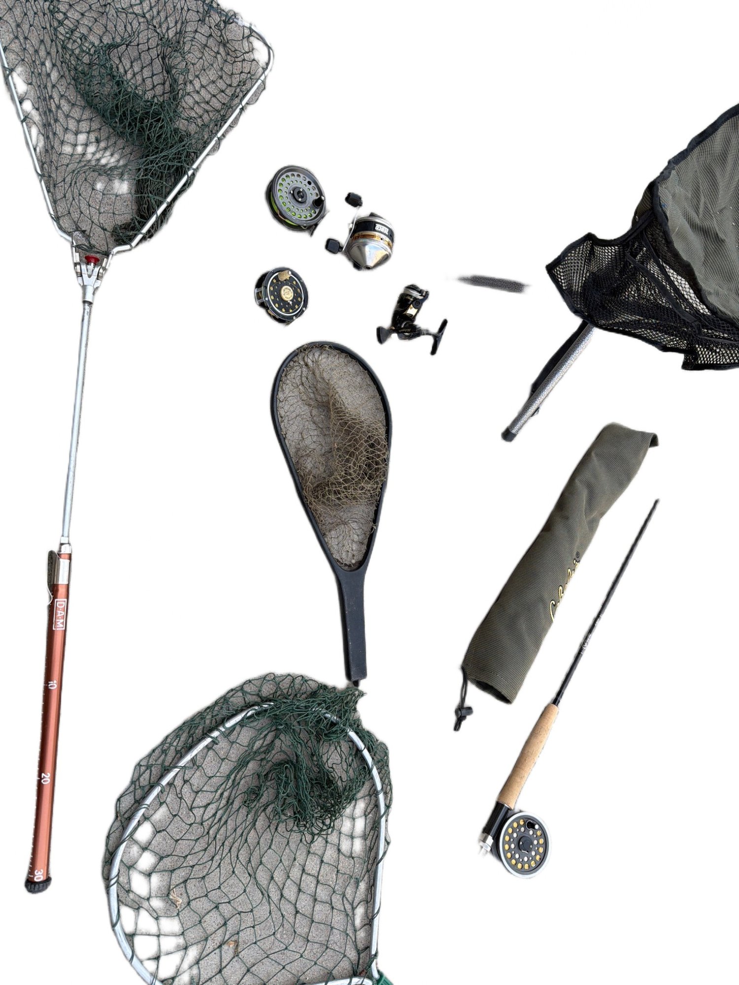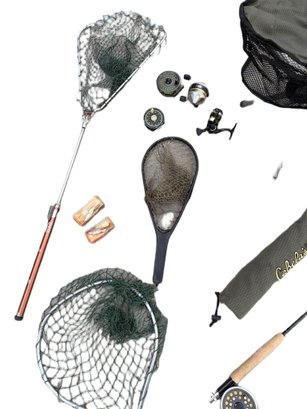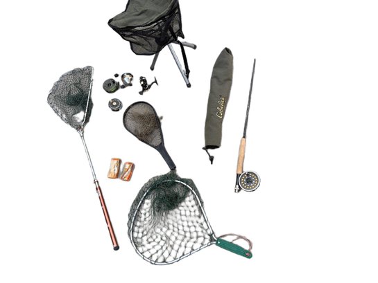 A variety of fishing equipment, such as a fishing chair, multiple fishing nets with different handle types, a combination of fly and spinning reels, assorted tackle
