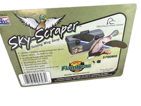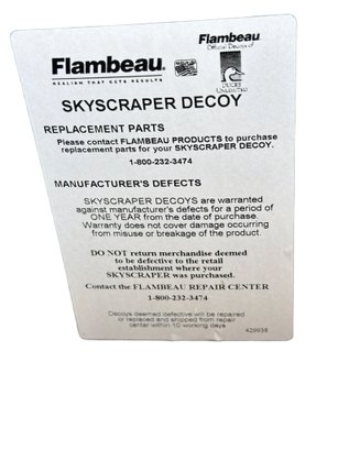 This lot includes a Flambeau Outdoors Sky Scraper Rotating Wing Decoy, model number 5700MO. The set comes with its original storage container and accompanying accessories as shown. The item appears to include replacement parts and manufacturer’s defect warranty information. Please see pictures for everything included. Condition of all components is unverified and sold as-is.