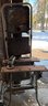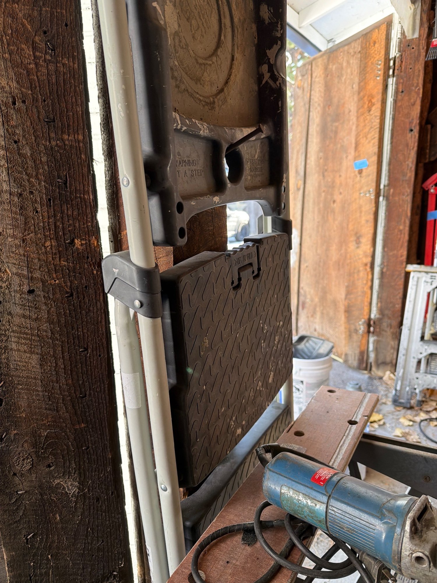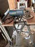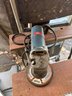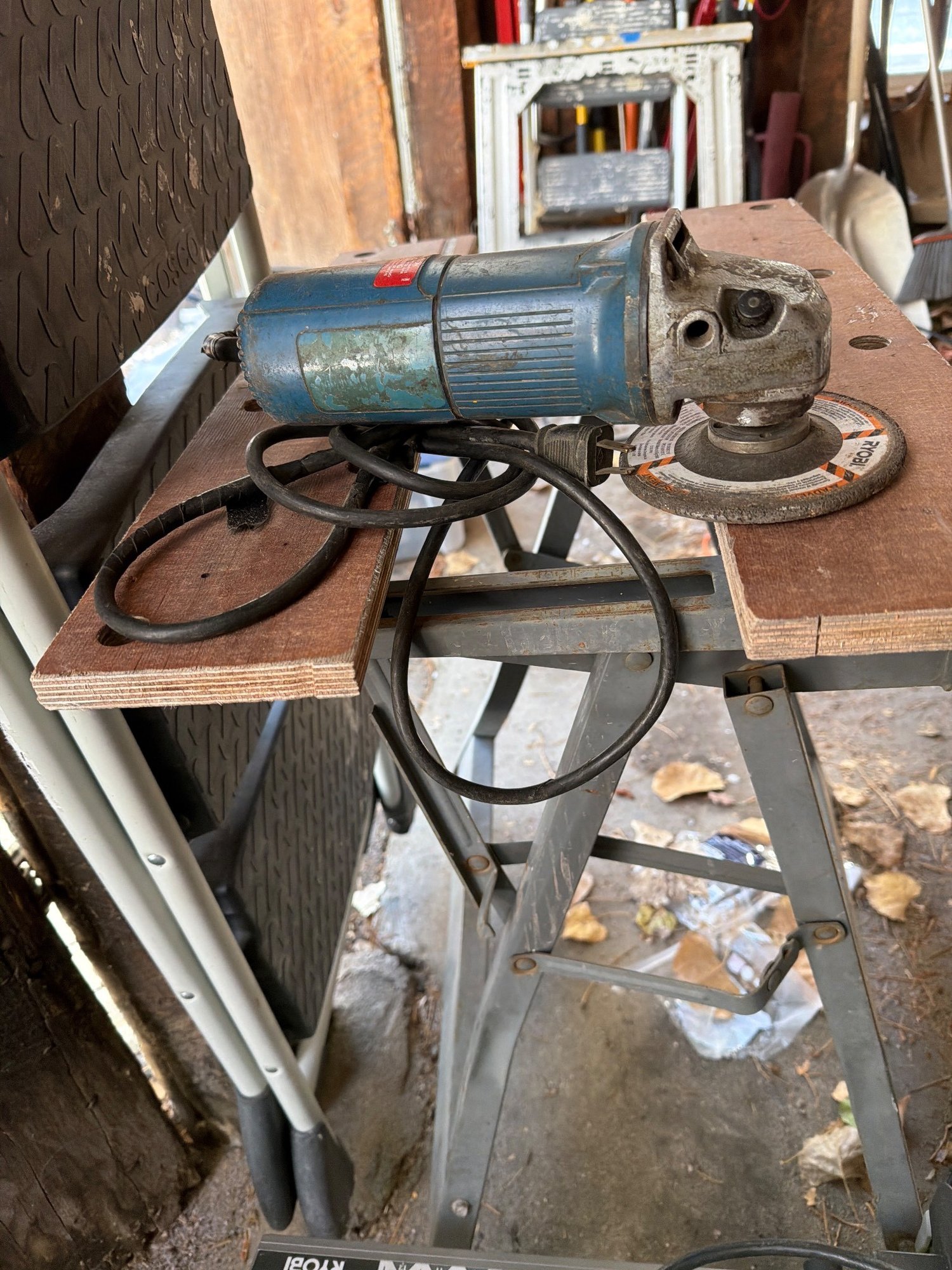 Metal and plastic folding workbench with integrated clamping system and work surface. Includes a Ryobi angle grinder, model not specified, with visible wear from use. The workbench shows rust and wear, consistent with prior use, and the angle grinder operates with a power cord. Dimensions of the workbench: approximately 36 inches high, 24 inches wide, and 20 inches deep.