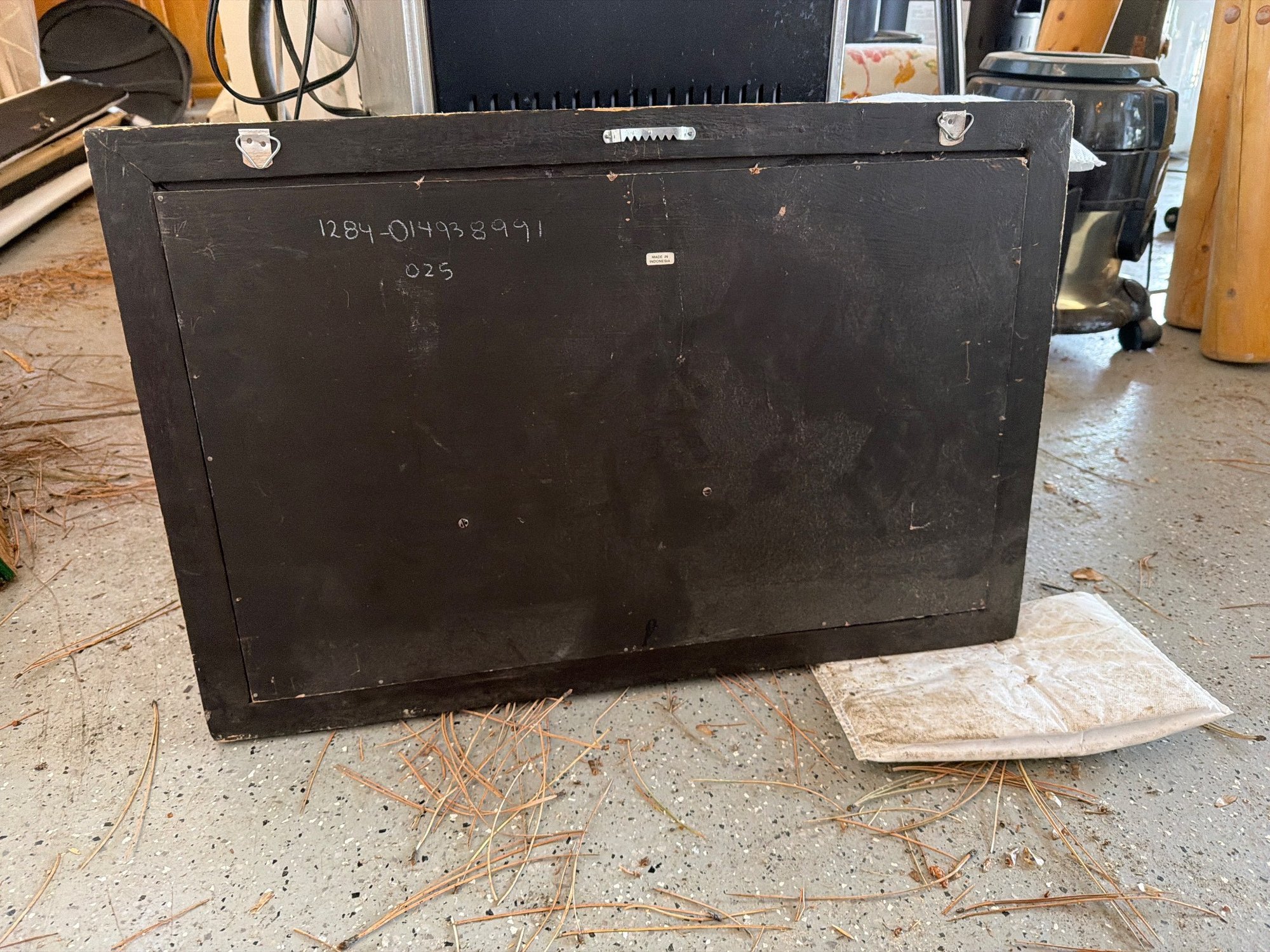 This item is a handcrafted folk art wooden rooster design set within a rectangular wood frame. The rooster is intricately carved and painted with colors emphasizing its features. The frame is painted black and features mounting hardware on the back for wall display. There are identifiable markings on the back, including numerical inscriptions. Dimensions: approximately 23 in. wide, 15 in. tall, and 1.5 in. deep.